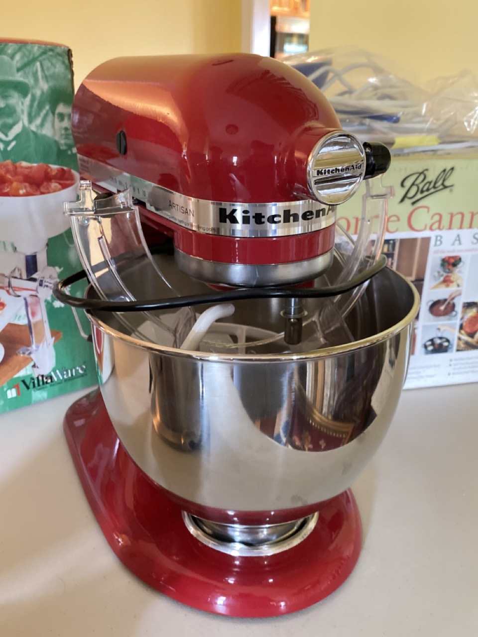 A grouping of kitchen appliances including Cuisinart ice cream maker Model ICE-21, Creville juicer, Kitchen Aid Artisan mixer and Canning supplies, sauce maker..