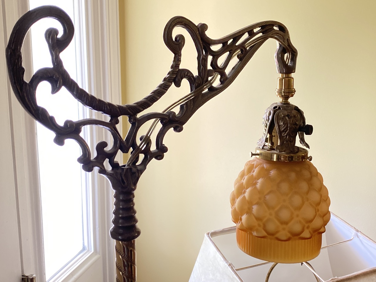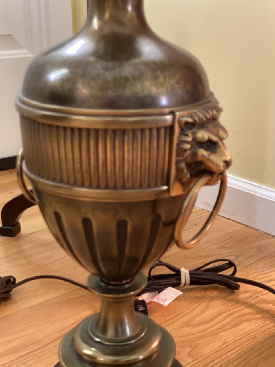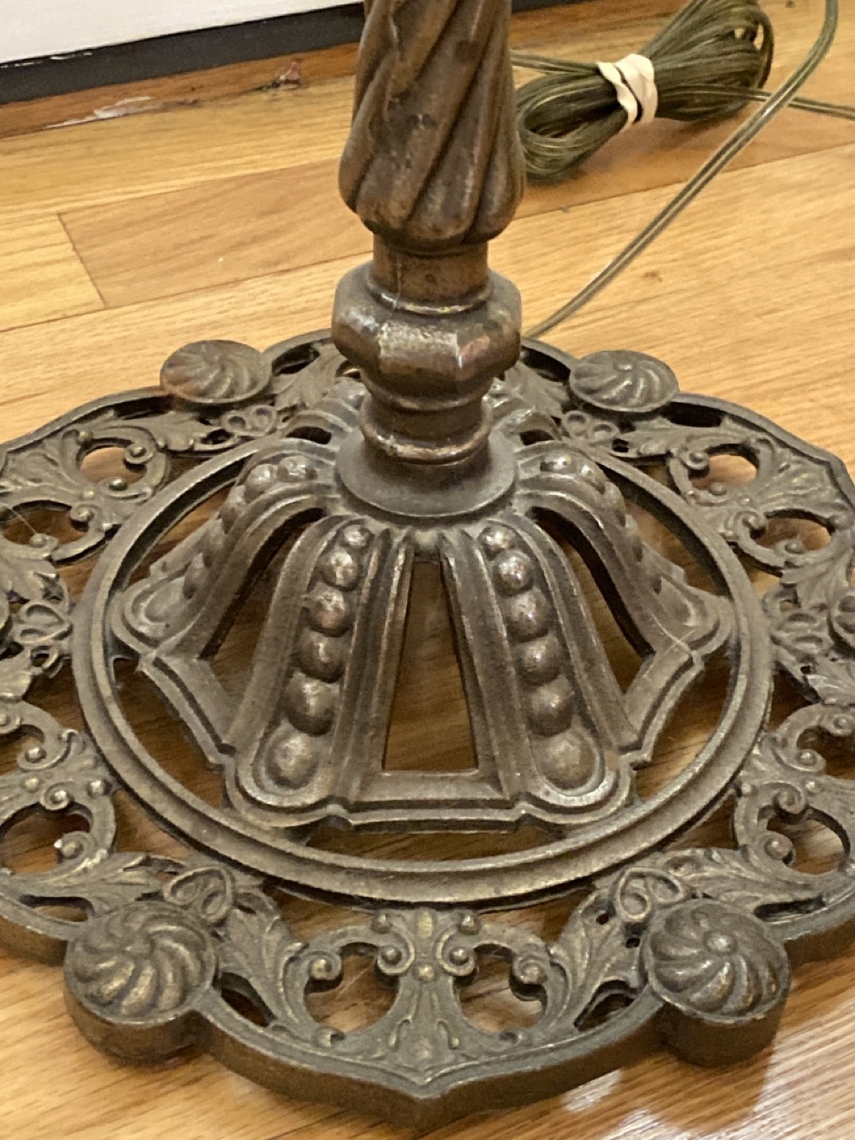 A group of lighting including antique wrought iron floor lamp, elephant, brass lamp with lion head pulls and small mahogany tilt top table.