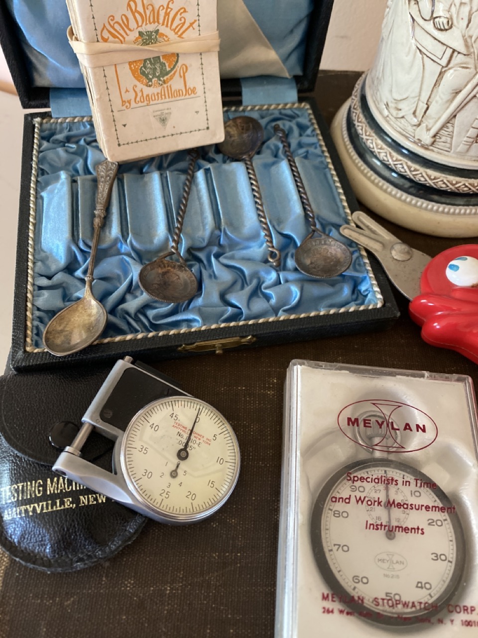 Curiosity lot Funk and Wagnalls dictionary 800 silver spoons miniature children’s books machinist gauge any YLAN stopwatch edge kiss trimmers Stein Victorian parlor print