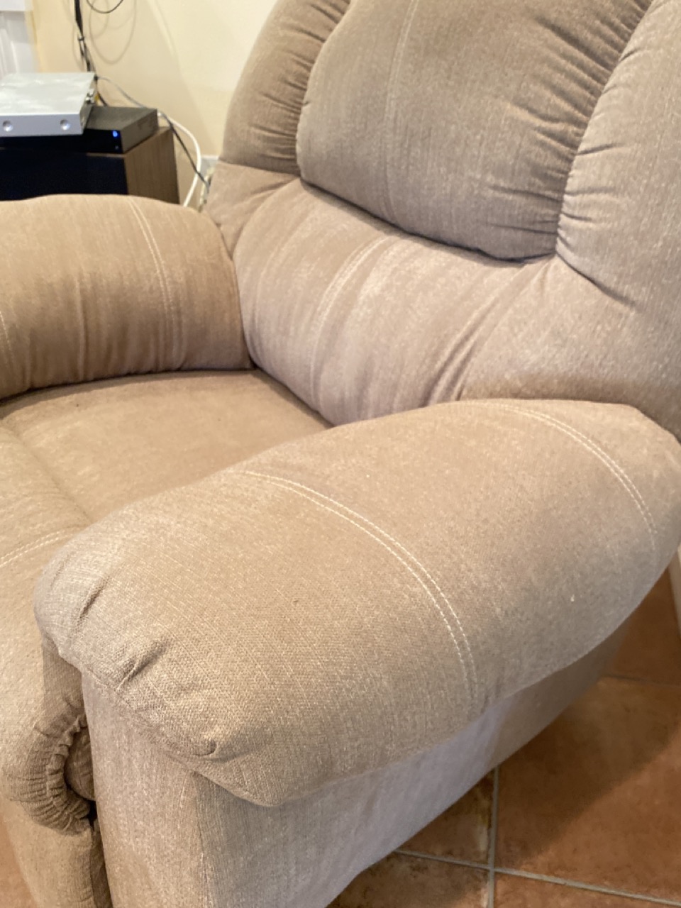 Upholstered recliner. Purchased within last two years. Owner believes it is Ashley.