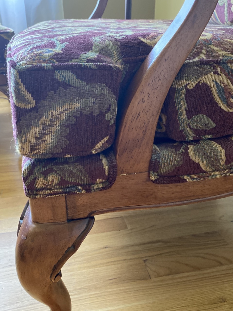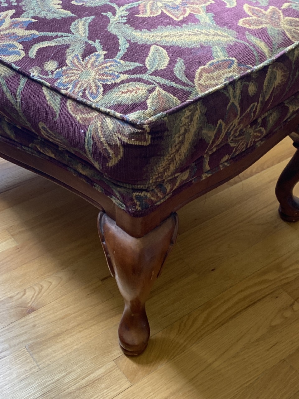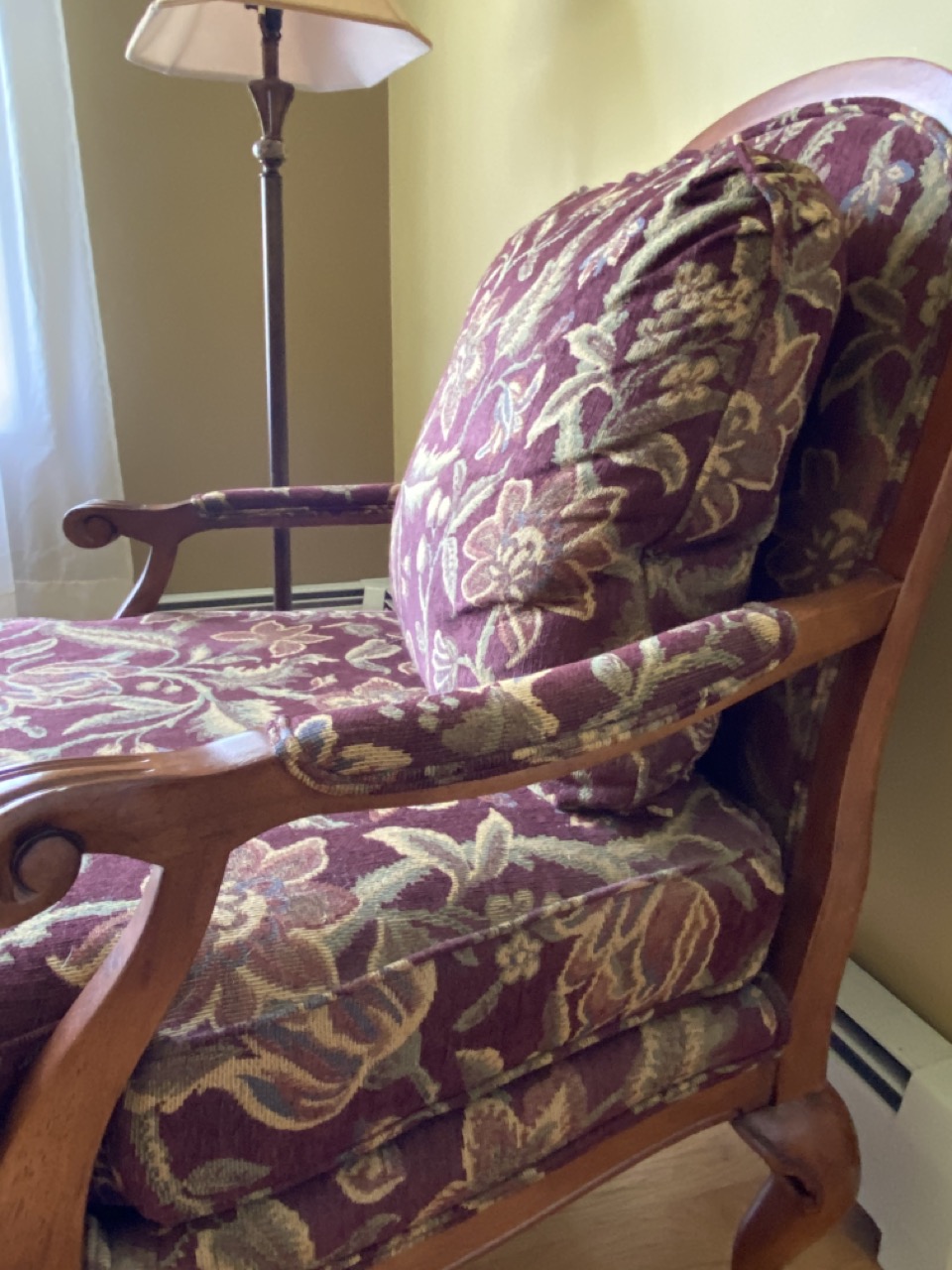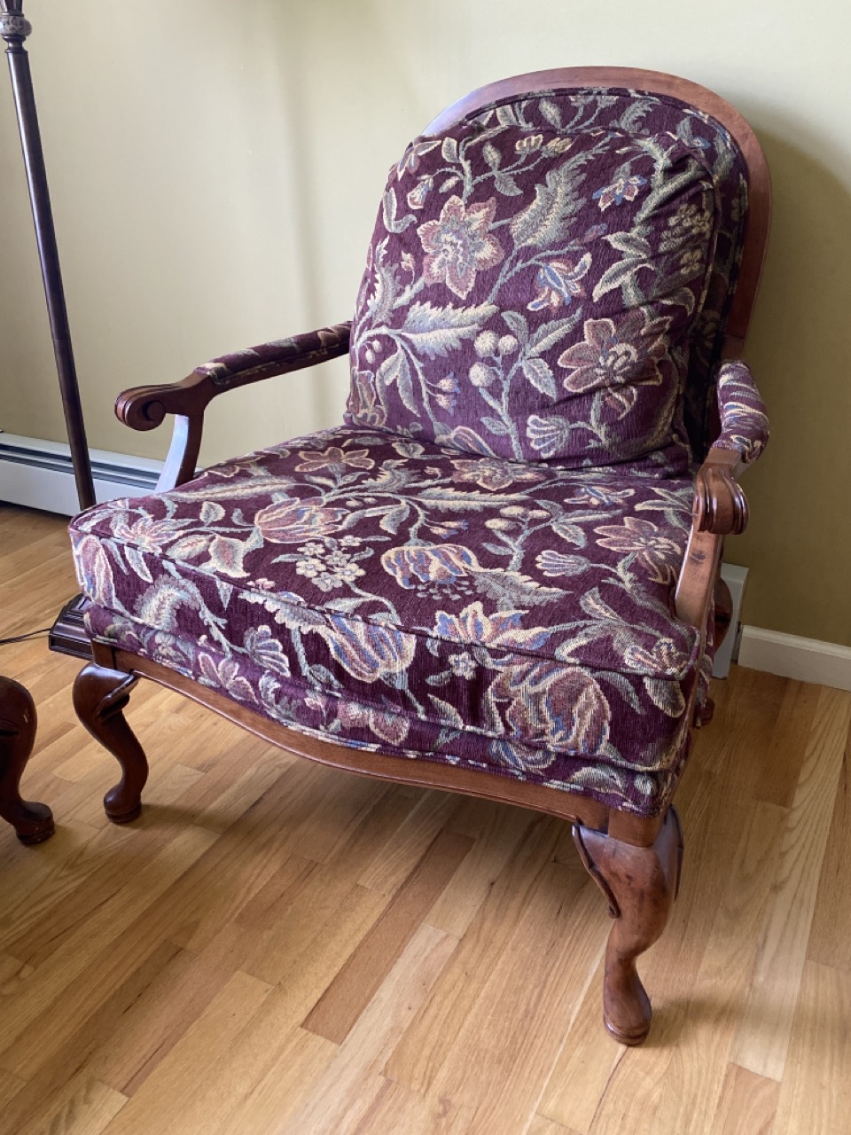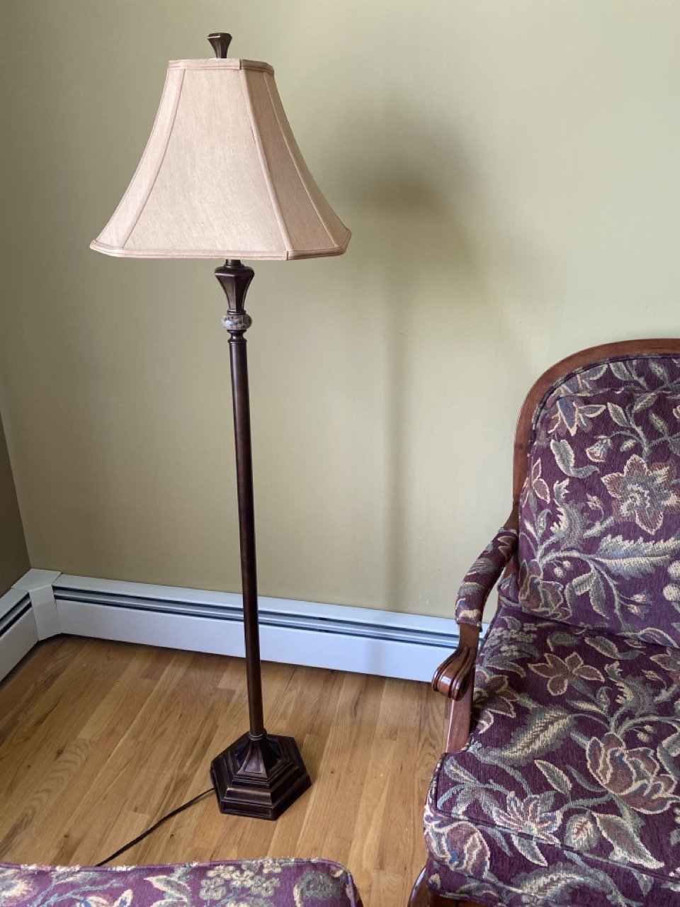 An uphokstered oversized arm chair with ottoman and floor lamp