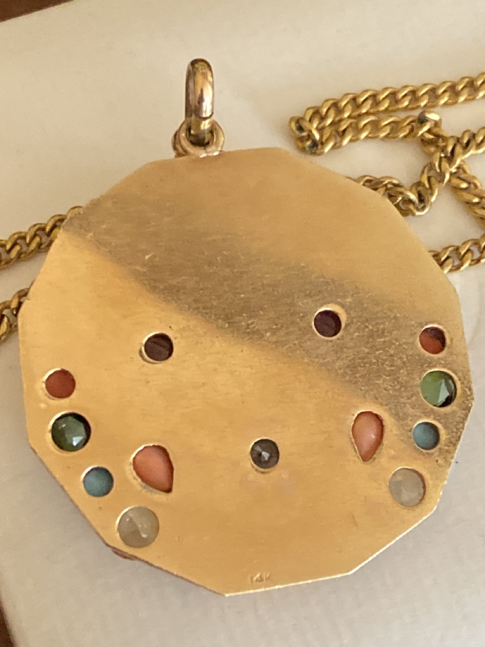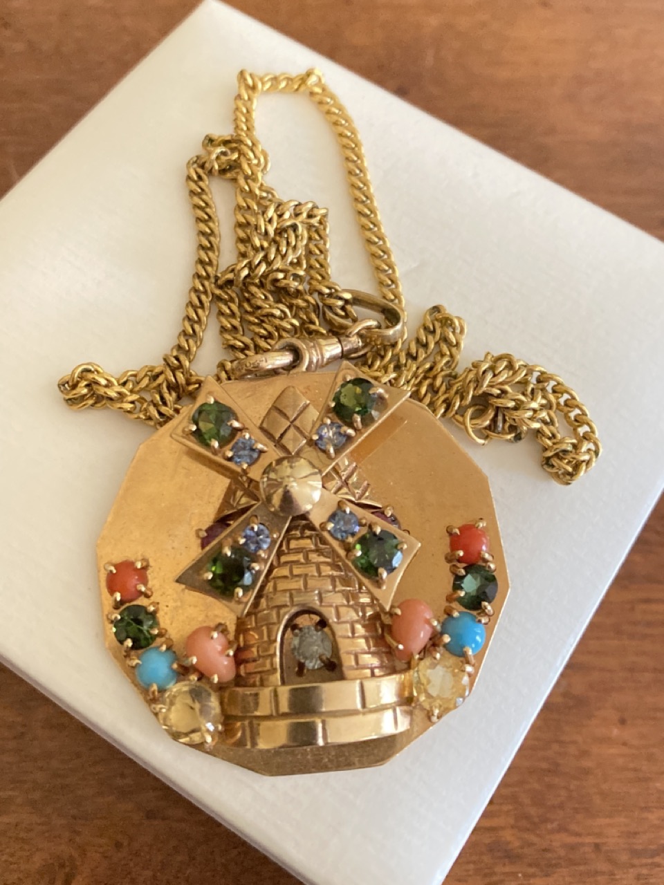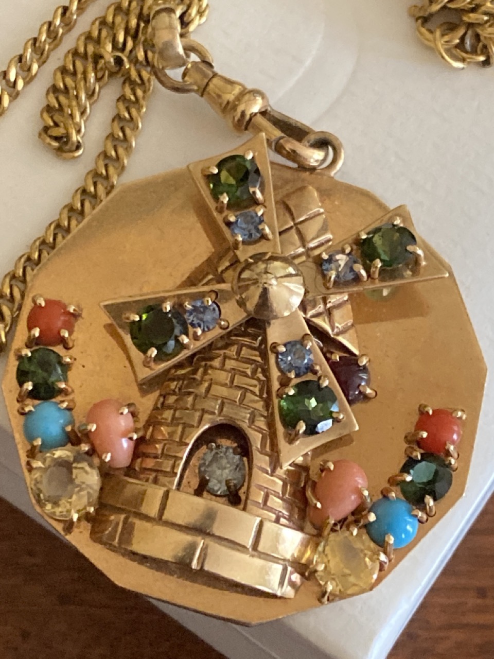 14k y.g. gemstone charm pendant with windmill. 1 1.2" diameter. Chain not marked or tested. Pendant stamped 14k.