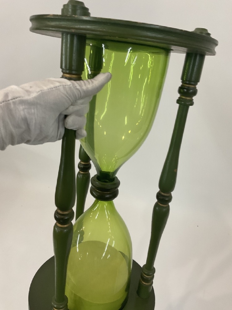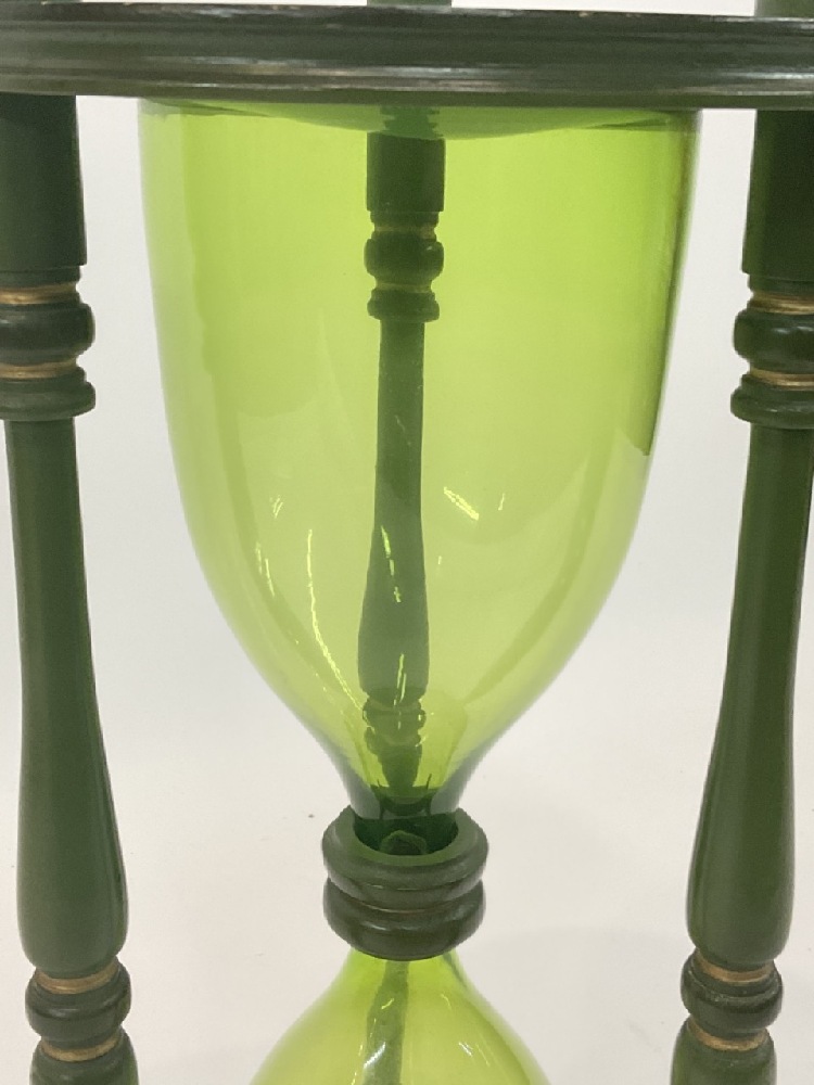 Large Hour Glass. Wooden and green blenko glass. Mid 20th century.