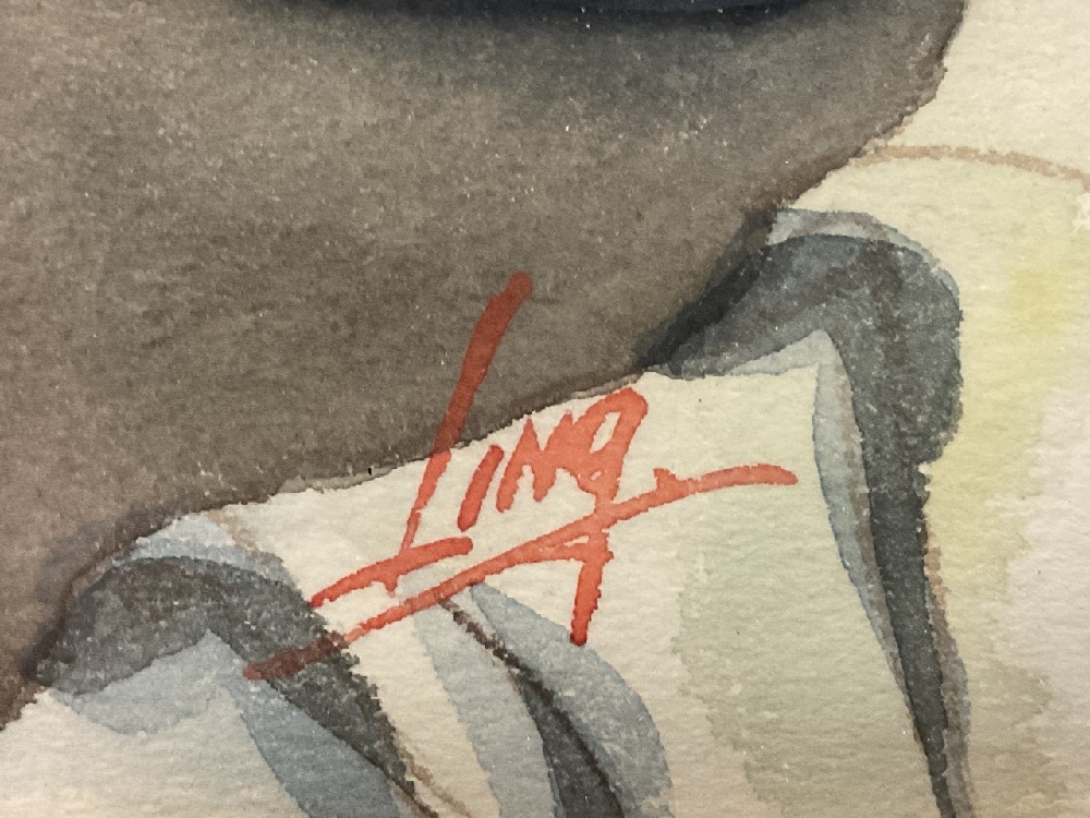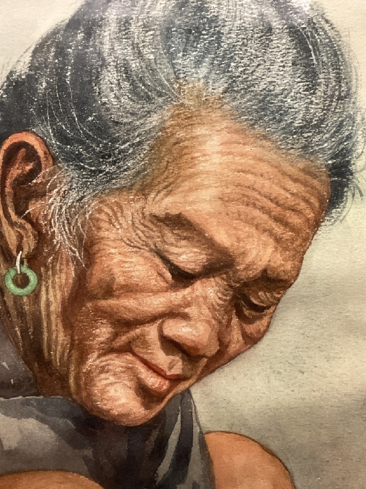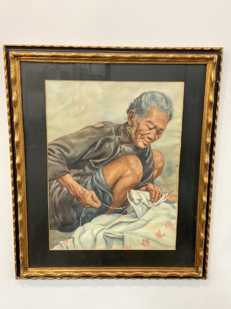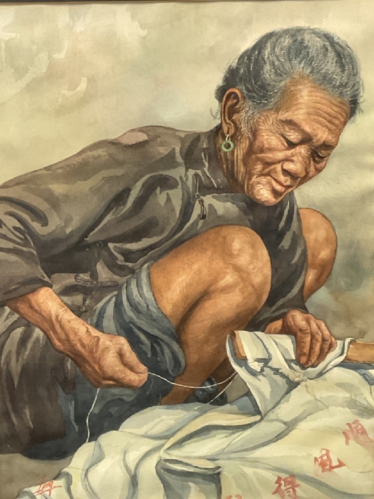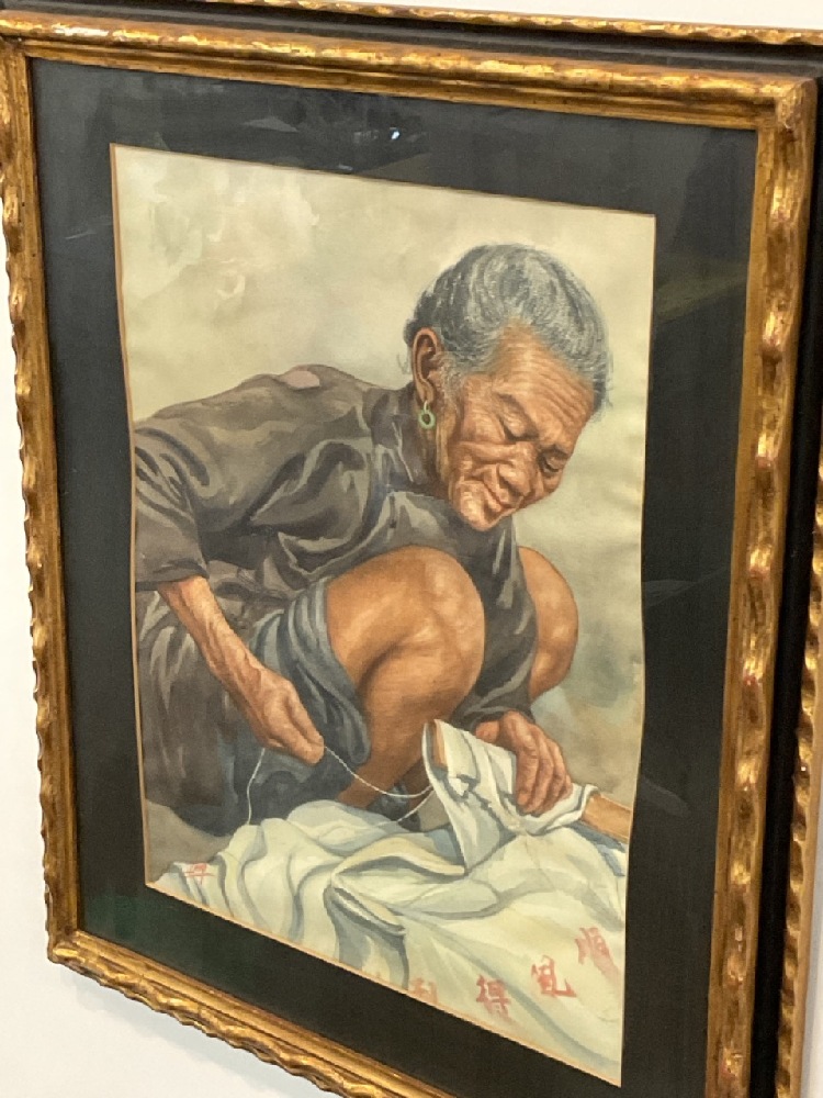 Signed "Ling" Watercolor on paper "Women Stitching Cloth" Dimensions: 19" X 14 1/4" and 27" X 23"