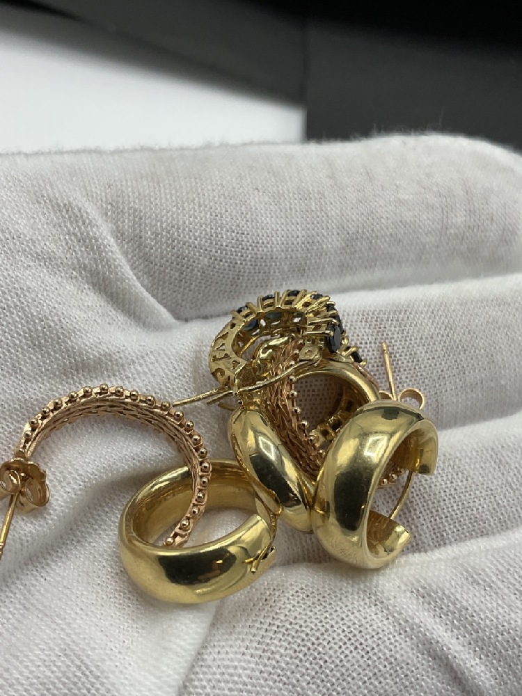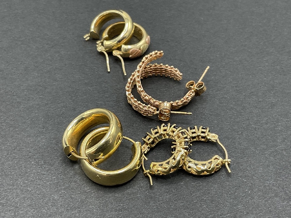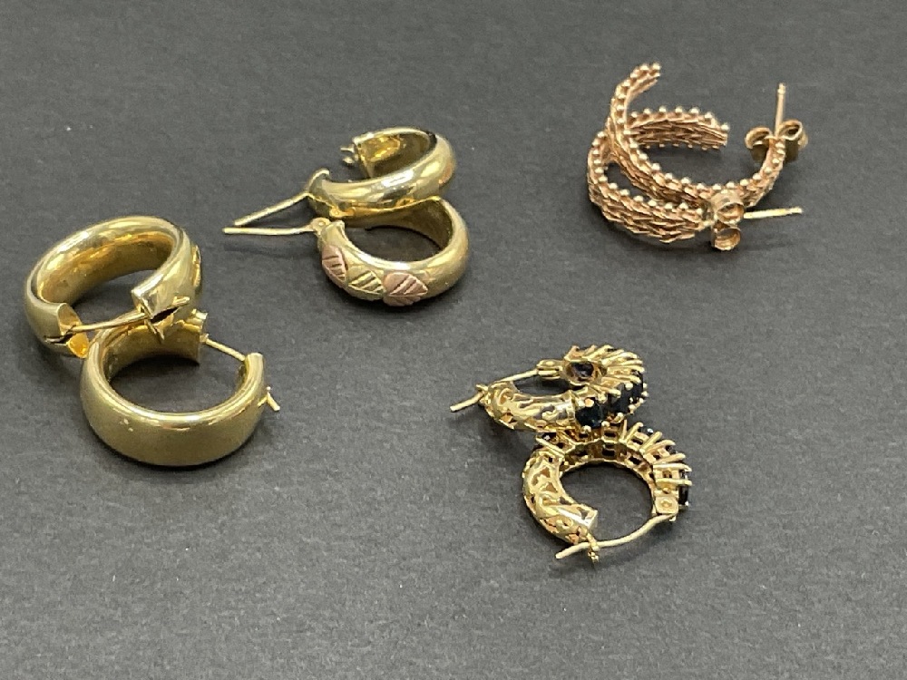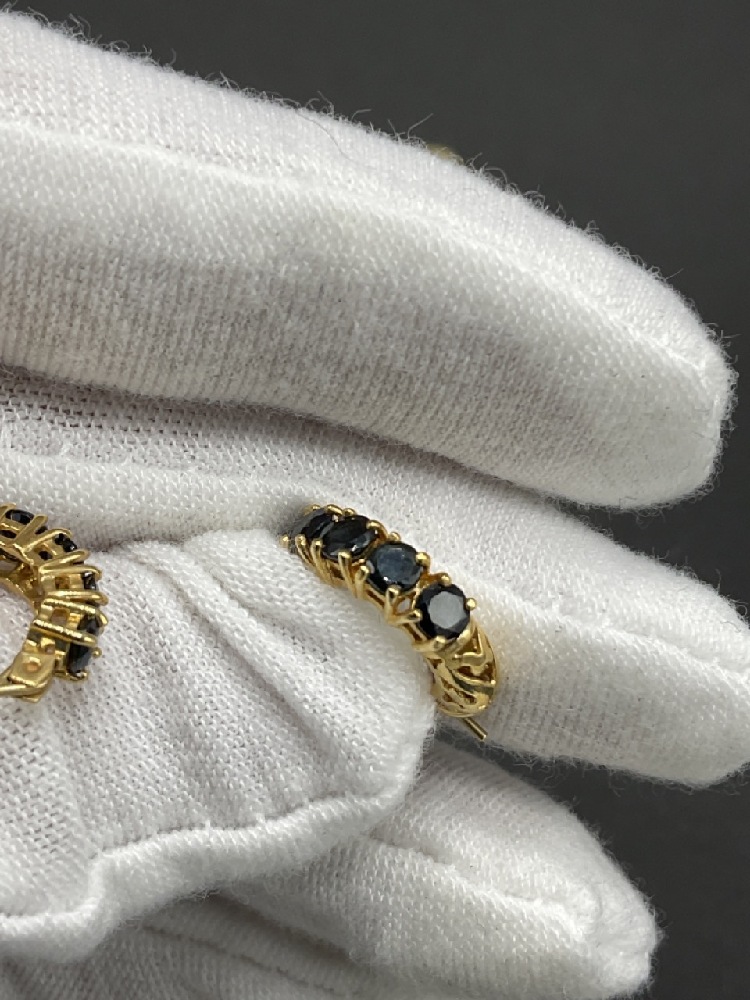 Four (4) Pairs, 14K yellow gold earrings. Sapphire blue stones.