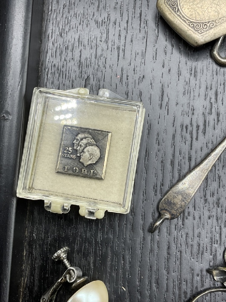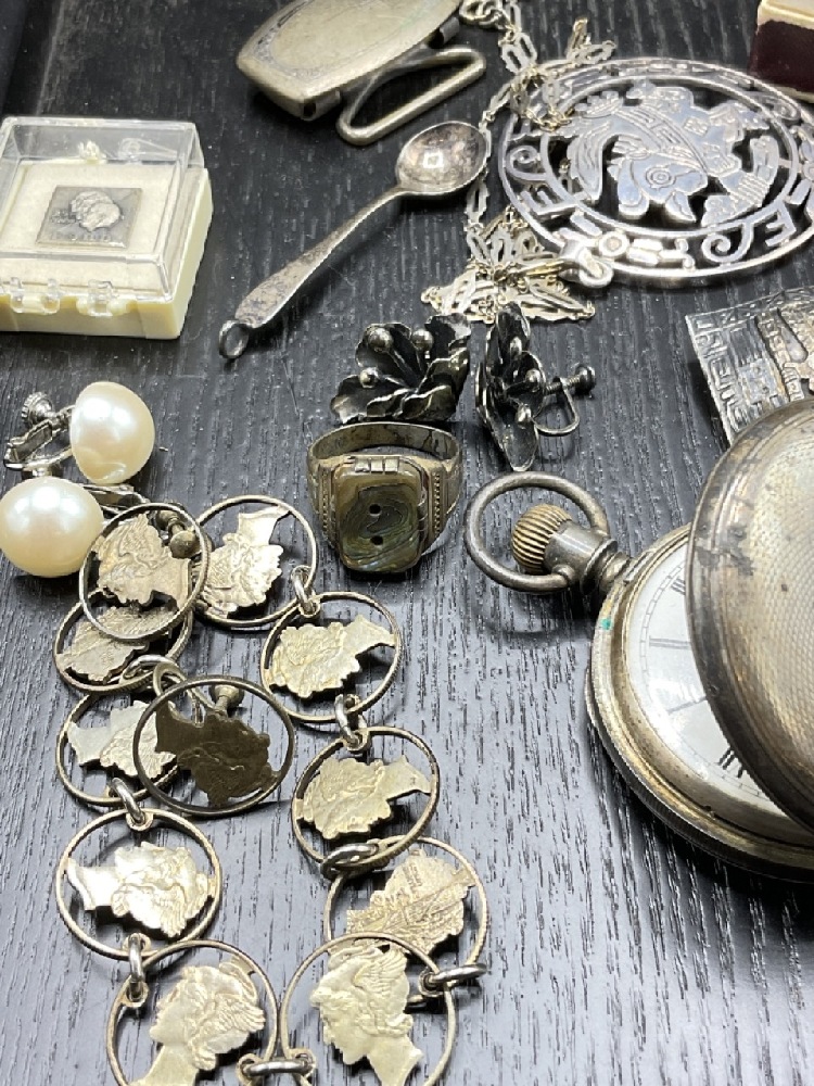 Assorted estate found sterling silver jewelry group. Silver Pocket watch.