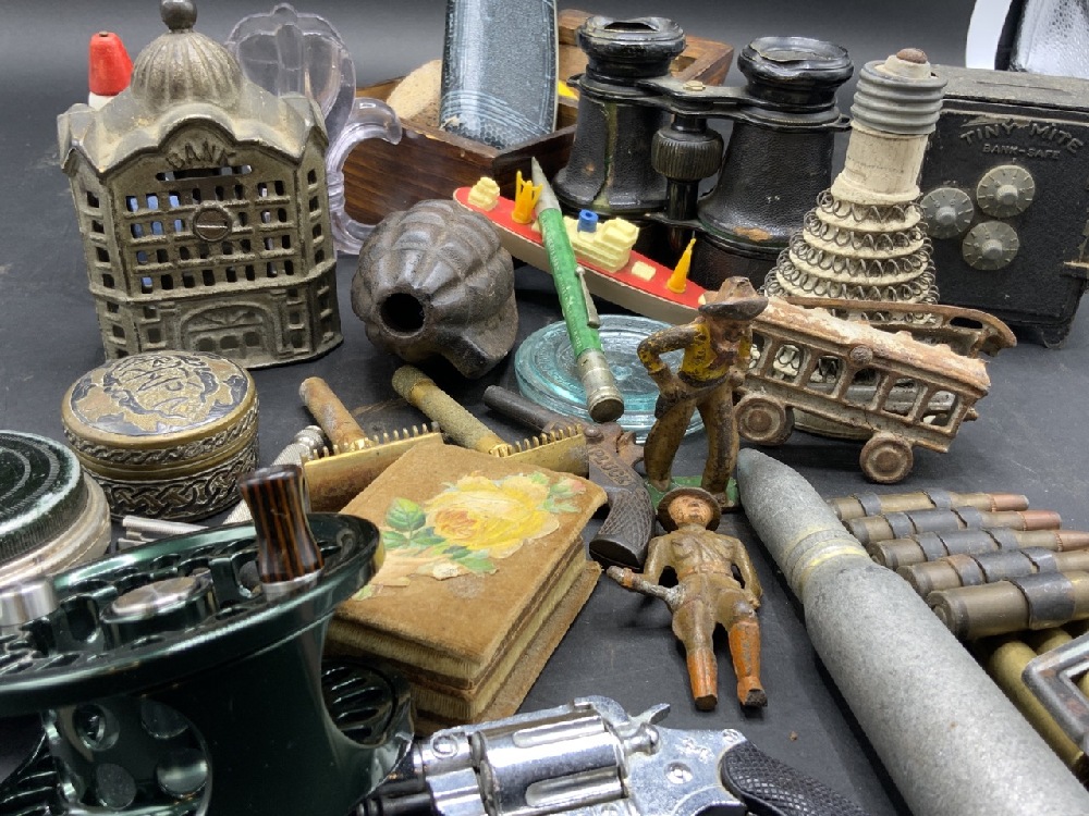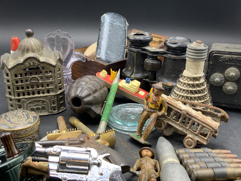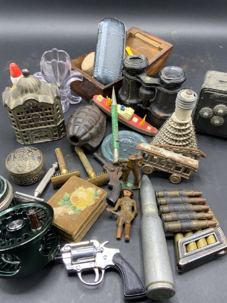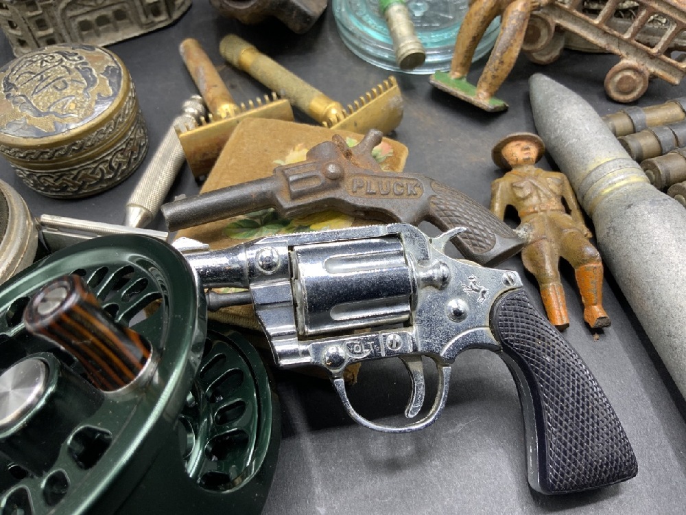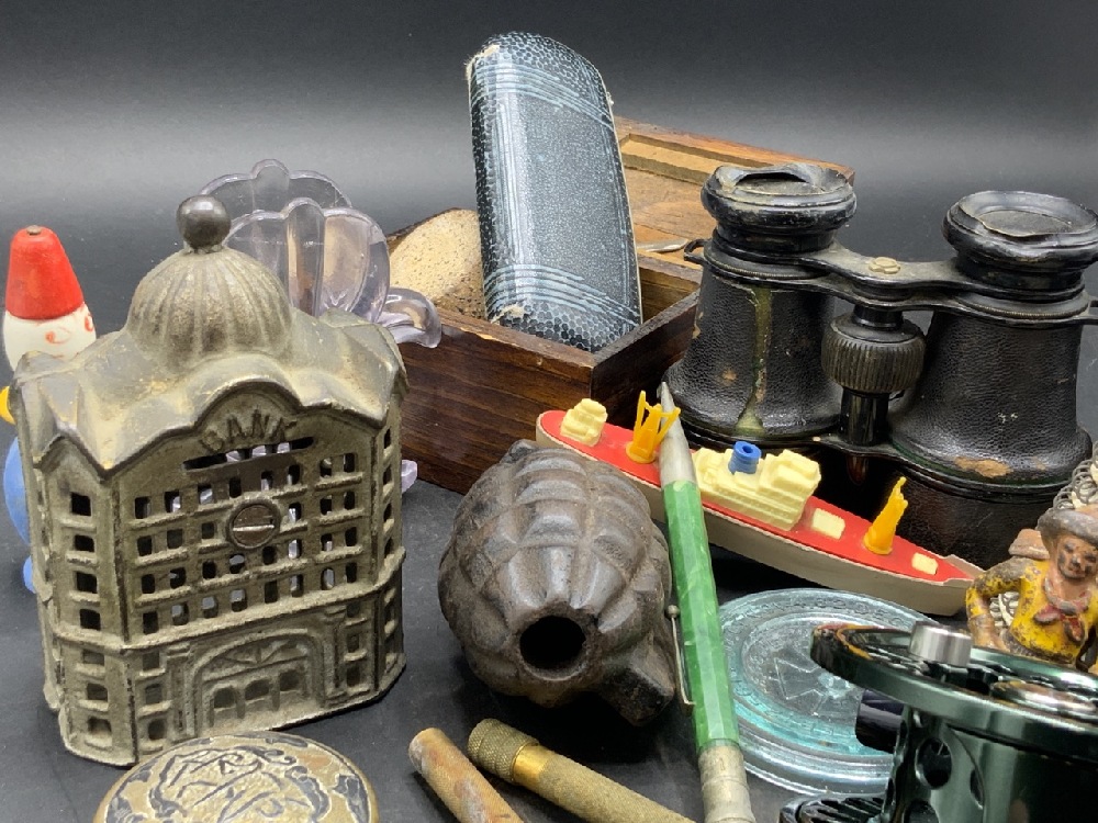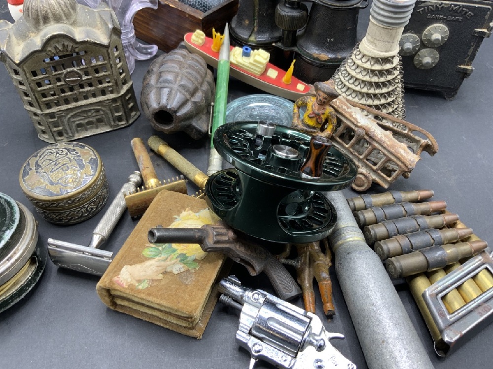 Assorted curious lot and vintage related. Cast iron still banks, lead soldiers, fishing reels, fleur de lis vase etc.