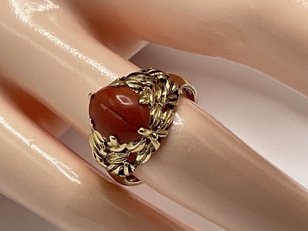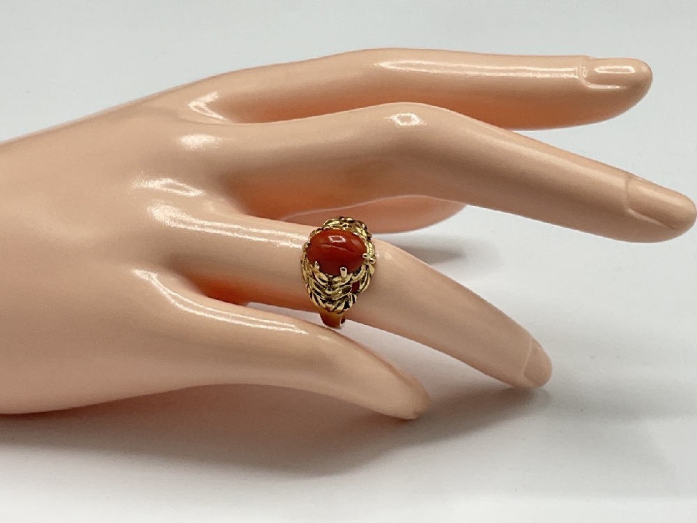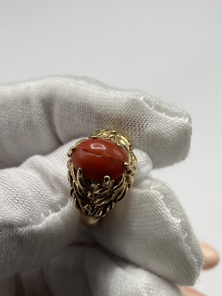 14K Gold Coral Stone Ring.