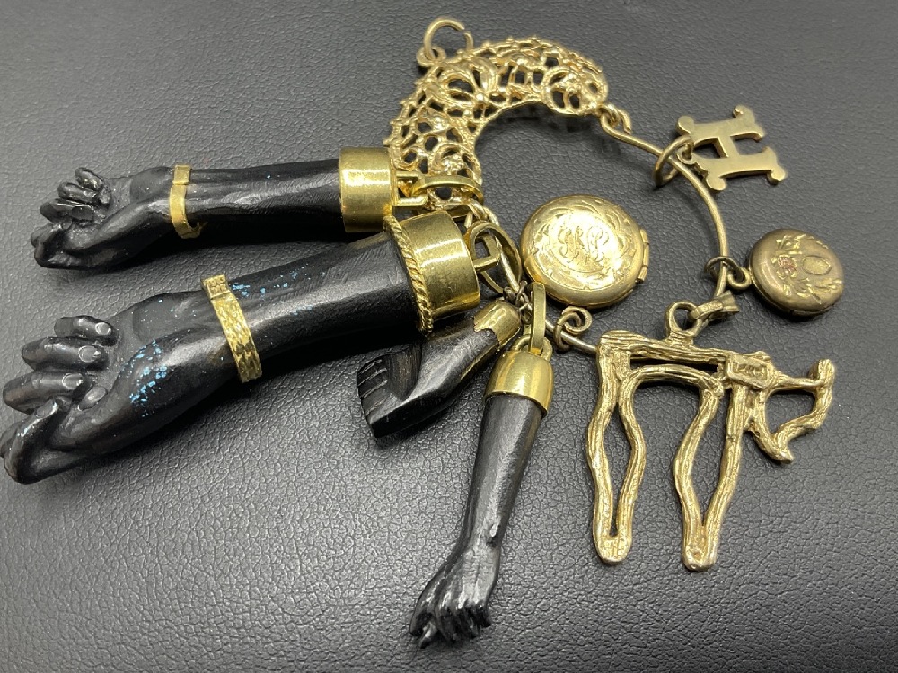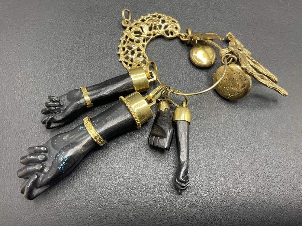 Four (4) Blackamoor ebonized hand charm pendants with 18k gold. Gold lockets, one not gold and bail.