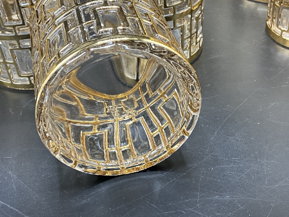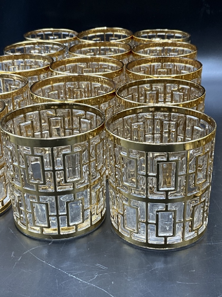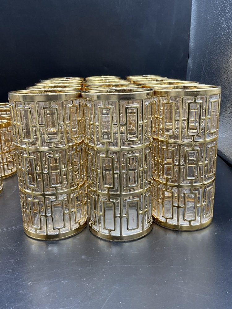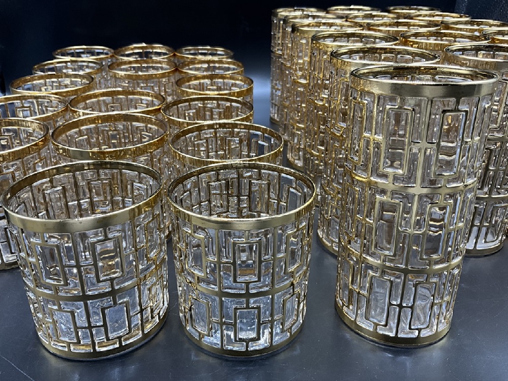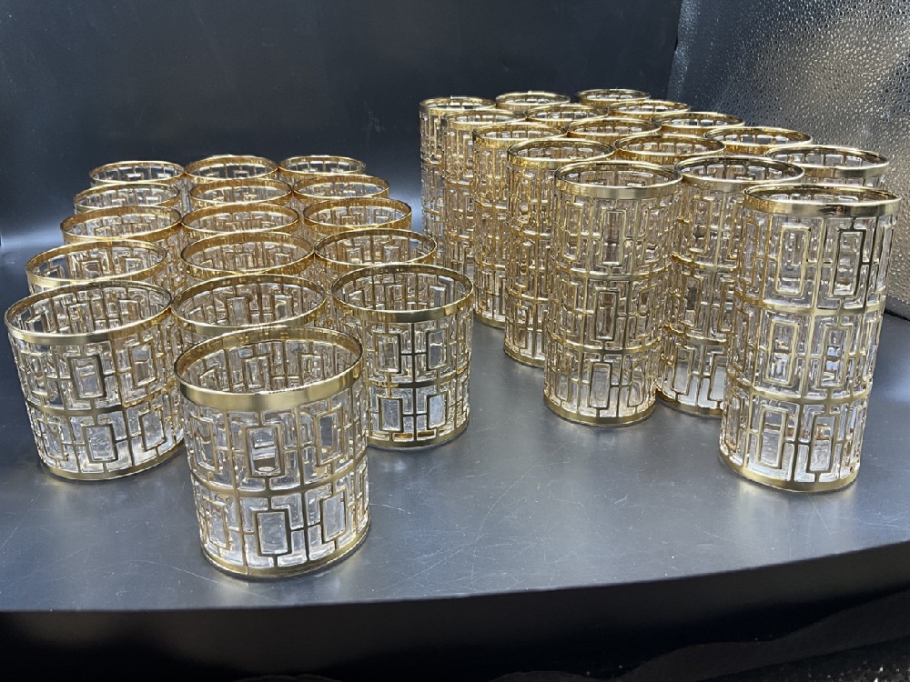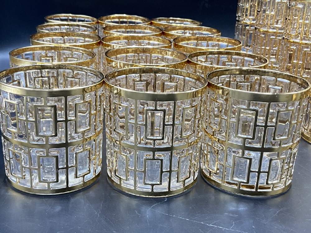 Imperial Glass Shoji 22k Gold Whiskey and High Ball Glasses. Eight (8) Whiskey glass have Imperial marking at base. Sixteen (16) High Ball glasses are unsigned and additional Eight (8) Whiskeys are unsigned.