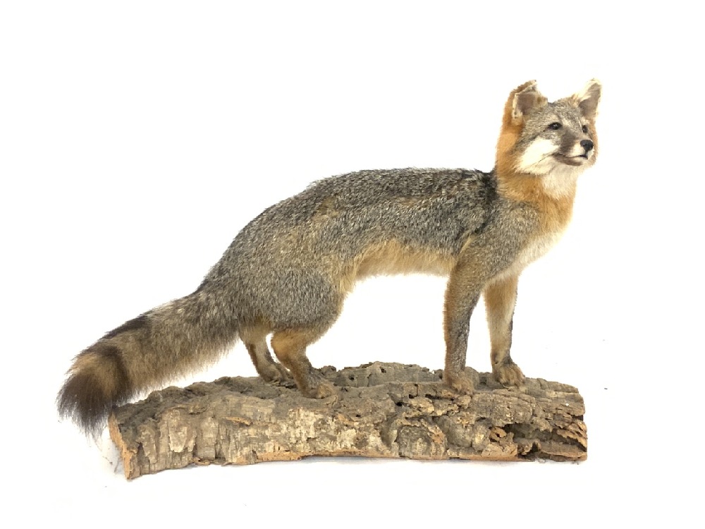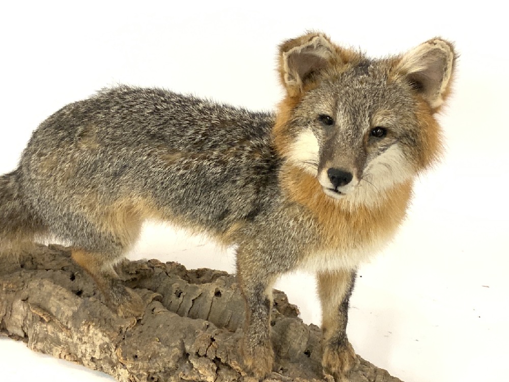 Taxidermy Fox Mounted on Tree Stump.