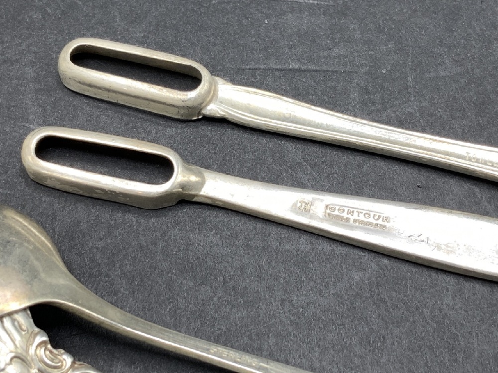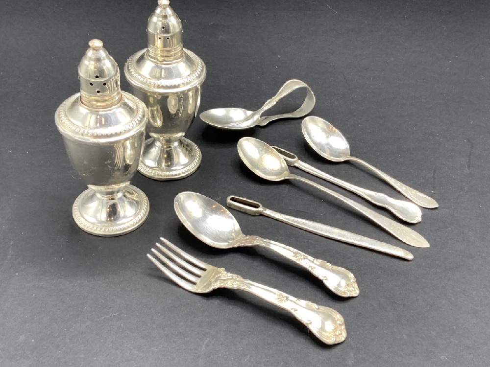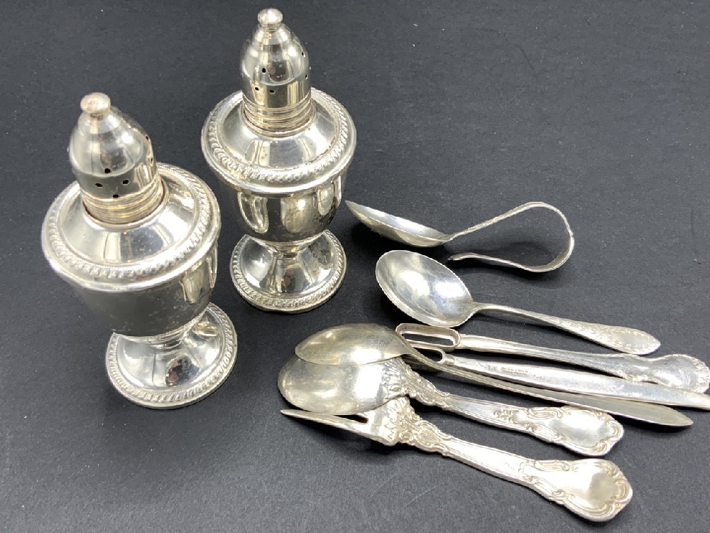 Seven piece estate compiled sterling silver flatware and one pair of sterling silver weighted salt and pepper.