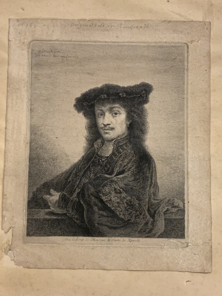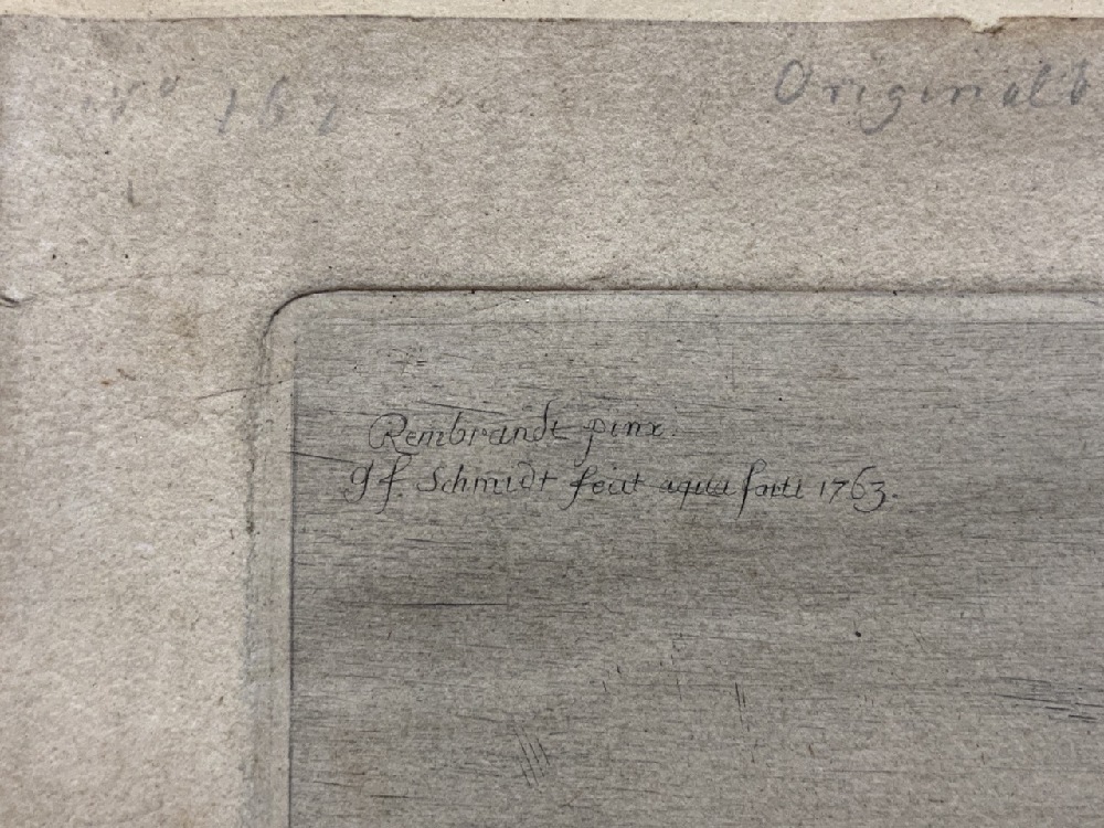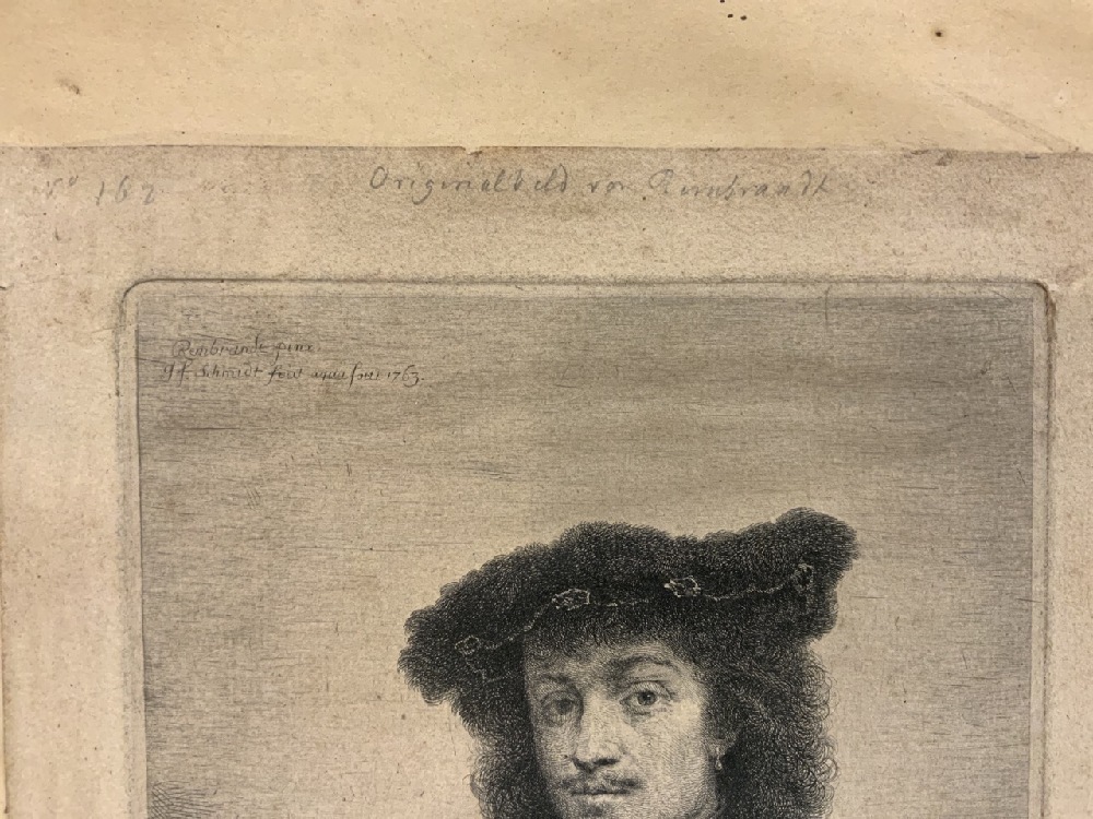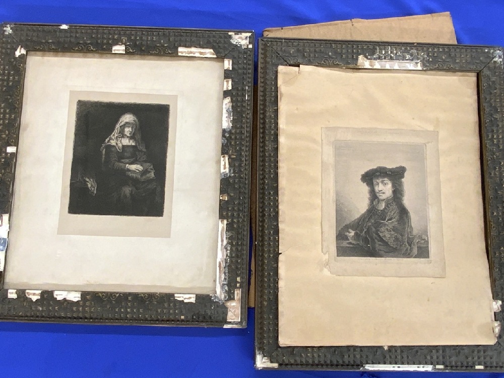 Two framed Rembrandt Etchings. Housed in matching 19th century frames. Poor condition. Bearded Man is glued on paper. Edge wear. Removed from frame to show details.