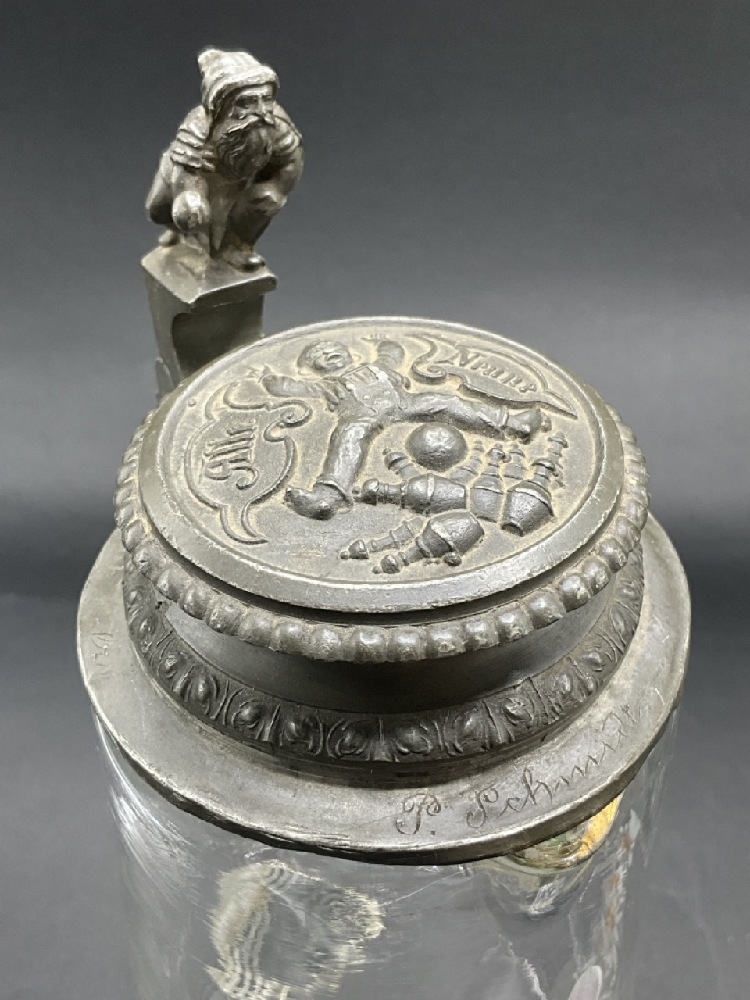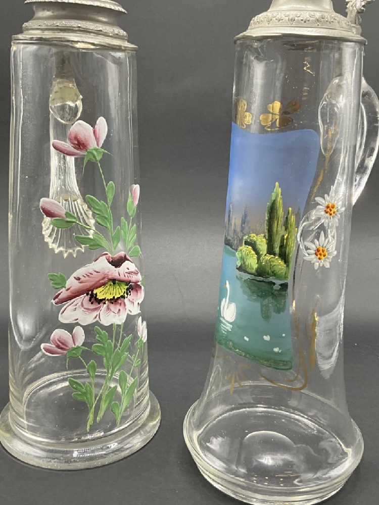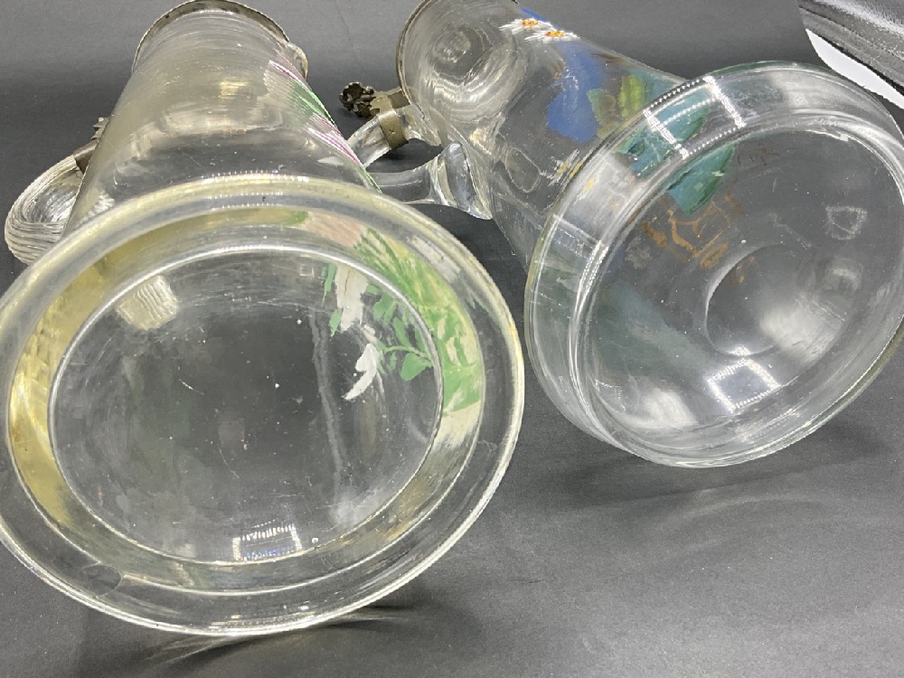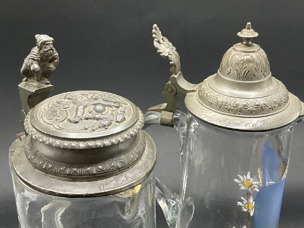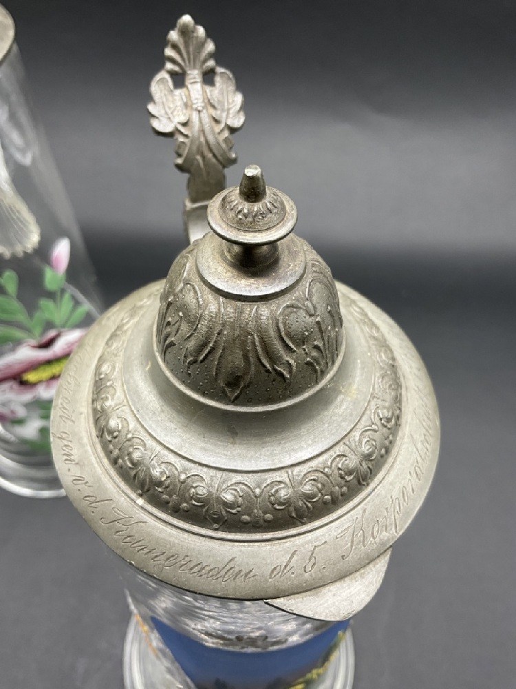 Two (2) Antique German Glass and Pewter Steins. Having enamel paint decoration.