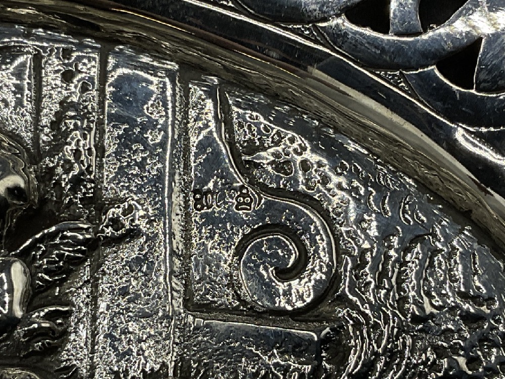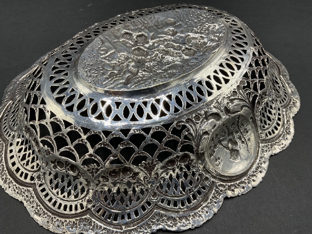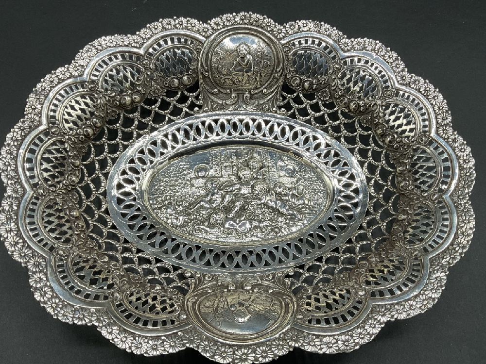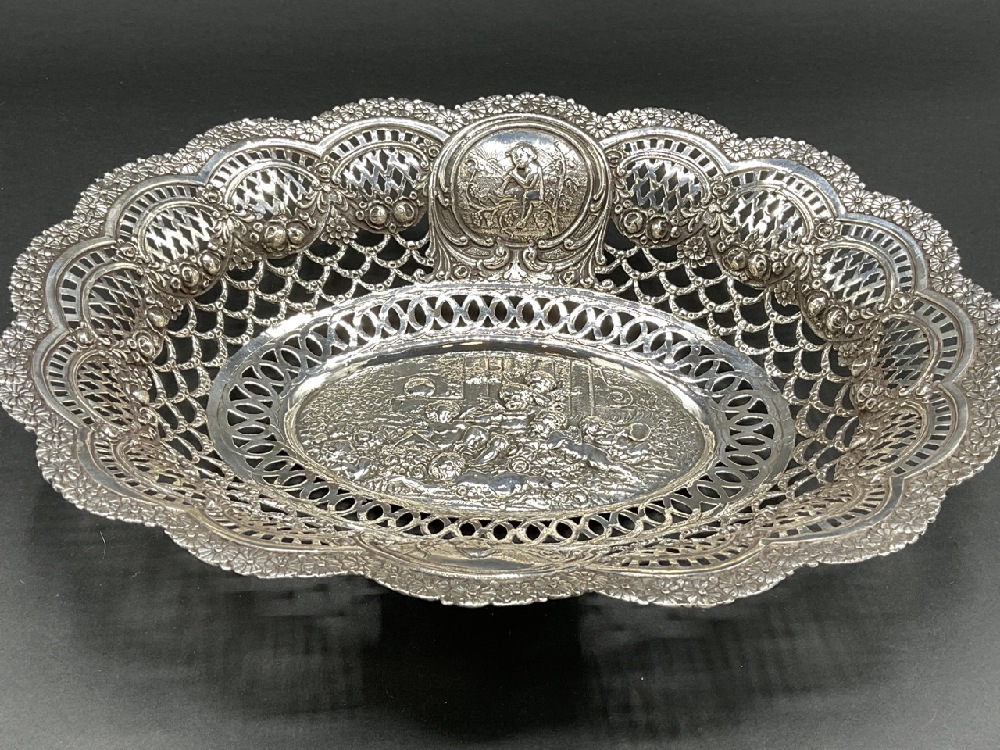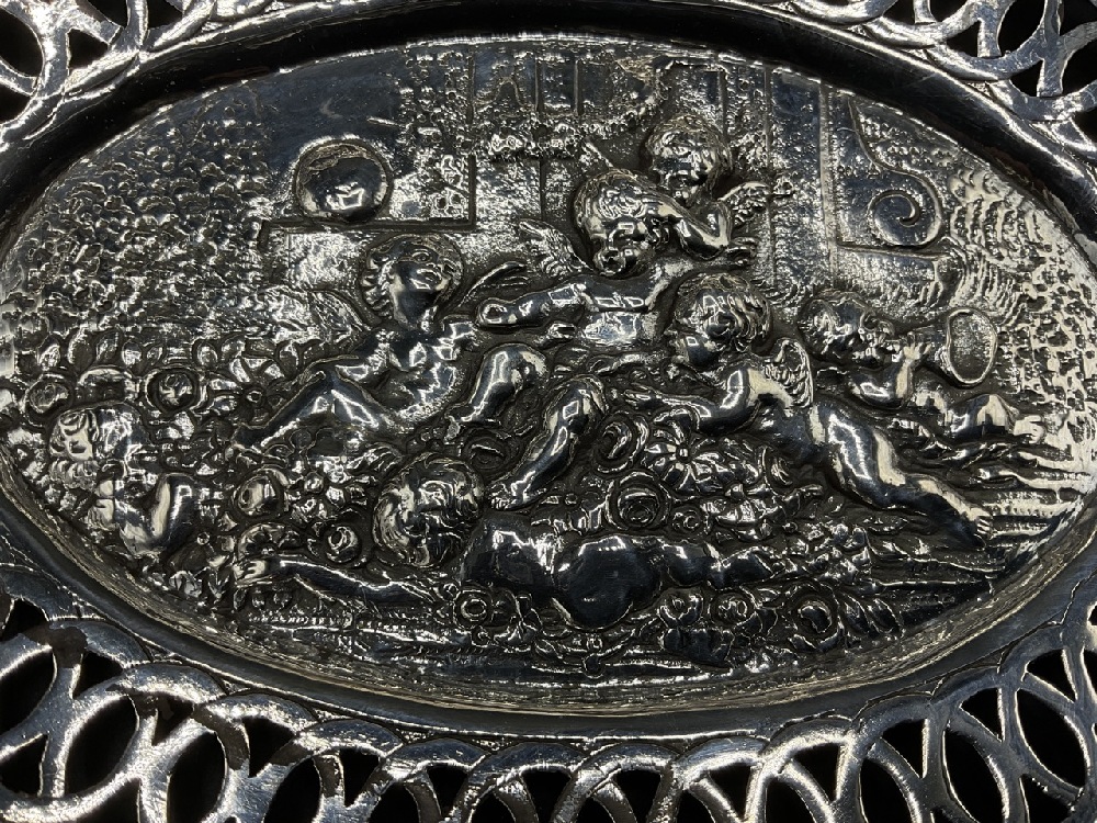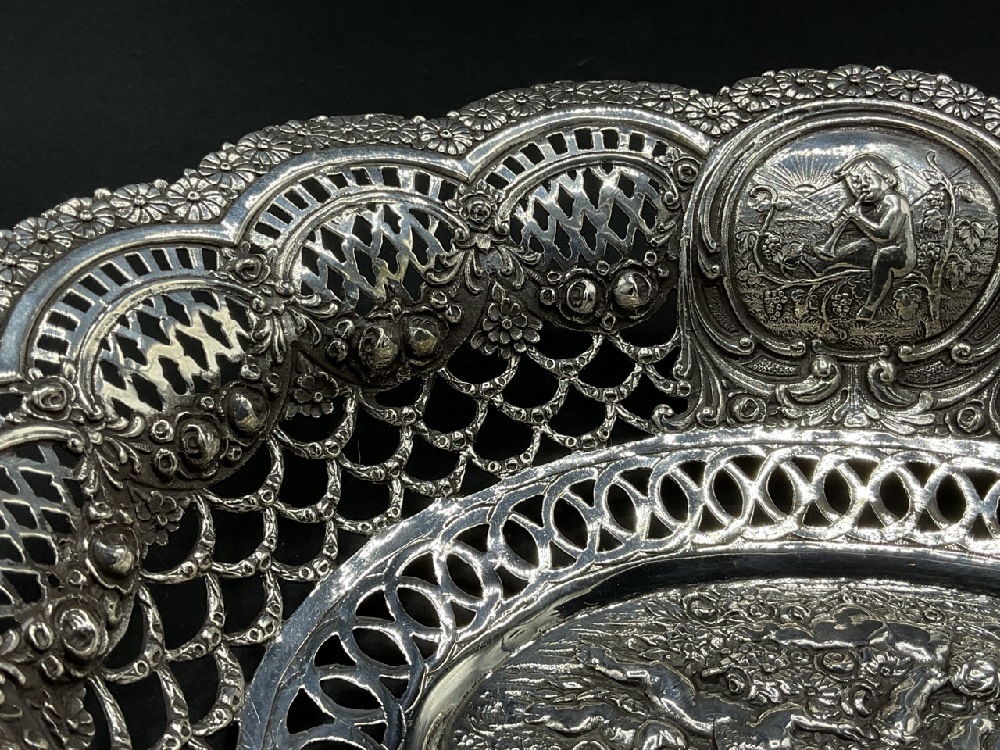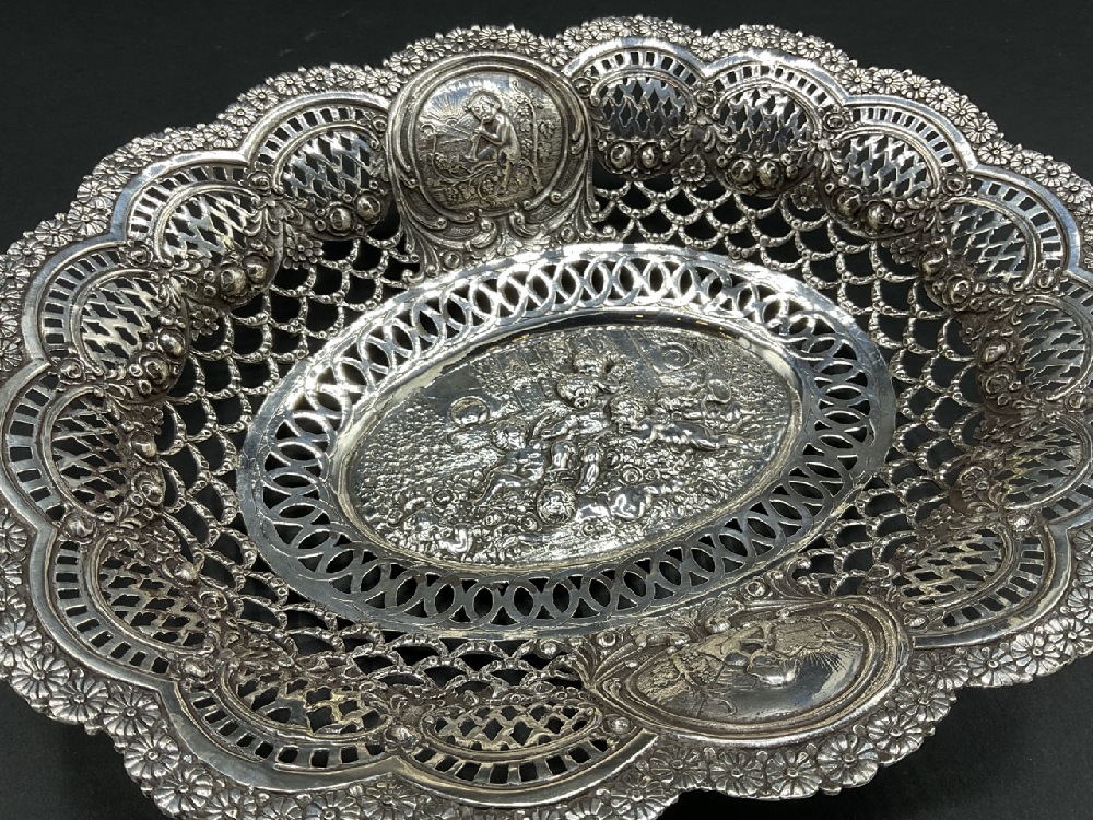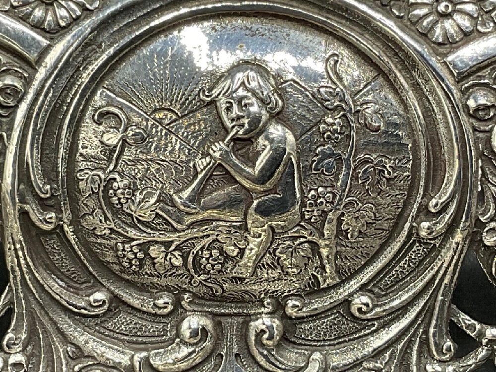 A very fine antique German 800 silver repousse bowl with putti and flute players.
