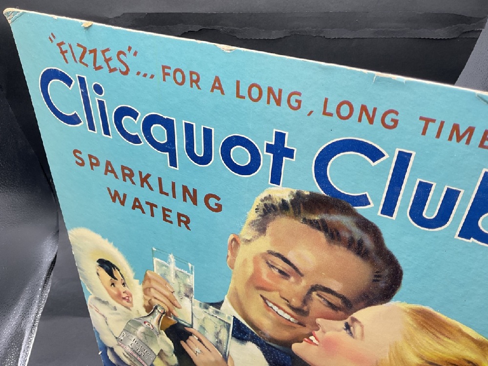 Clicquot Club 1930's Carboard Easel Back Seltzer Soda Advertising Sign.Clicquot Club Vintage Cardboard Advertising Sign. "Fizzes for a long long time" Sparkling Water, c.1930's. Very nice coloring. Not displayed. Cardboard Easel Back.