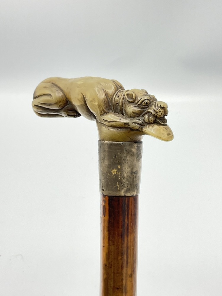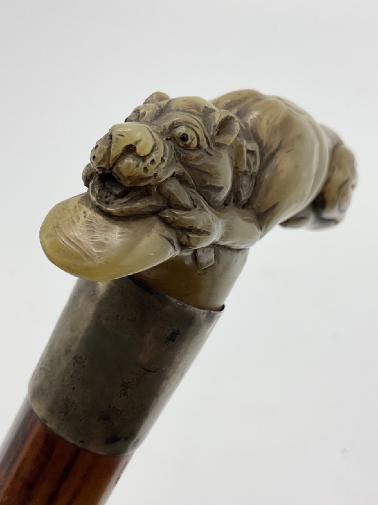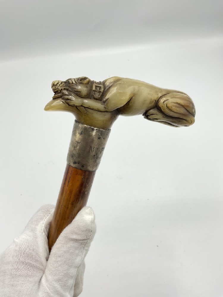Antique carved jade cane handle with sterling silver band and appearing to have original cane. Sterling Monogrammed NP