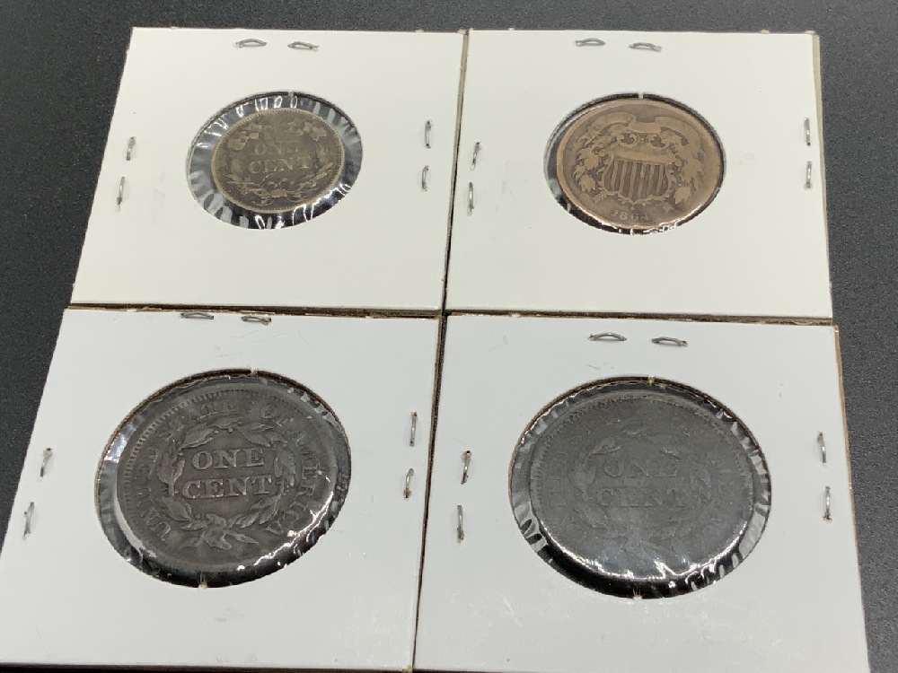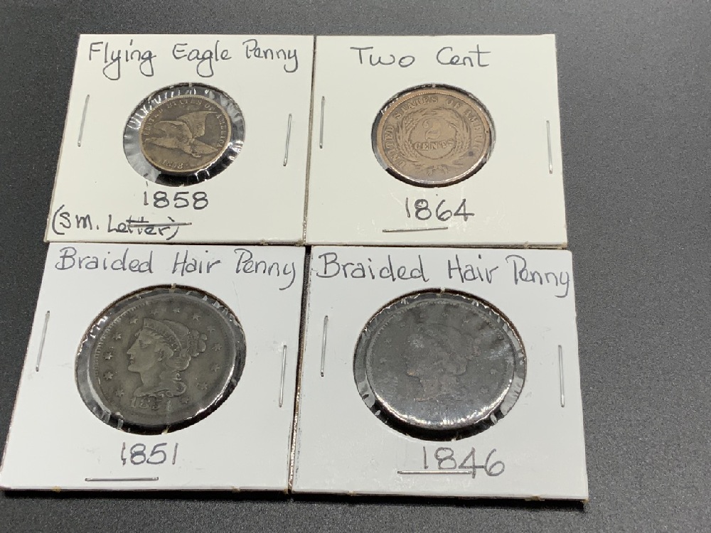1858 Flying Eagle, 1864 2 Cent, 1846 and 1851 Braided Hair Larger Cent.