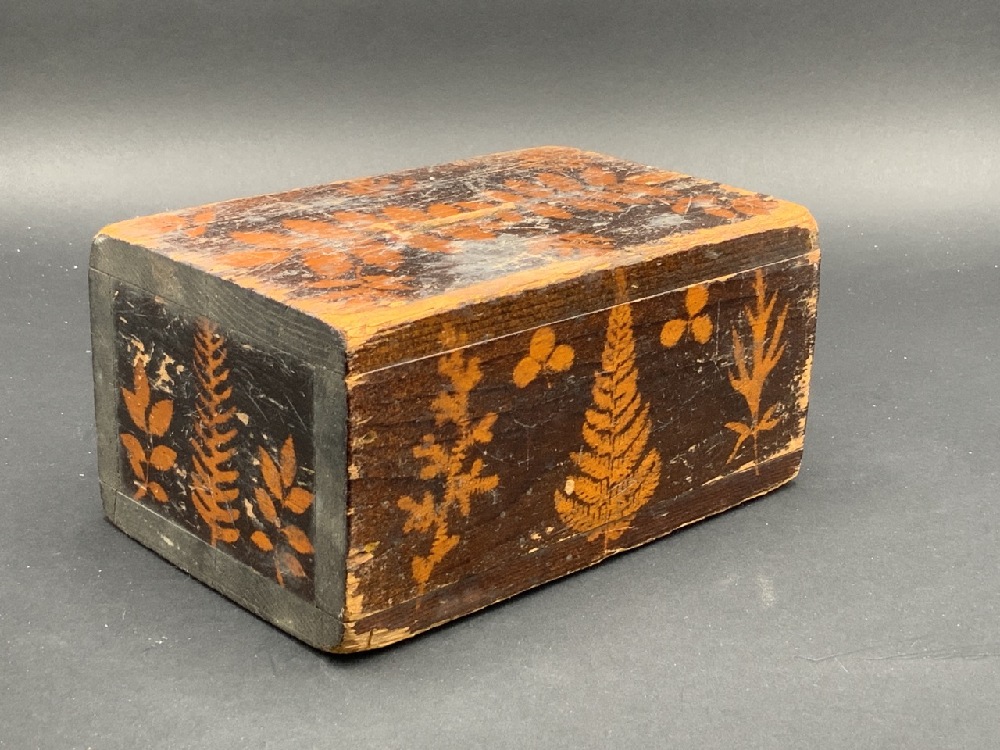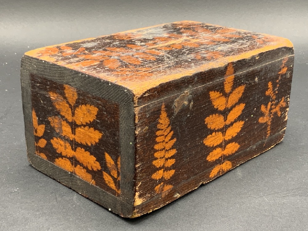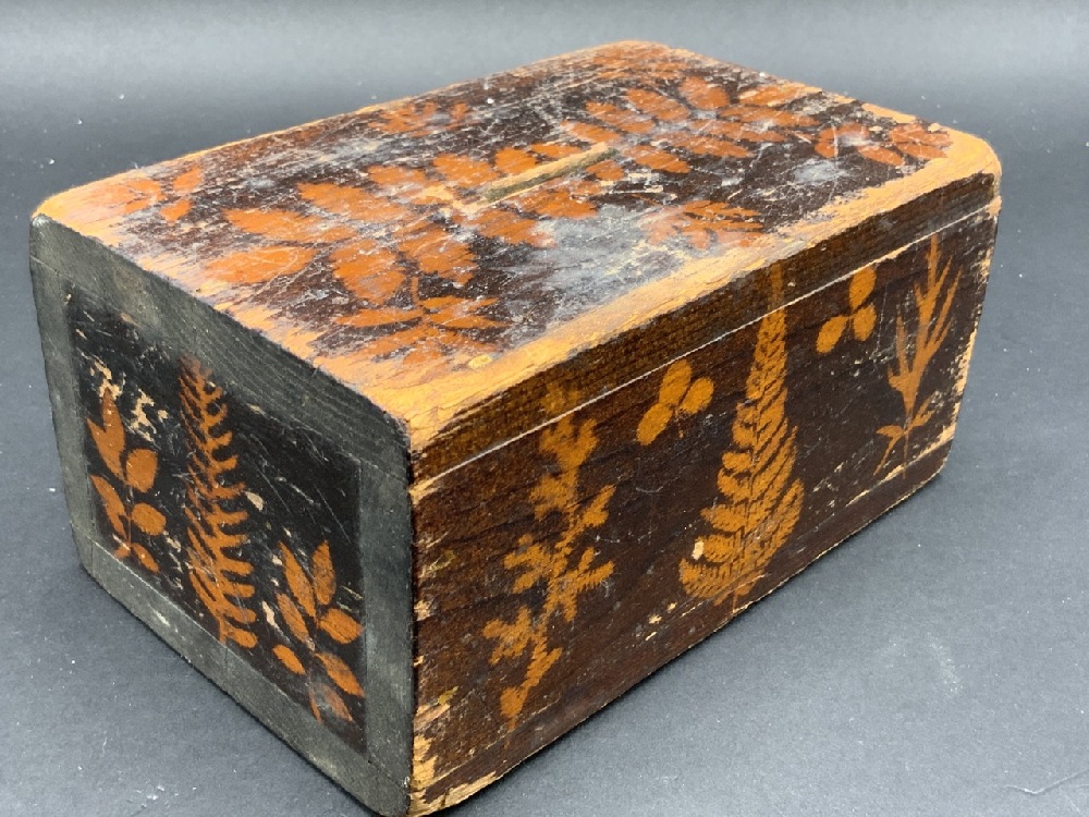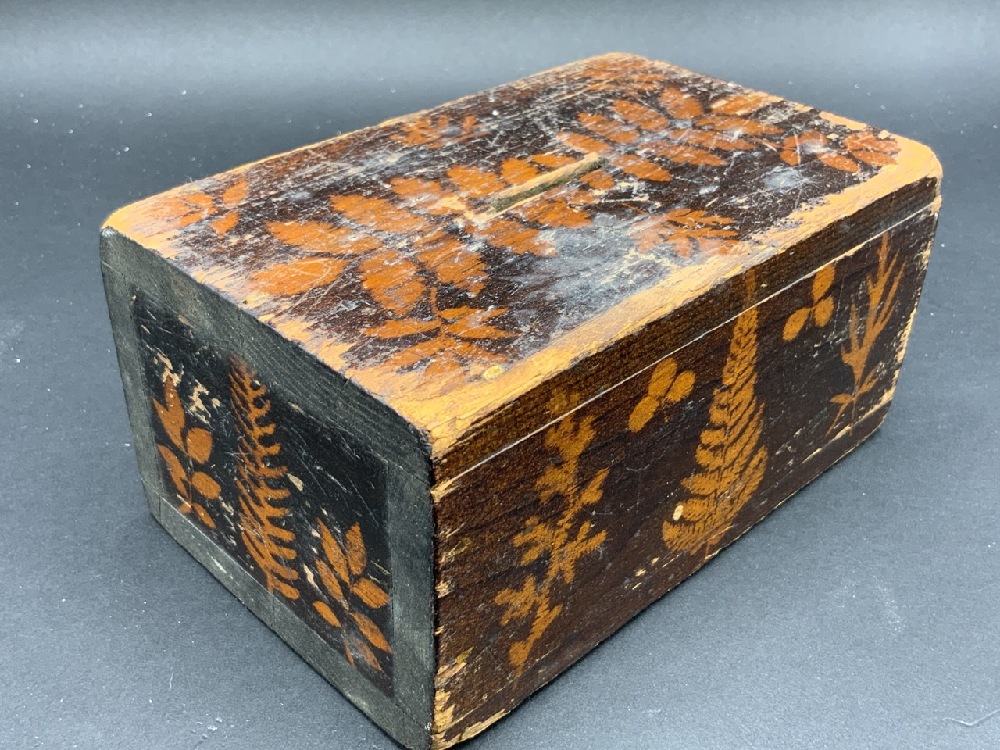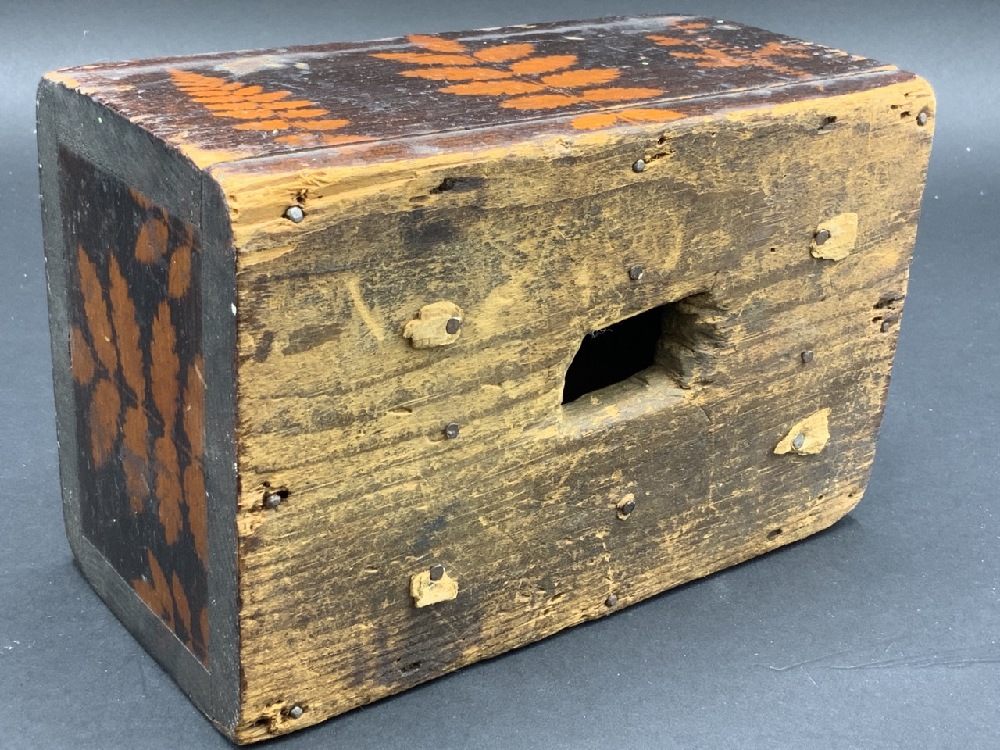 19th c. Folk Art Stencil Painted Wood Coin Bank Box.