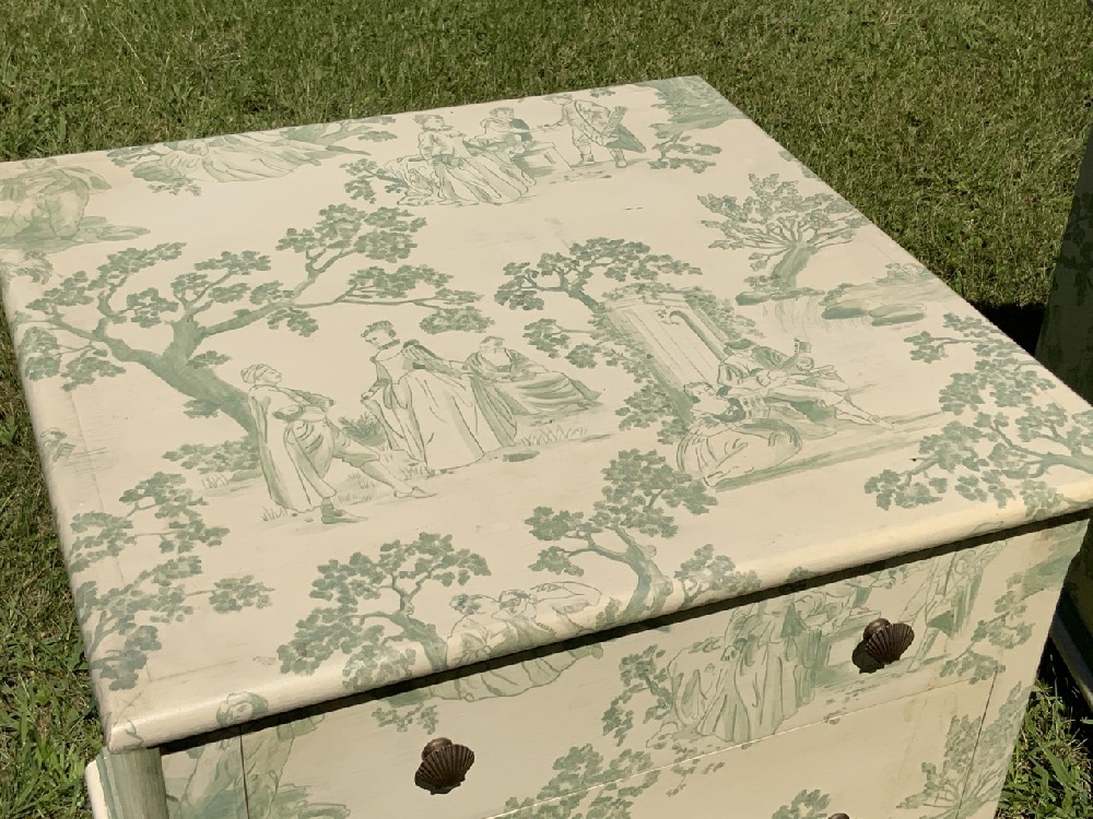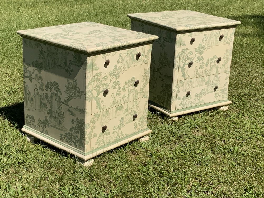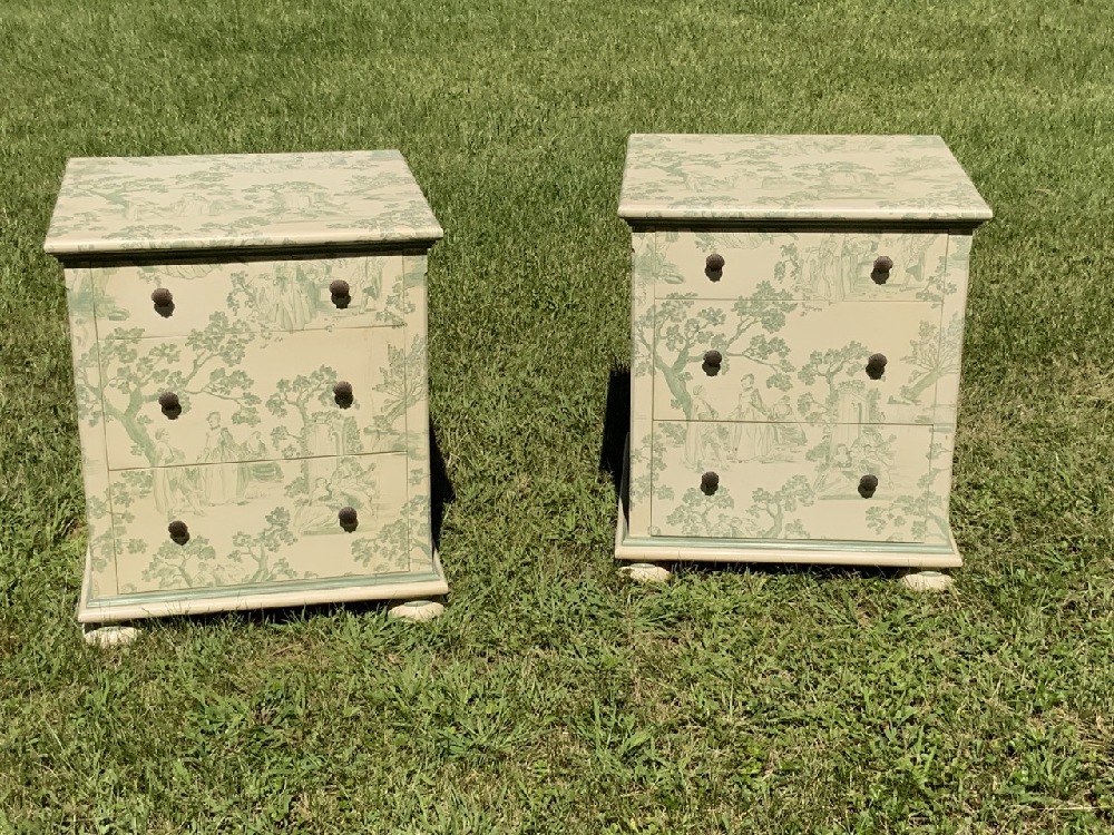 Two (2) Green and white decorated bedside chests with courting scenes. Three drawers with shell form hardware pulls set on bun feet.