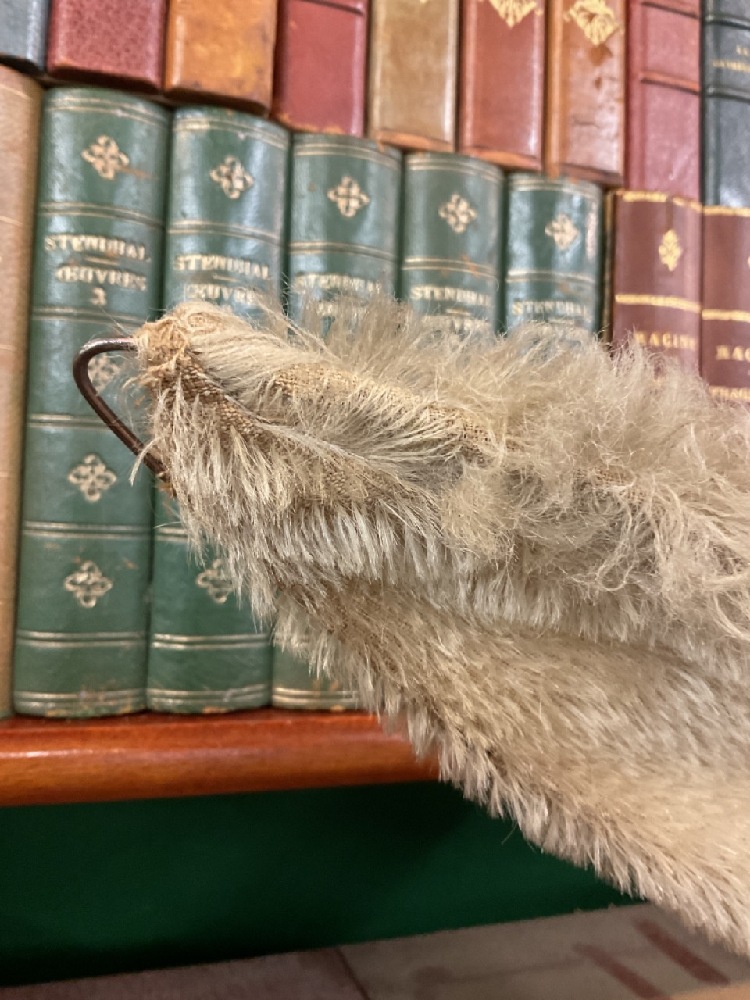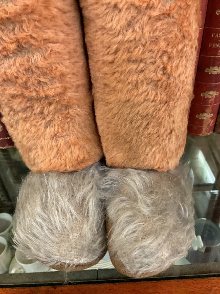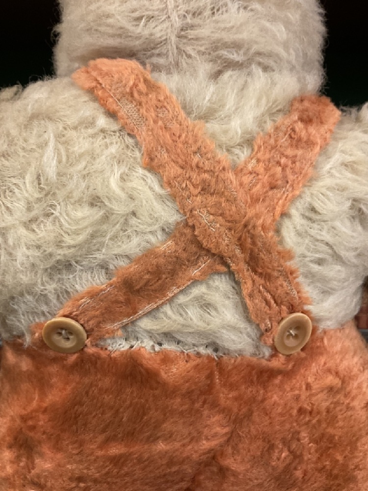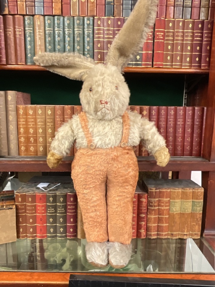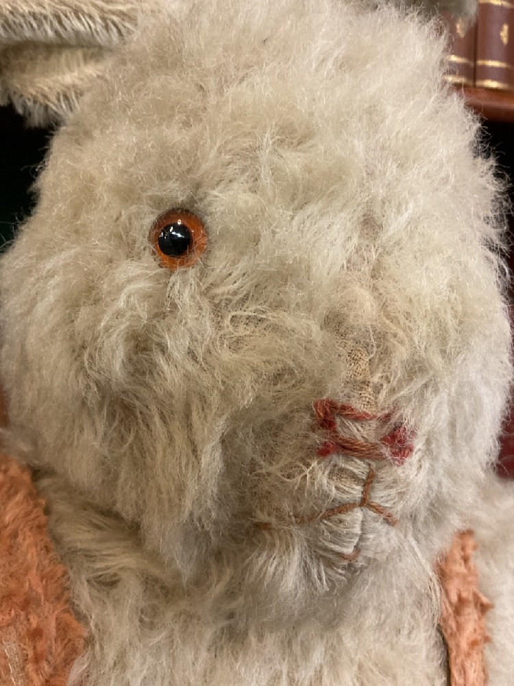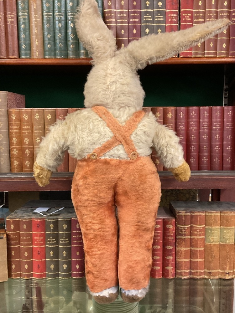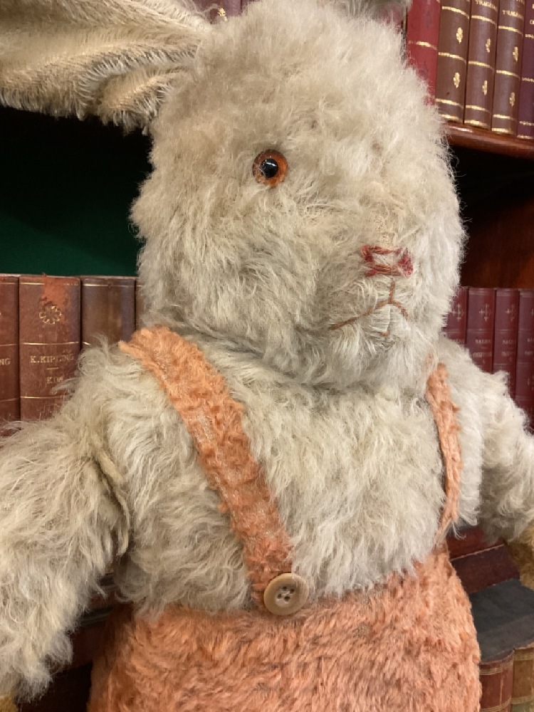 Early large mohair and straw stuffed bunny rabbit with suspenders. "Peter Cottontail"