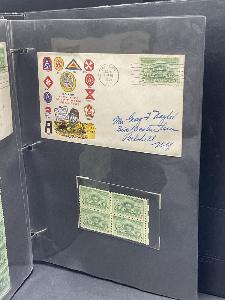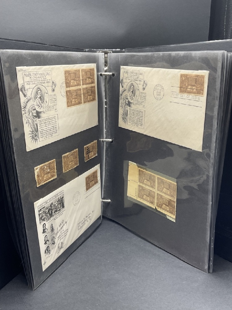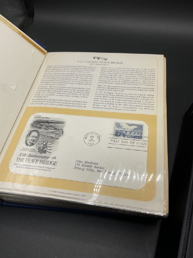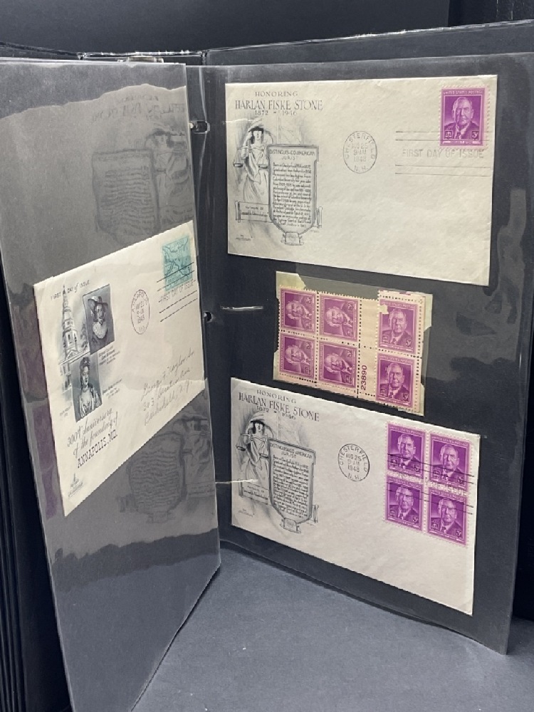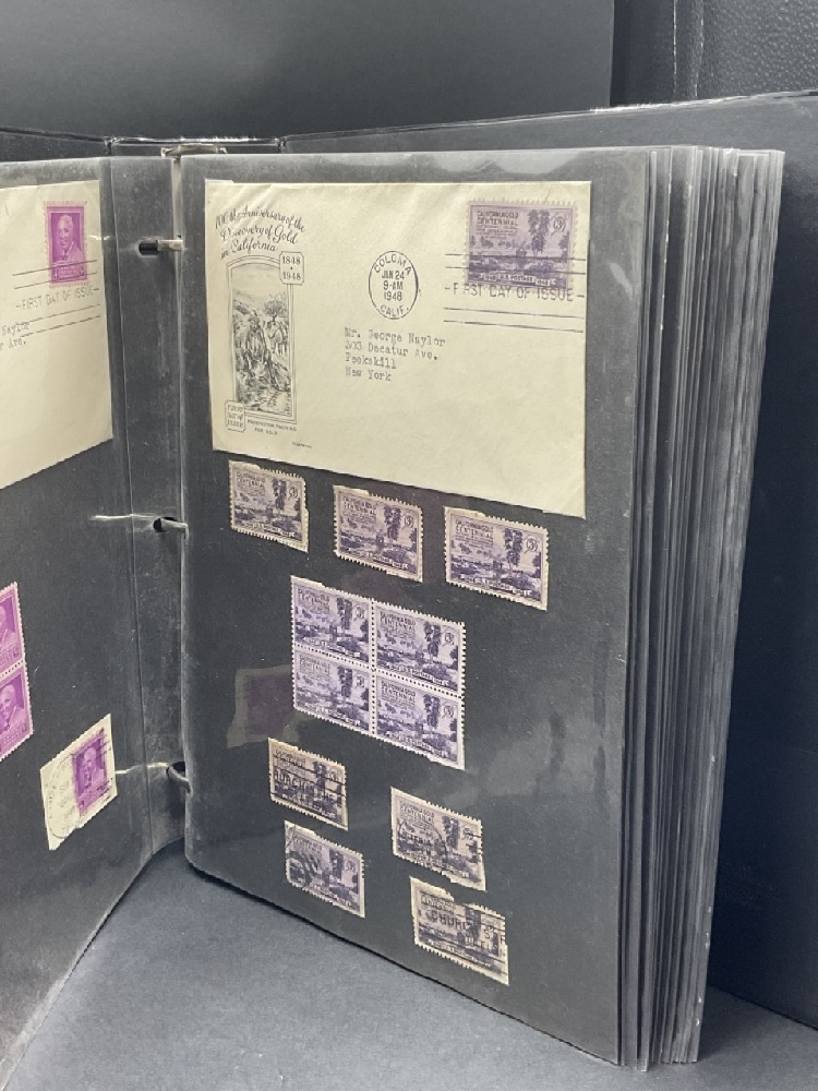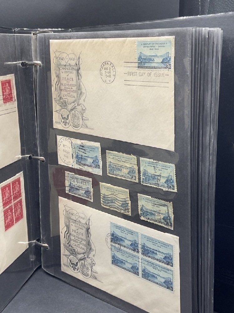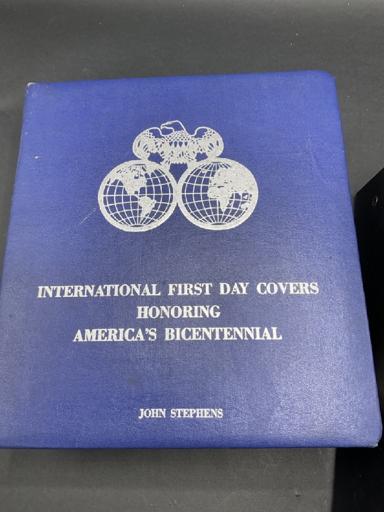 Two Albums with First Day Covers and Assorted Stamps. Dating 1947-1948 and 1977 Bicentennial Issues.