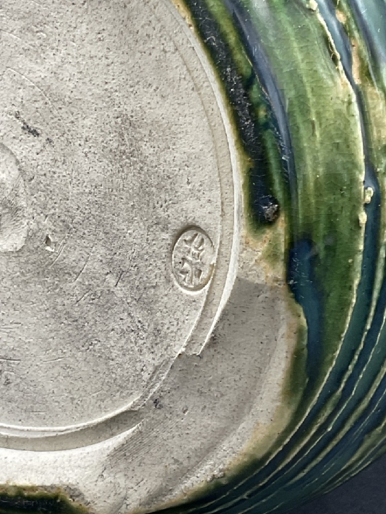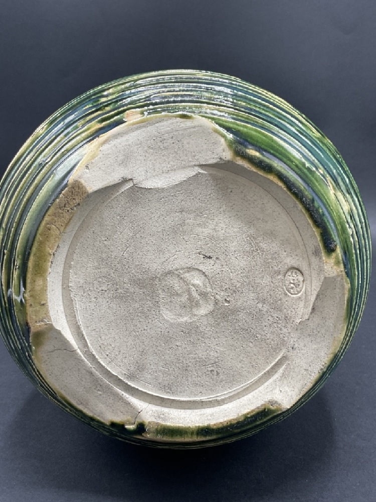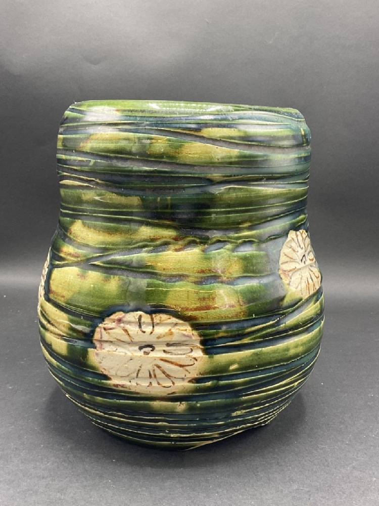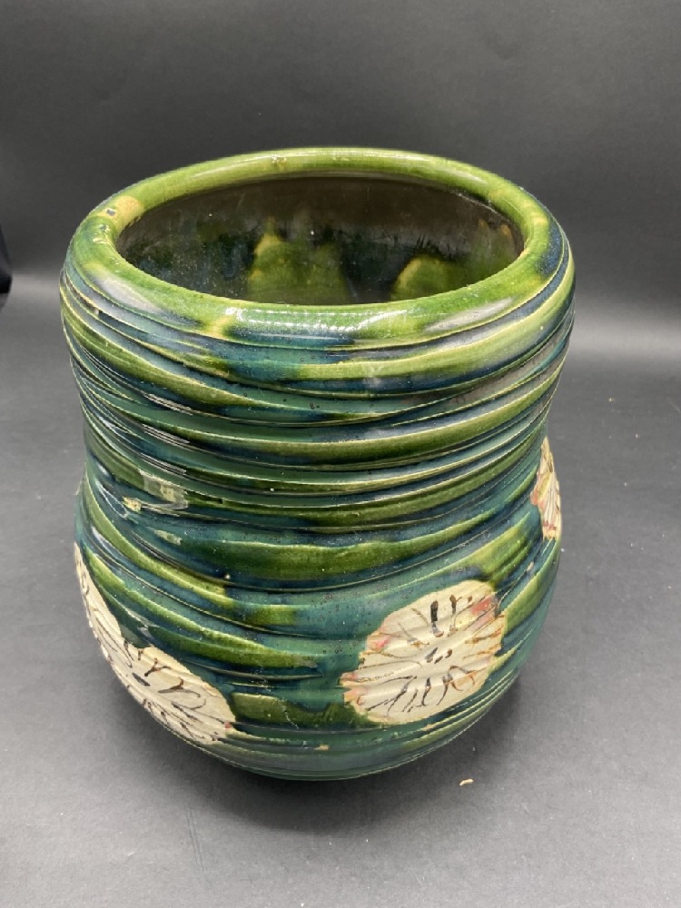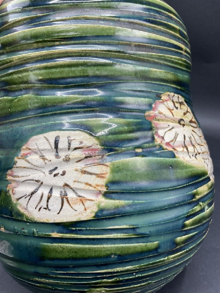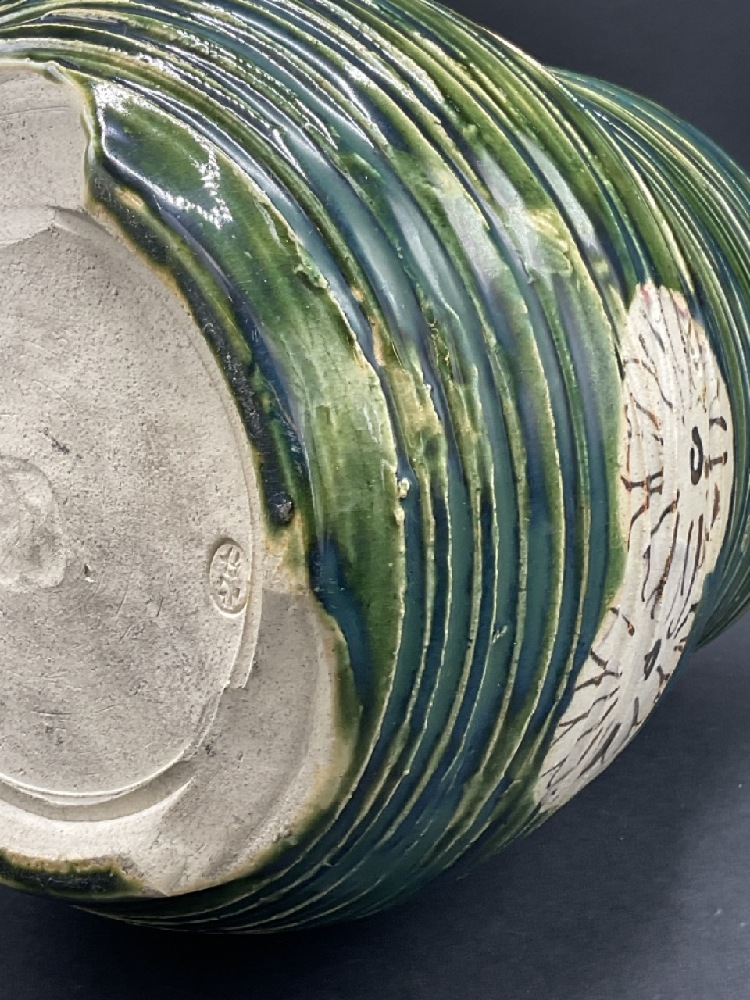 Japanese pottery vase with blue/green coloring and flowers.