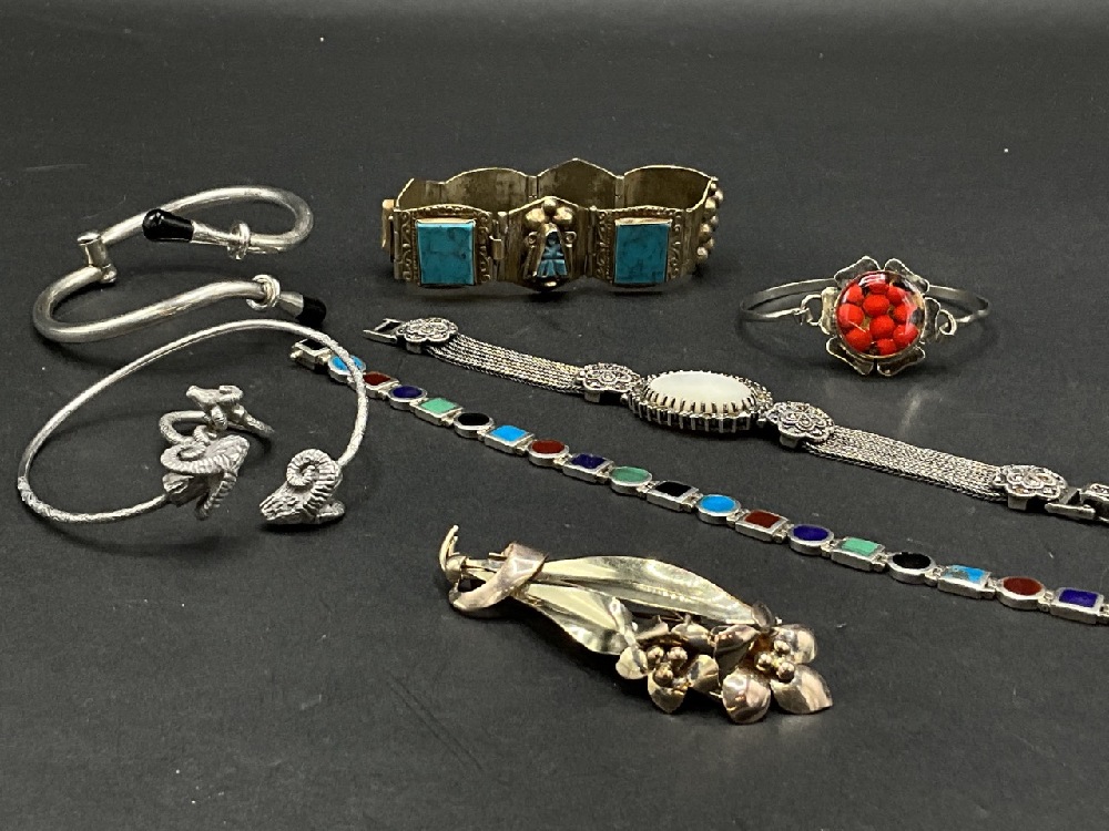 Sterling Silver 7 pcs Jewelry Lot Includes Bracelets, Ring, and Pin Total weight: 152.7 g