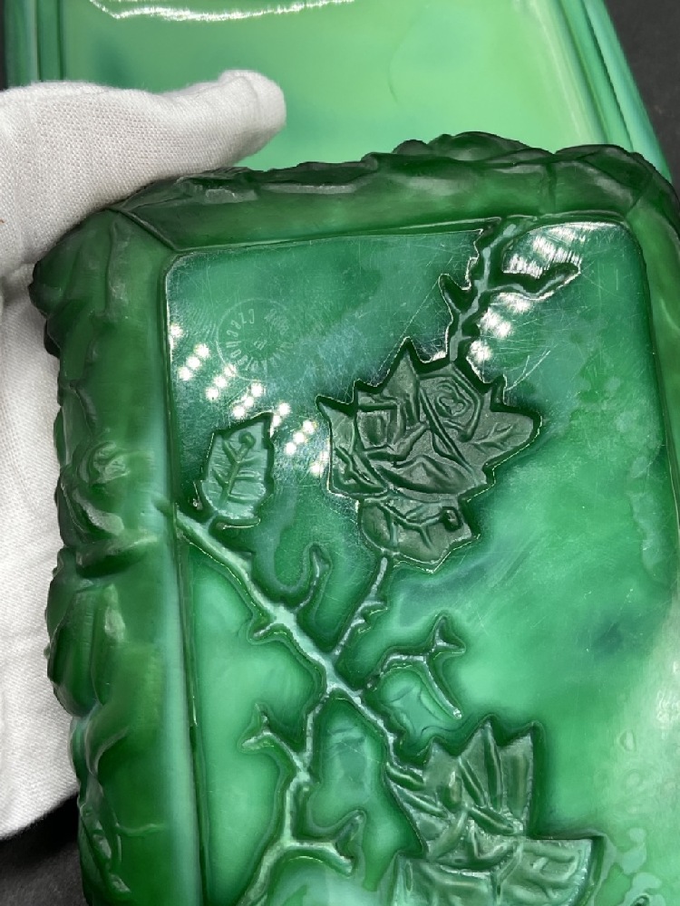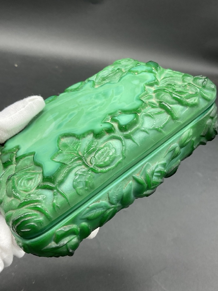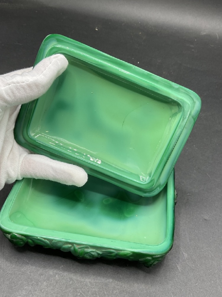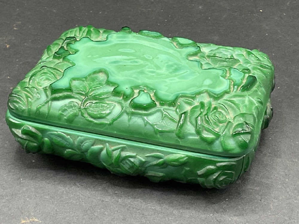 Art Deco Malachite Jade Glass Box, Czechoslovakia.