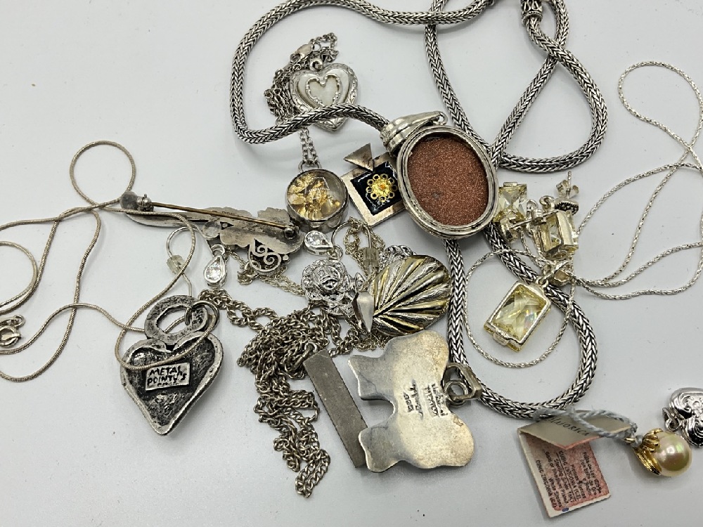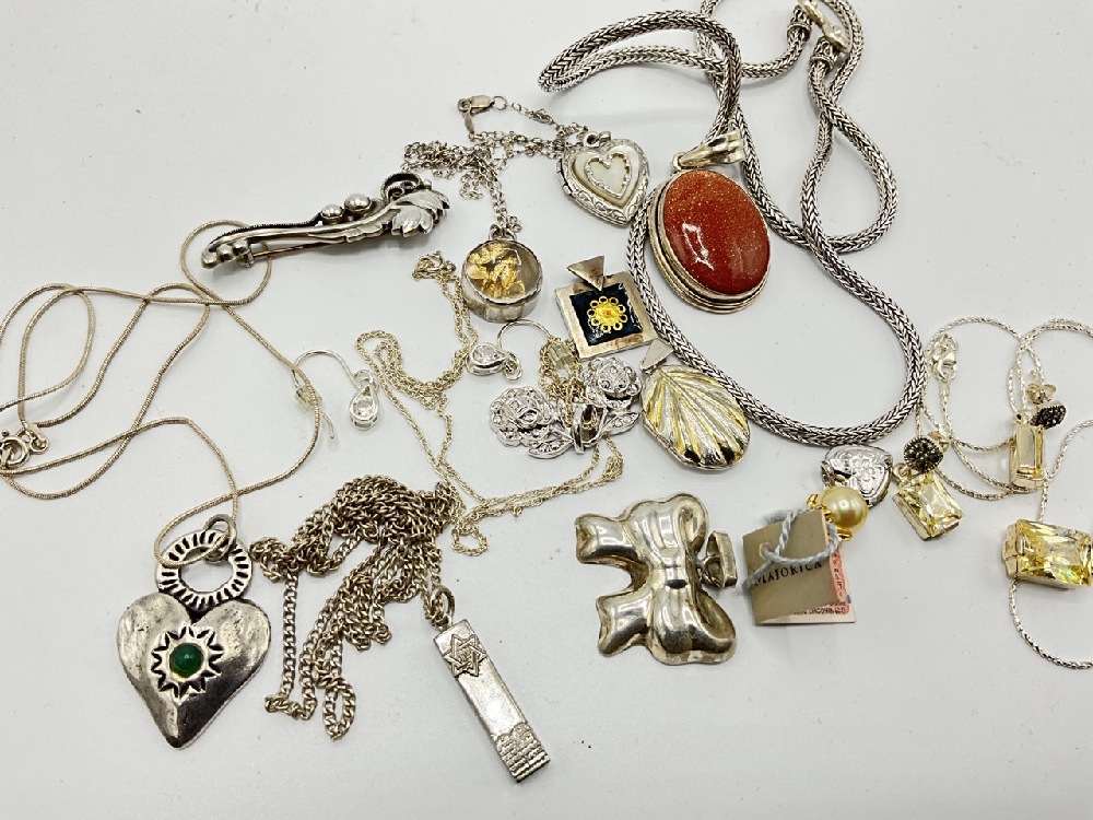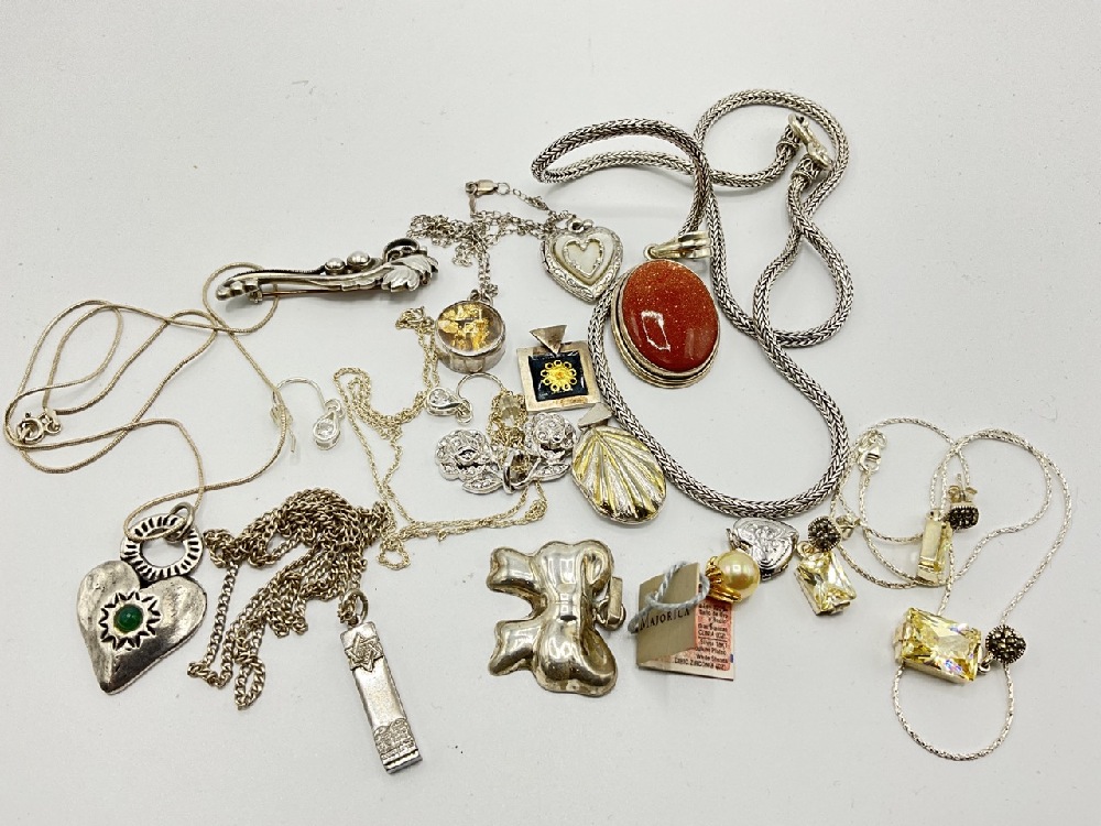 Sterling silver jewelry group lot. Necklaces, peridot and marcasite necklaces and earrings.