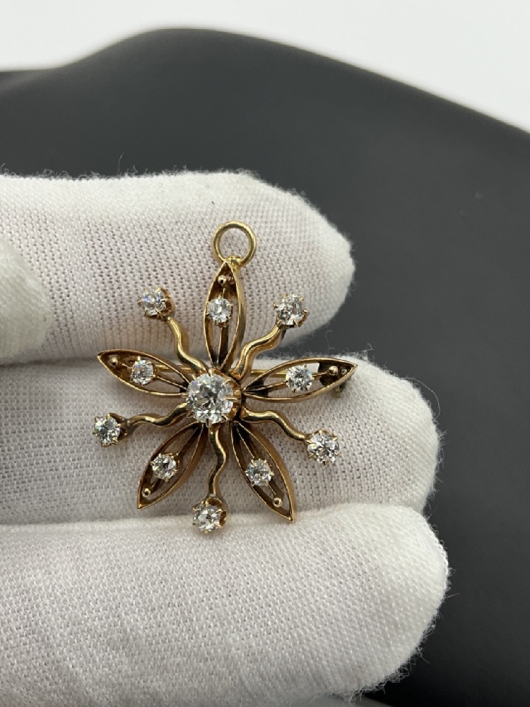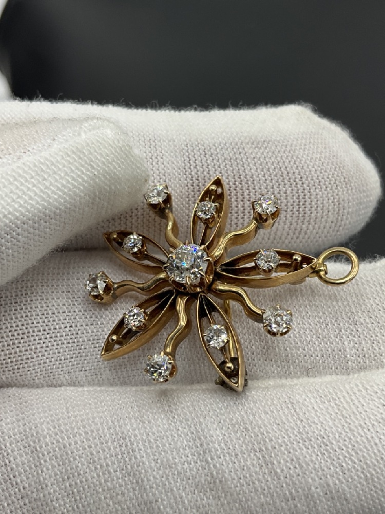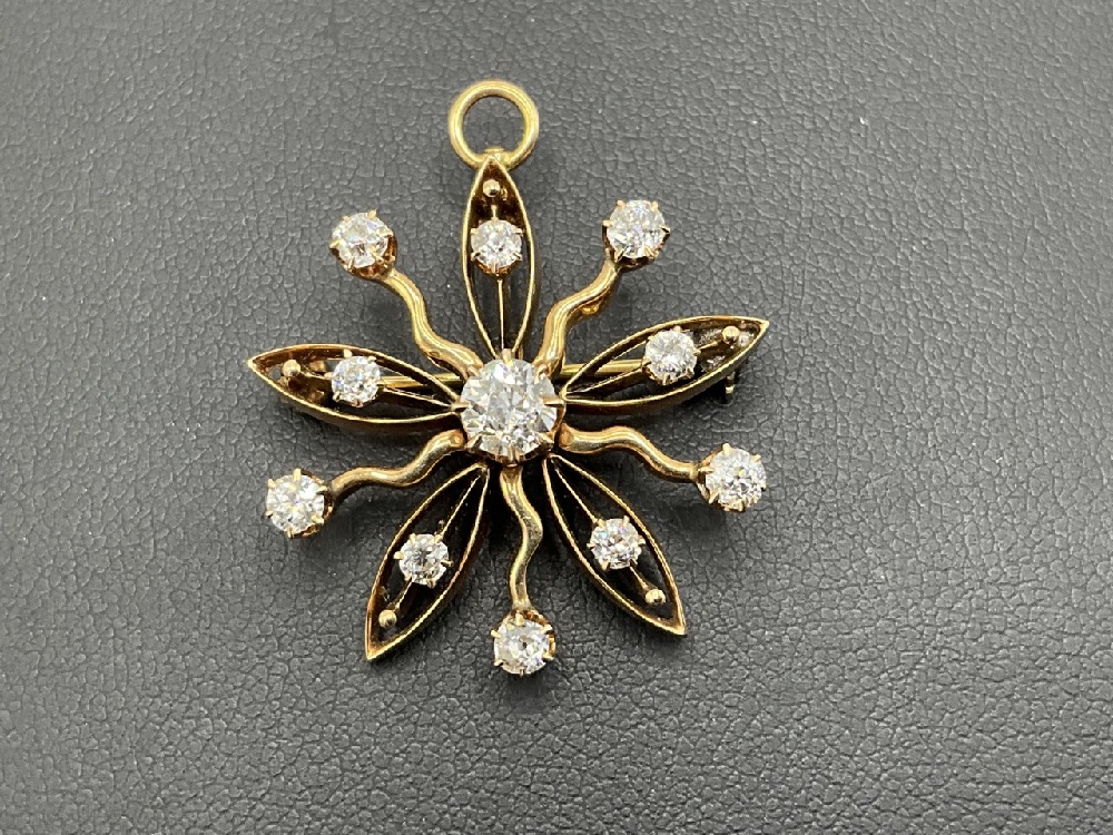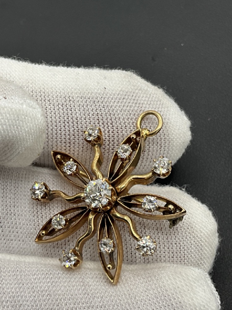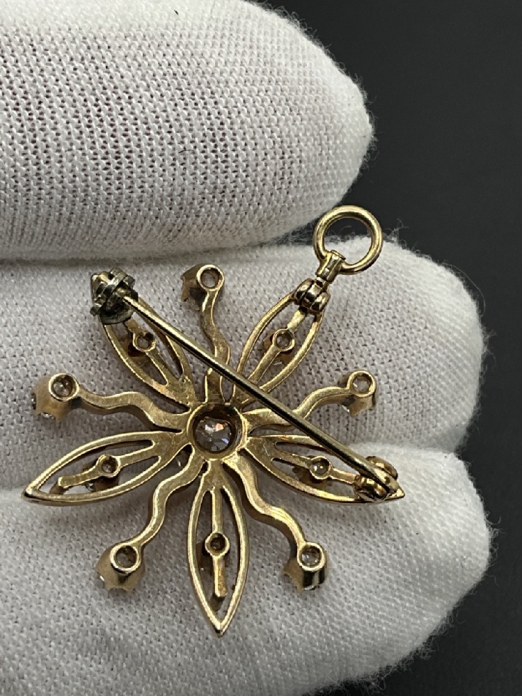 14K Yellow Gold Diamond Sunburst Brooch/Pendant.