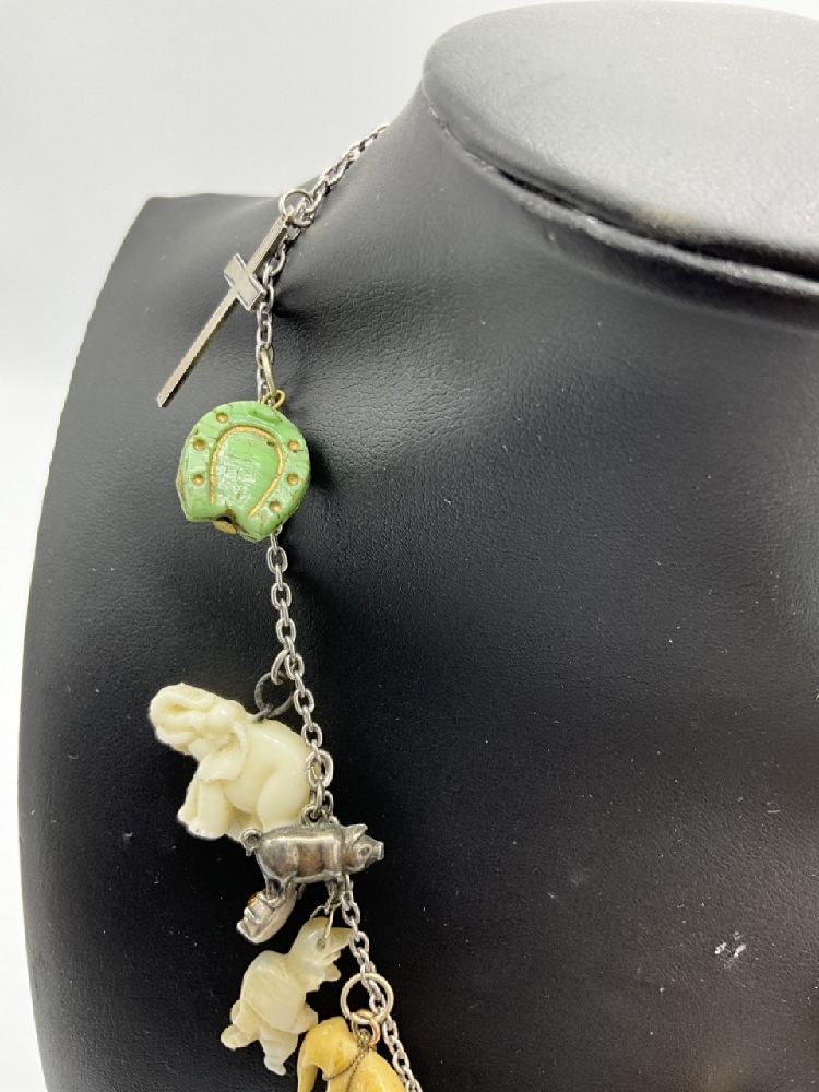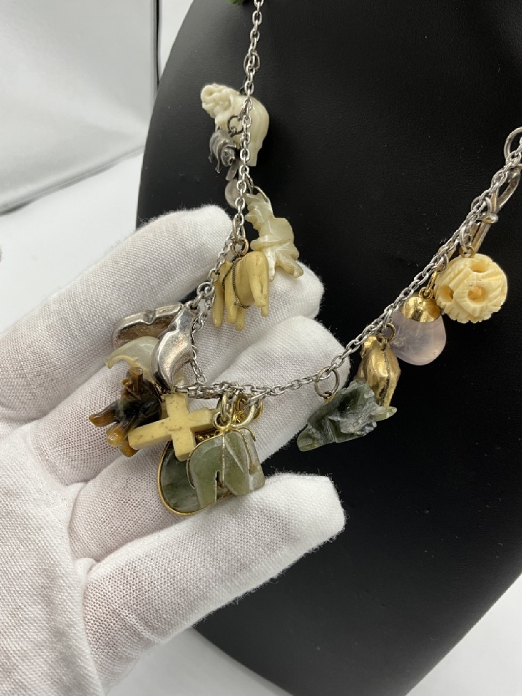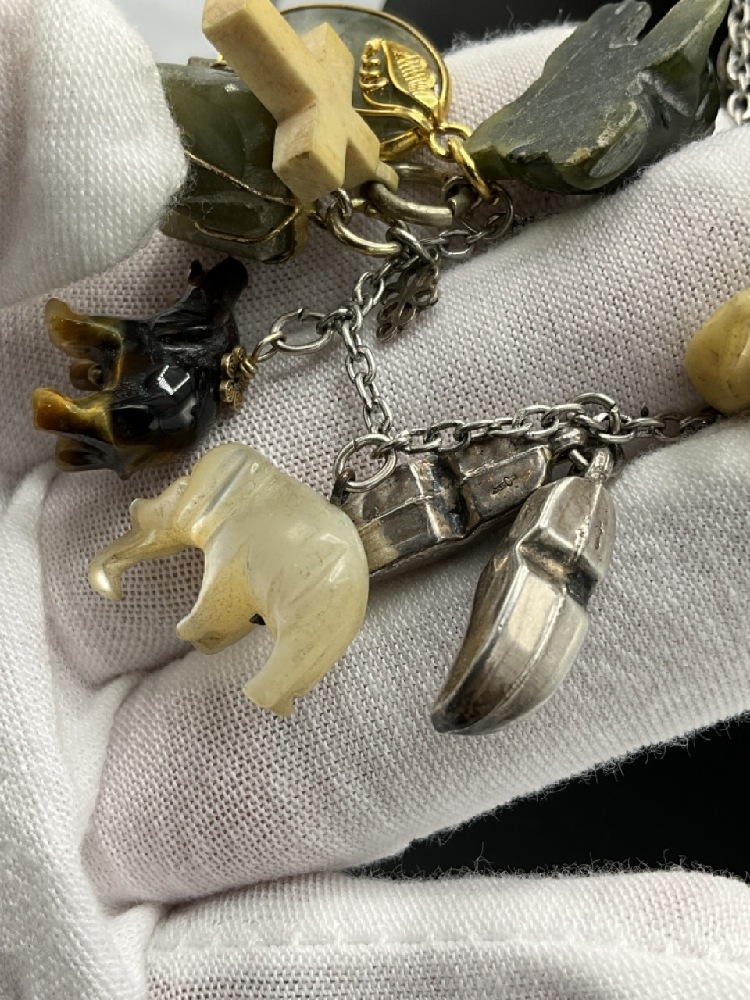 Vintage sterling silver charm bracelet with turquoise, sterling silver dutch shoes and keys, jade, pink, quartz, etc.