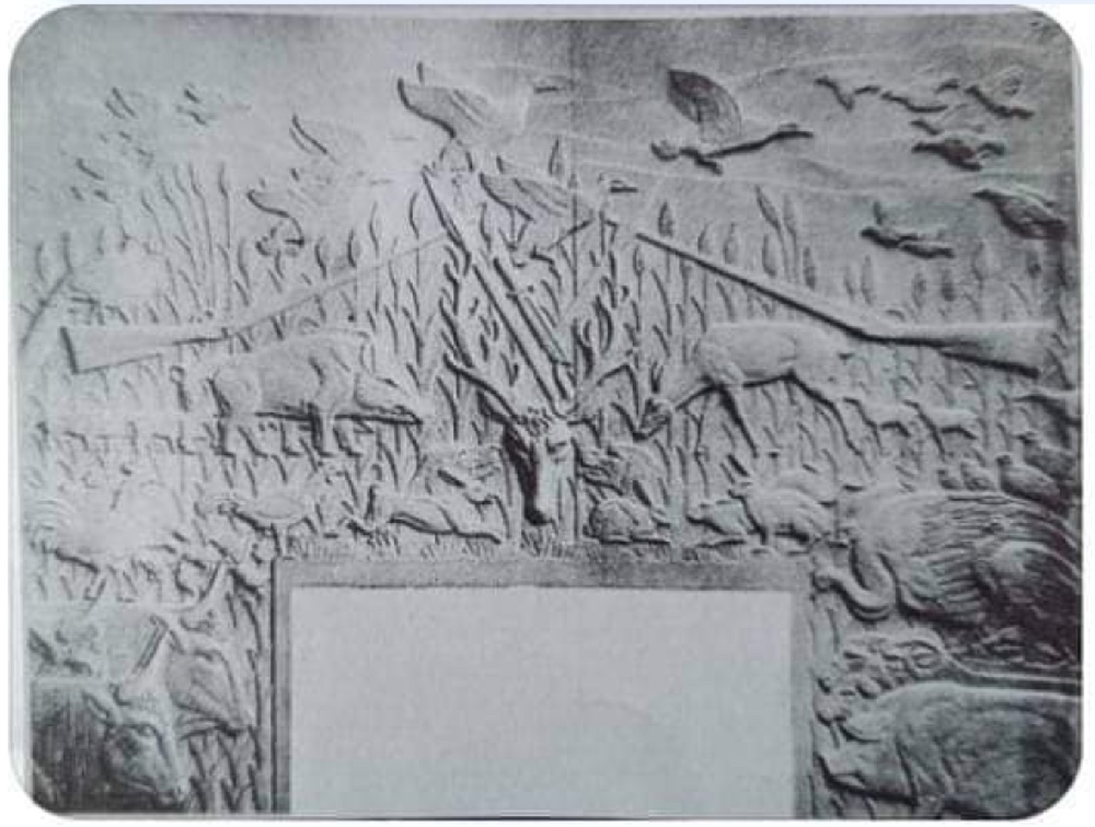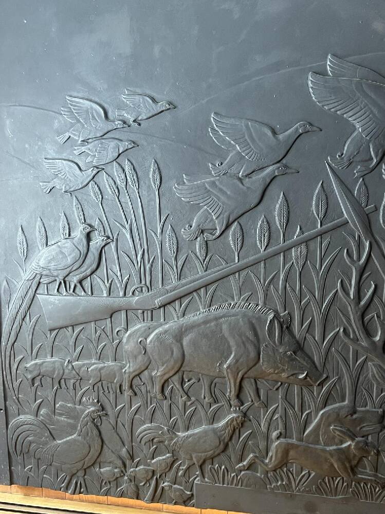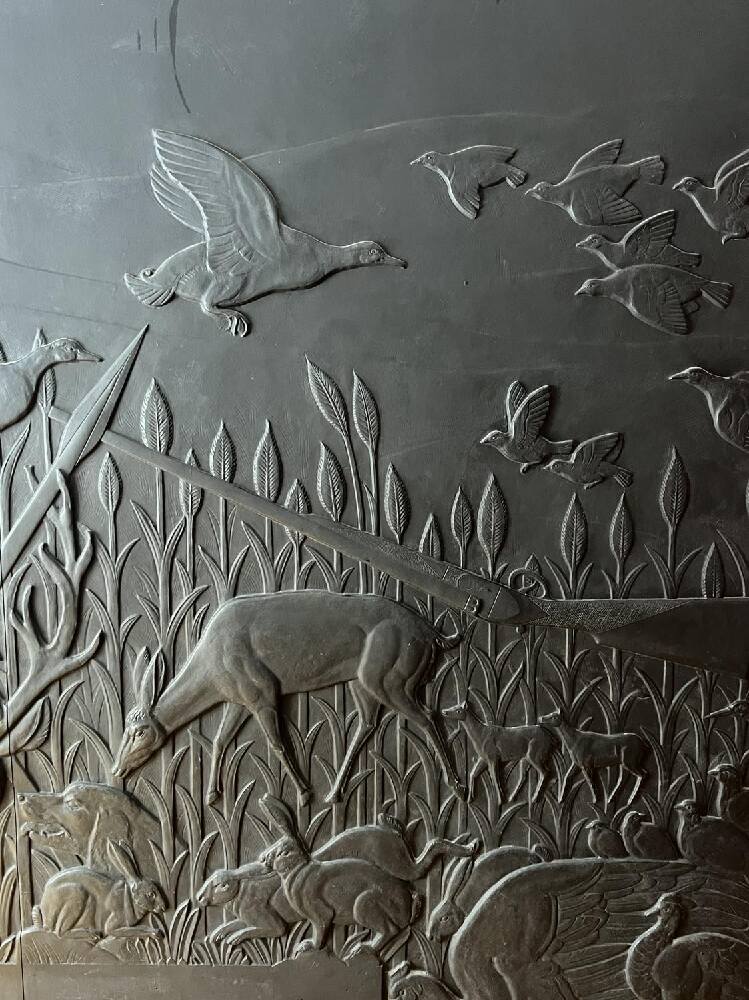The original cast iron plaque from Café Grill Night Club and Gathering Place - most elegant dining room of the SS Normandie - considered by many to be the most luxurious ocean liner in history with its Art Deco interior and celebrity passengers such as Cary Grant, Marlene Dietrich, Walt Disney, James Stewart, Ernest Hemingway, and Fred Astaire to name a few . This piece of history surrounded the oven of the grill boasting Charles Hairon's illustrated animal engravings - this is where the very rich and famous would dine. The cast iron grill plaque is notably mentioned and images showing this exact plaque in its glory can be found in the photo gallery. This enormous cast iron plate surrounding the oven is fully decorated with Mr. Hairon's illustrated animal engravings. An engraved glass plate decorated by Mr. Max Ingrand surrounded the grill in front presumably to keep the fumes out of the dining room area. The ship was seized by the U.S. Government in WWII and The Ship was renamed the USS Lafayette. During renovations the ship caught fire in 1942. It was determined to not be rebuilt and salvaged in 1946. The plaque was removed from the ship and beautifully preserved in a private residence for the last 75+years in Monroe, NY along with doors bearing original Art Deco chrome finished hardware each being signed in the door jams by Jean Lacotte, Paris. (Separate lots 101,102 and 103) Weighing 1450 lbs. and standing 6 ft. tall and 10 ft. wide, this magnificent work of art comes apart in 2 pieces. Condition Report: The grill plaque surface is clean and highly detailed. It shows no damage, repairs or restoration. The bottom portion on each side of the plaque that would have dropped down on each side of the grill was cut off and it is unknown of its location. It is presumed this was done to fit the wall space at the residence. The approximate sections missing are 3ft X 2"ft sections. Photo gallery image of artist rendering is seen showing the missing sections. This in no way takes away from its beauty. Shipping: Freight Shipping or Pick Up Only. Please call office to discuss further. Plaque is easily accessible for loading purposes.