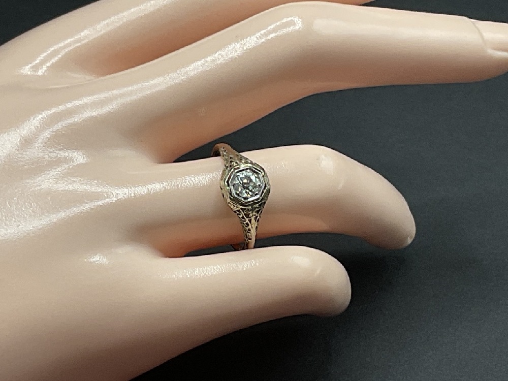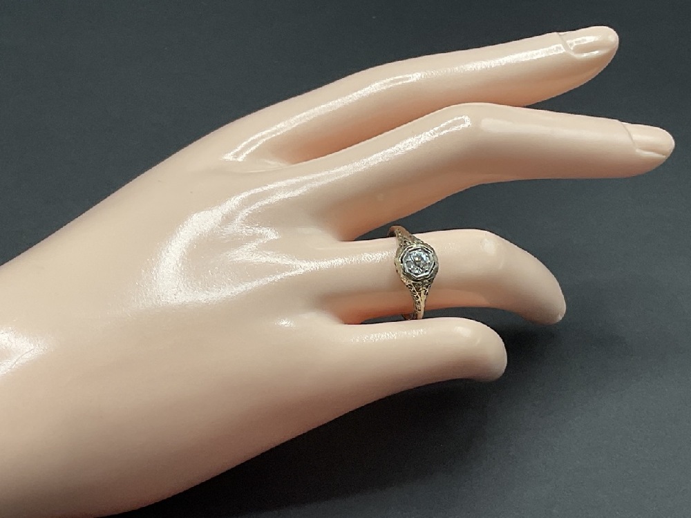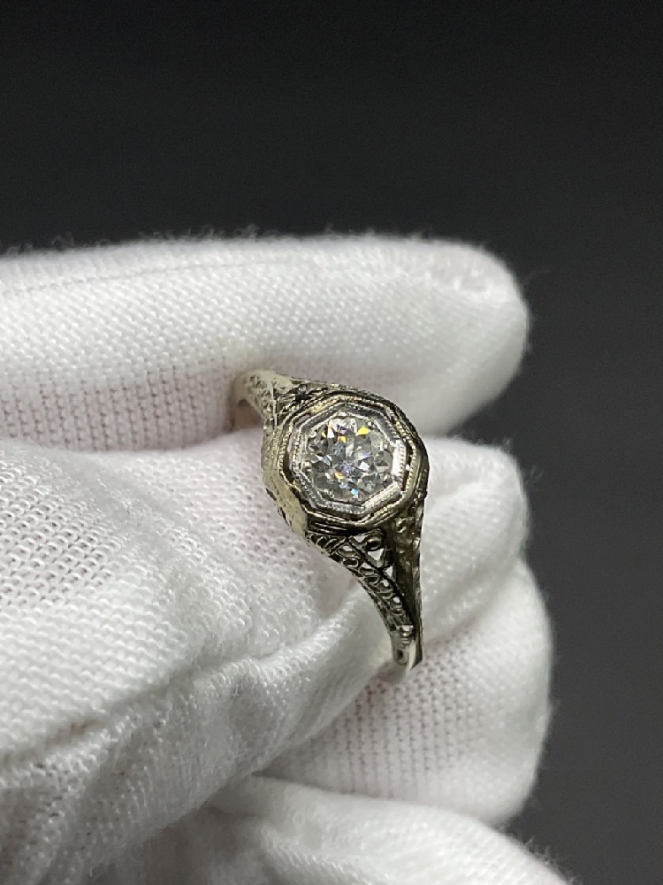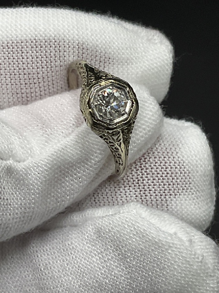 18K White Gold Lady's Diamond Engagement Ring. Fine setting with round mine cut diamond.