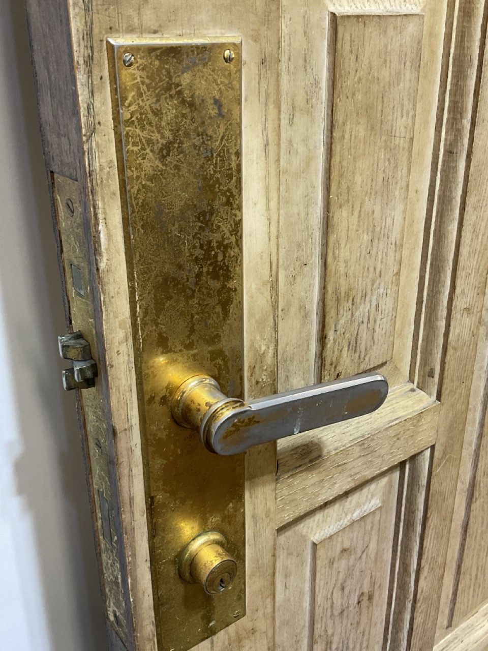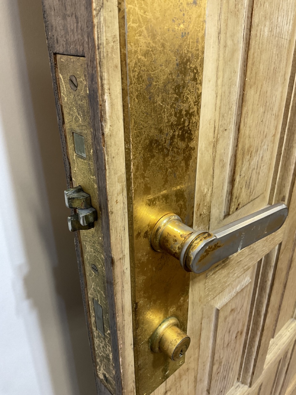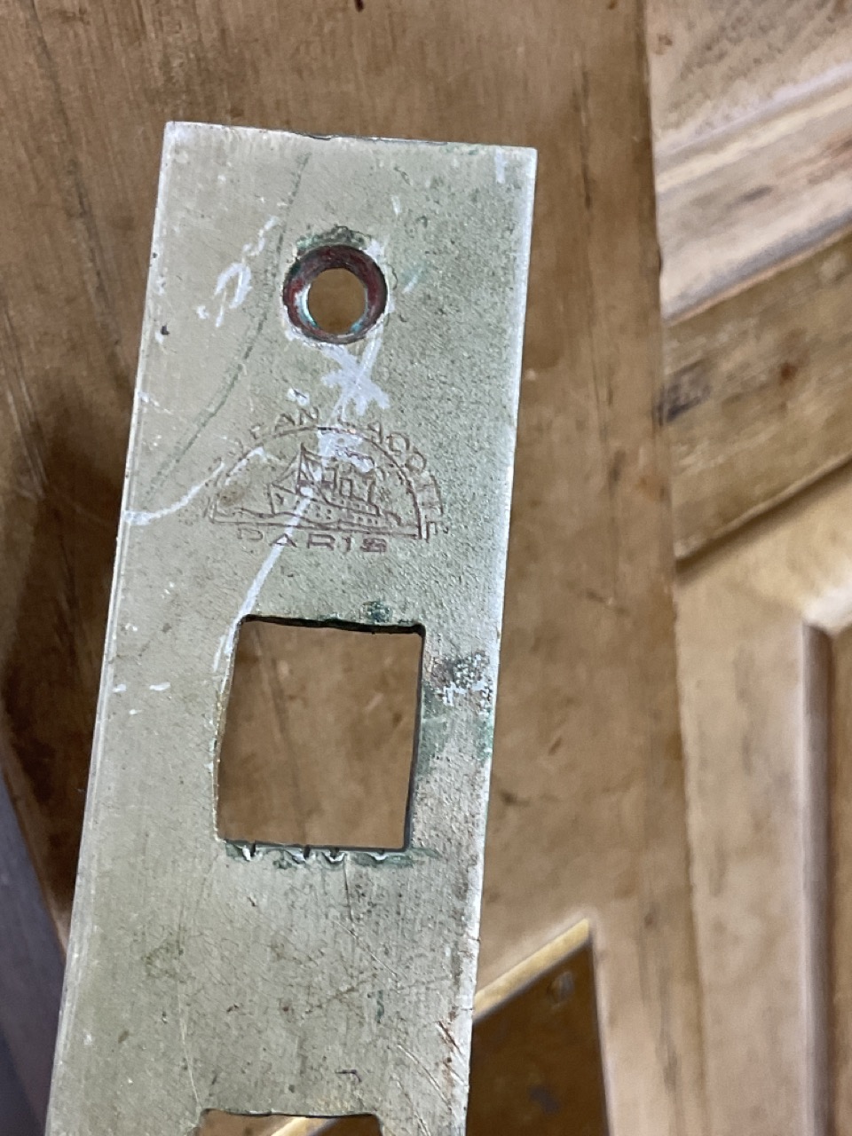 Art Deco gold plated handles and hardware. Door plate signed Jean Lacotte, Paris.