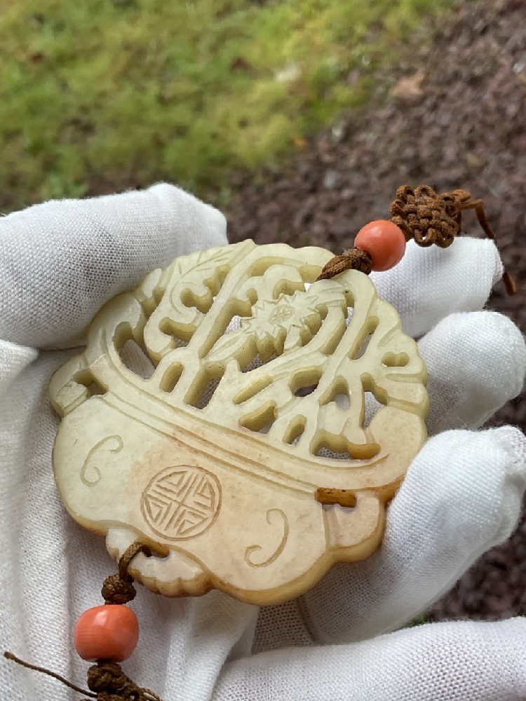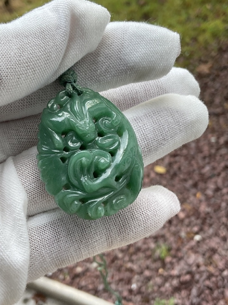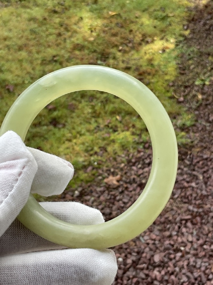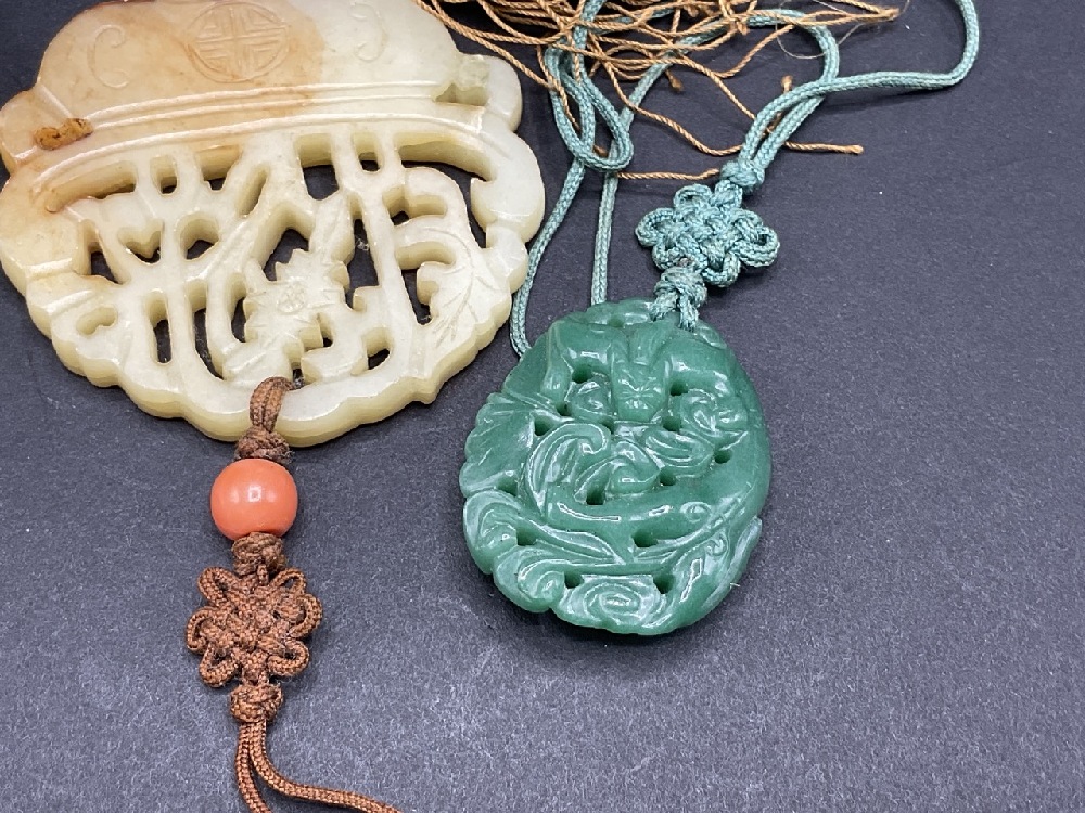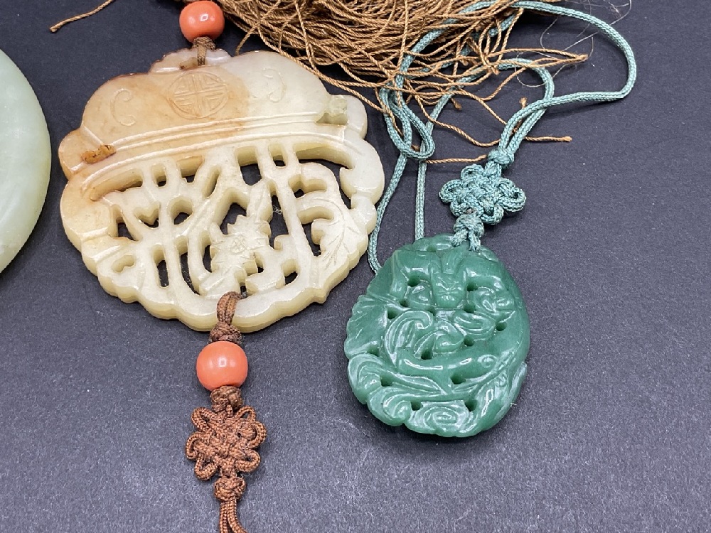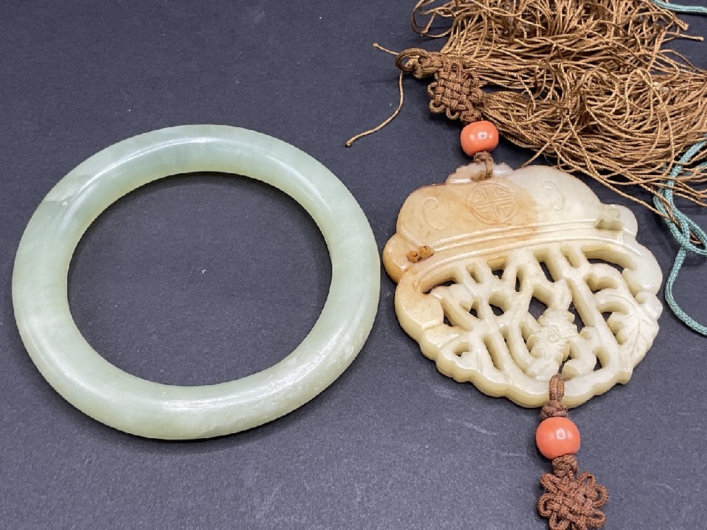 Three (3) Chinese Jade Estate Objects. Green jade bangle, carved jade disc fob with tassel and carved green jade pendant.