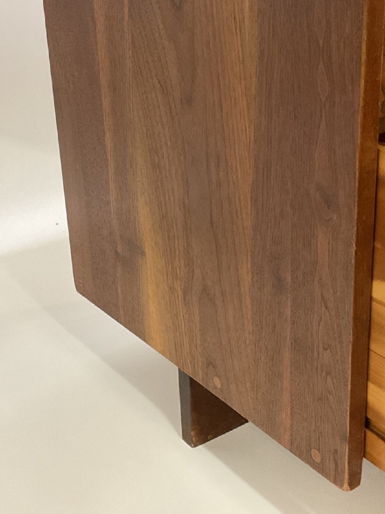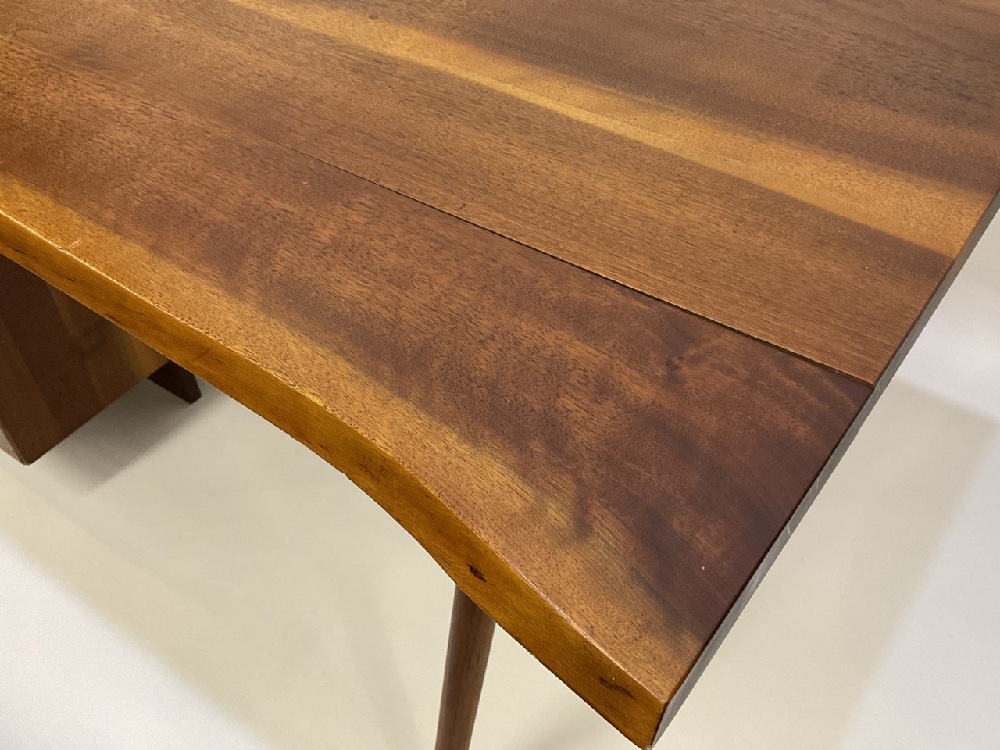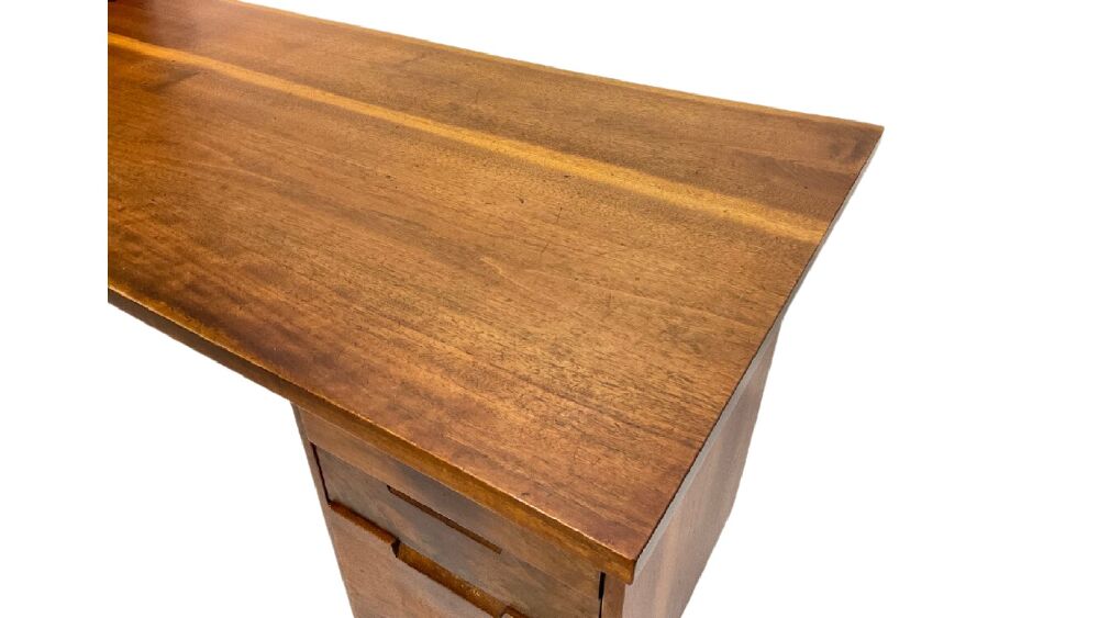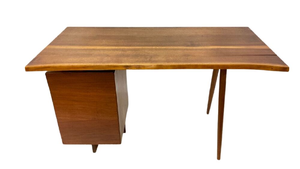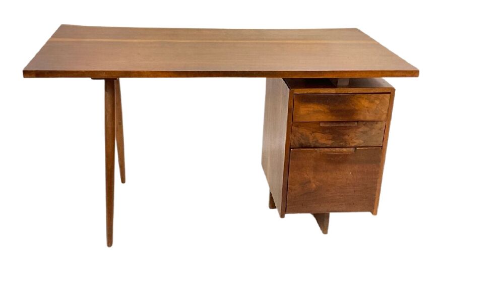 George Nakashima hand made desk in walnut set on two spindle style straignt legs and stack of three drawers. Original owners. The desk is overall in good condition with some minor wood separation. Bottom drawer has replacement slide on left side interior. See photograph preview. Desk was lightly dusted for photograph. No cleaning or restoration done. Original finish.