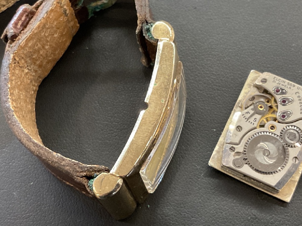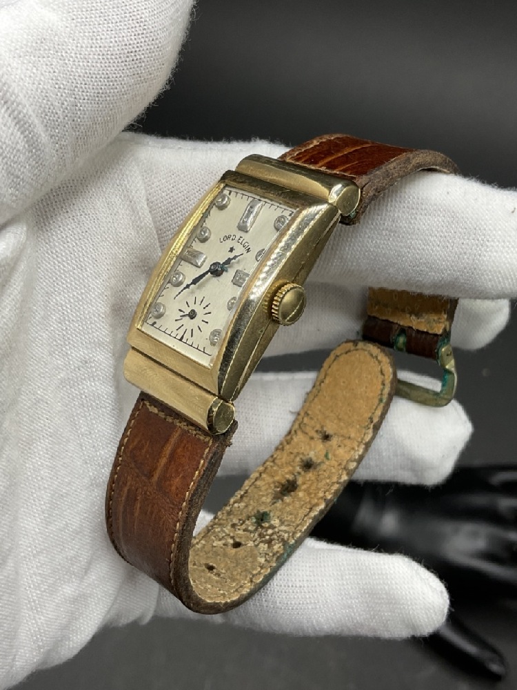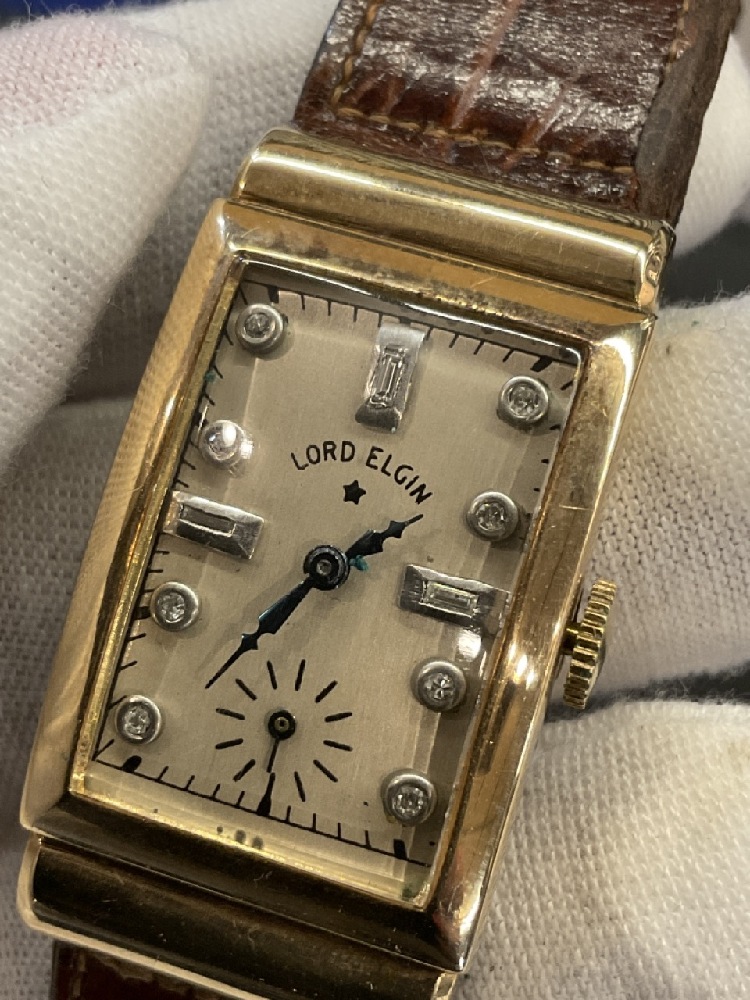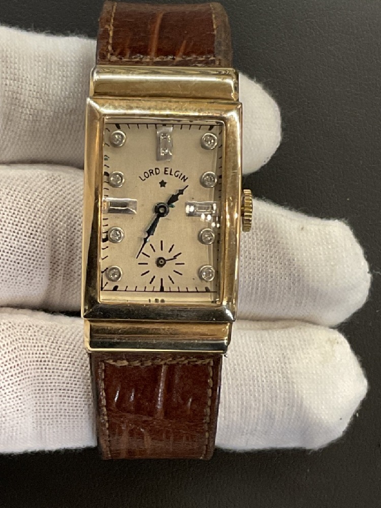 Lord Elgin 14K Gold and Diamond Vintage Tank Style Wristwatch.
