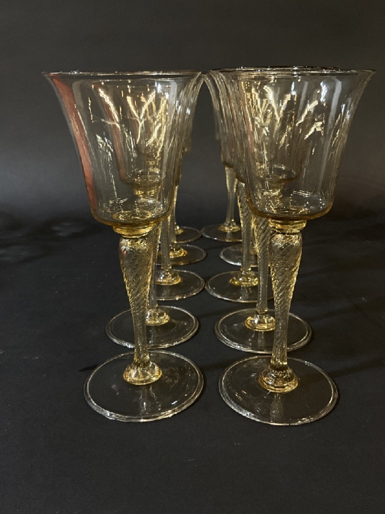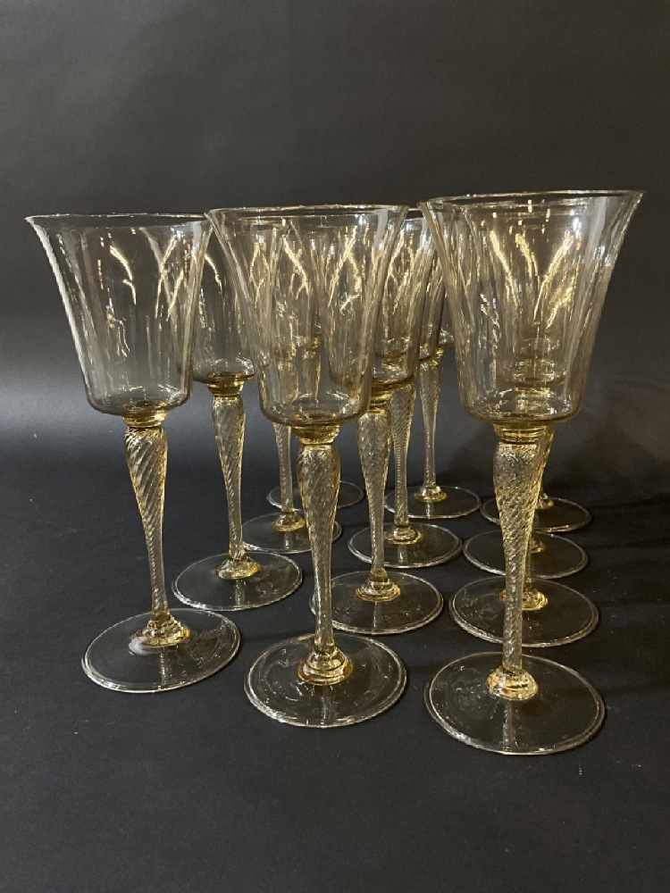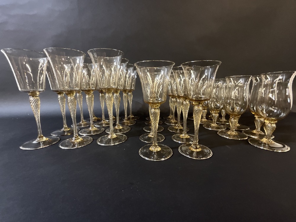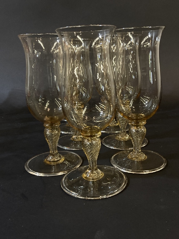 Venetian Amber colored glass matching wine goblets with air twist stems