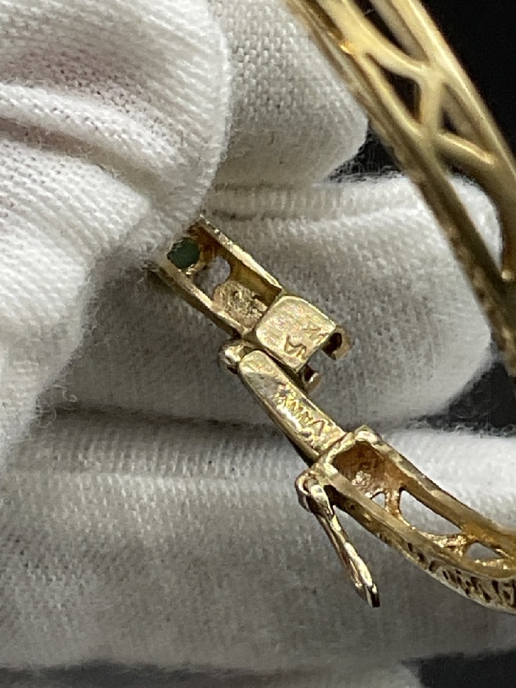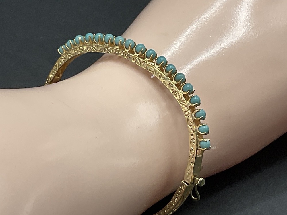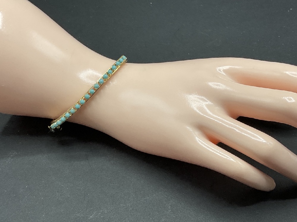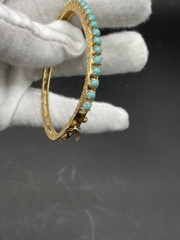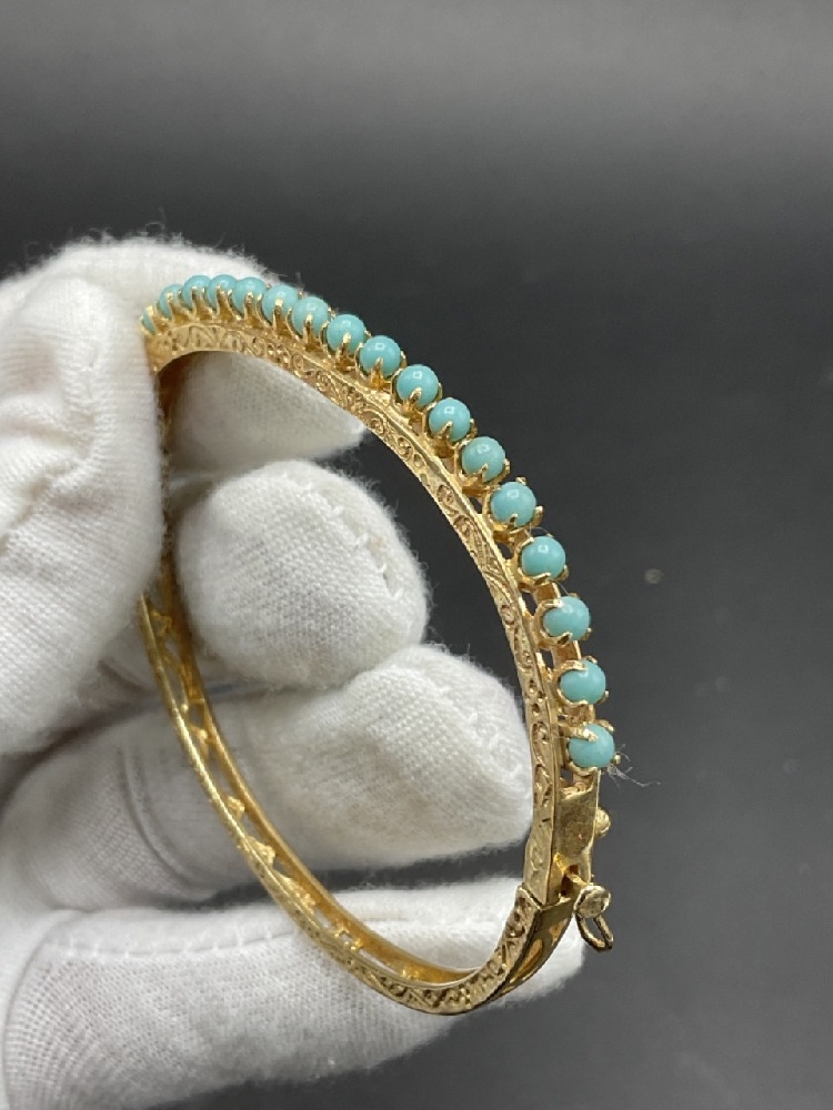 14K Persian Turquoise Hinged Yellow Gold Bracelet with eighteen (18)turquoise stones.