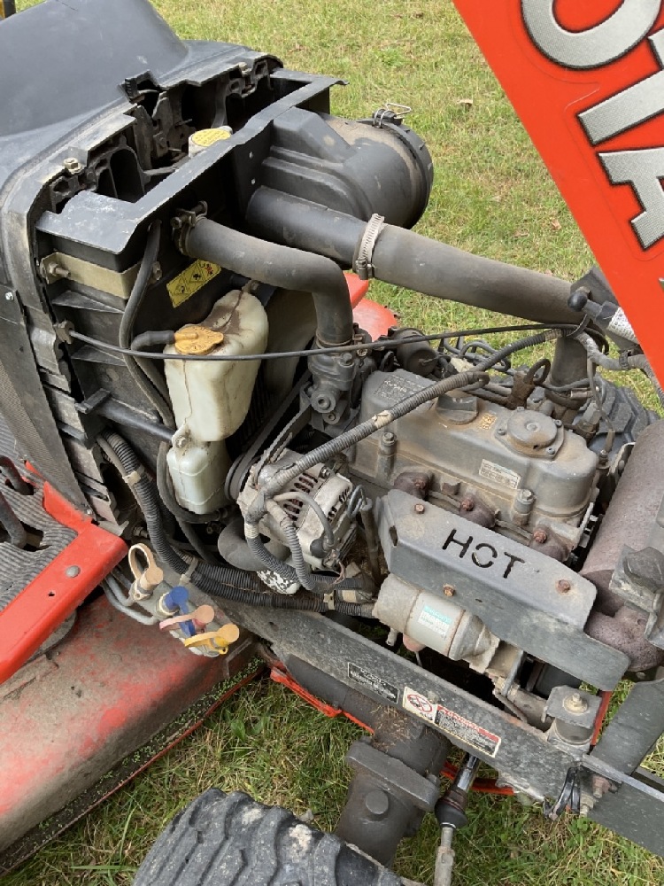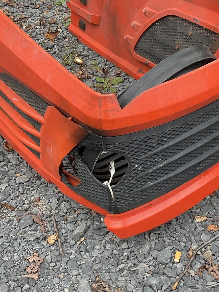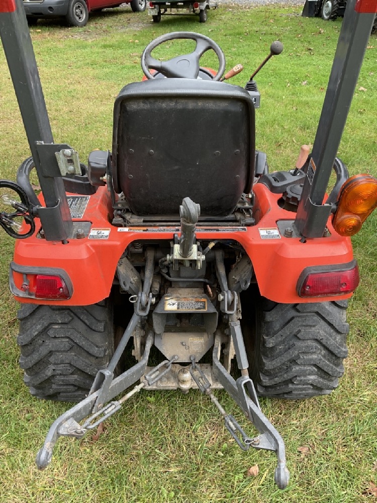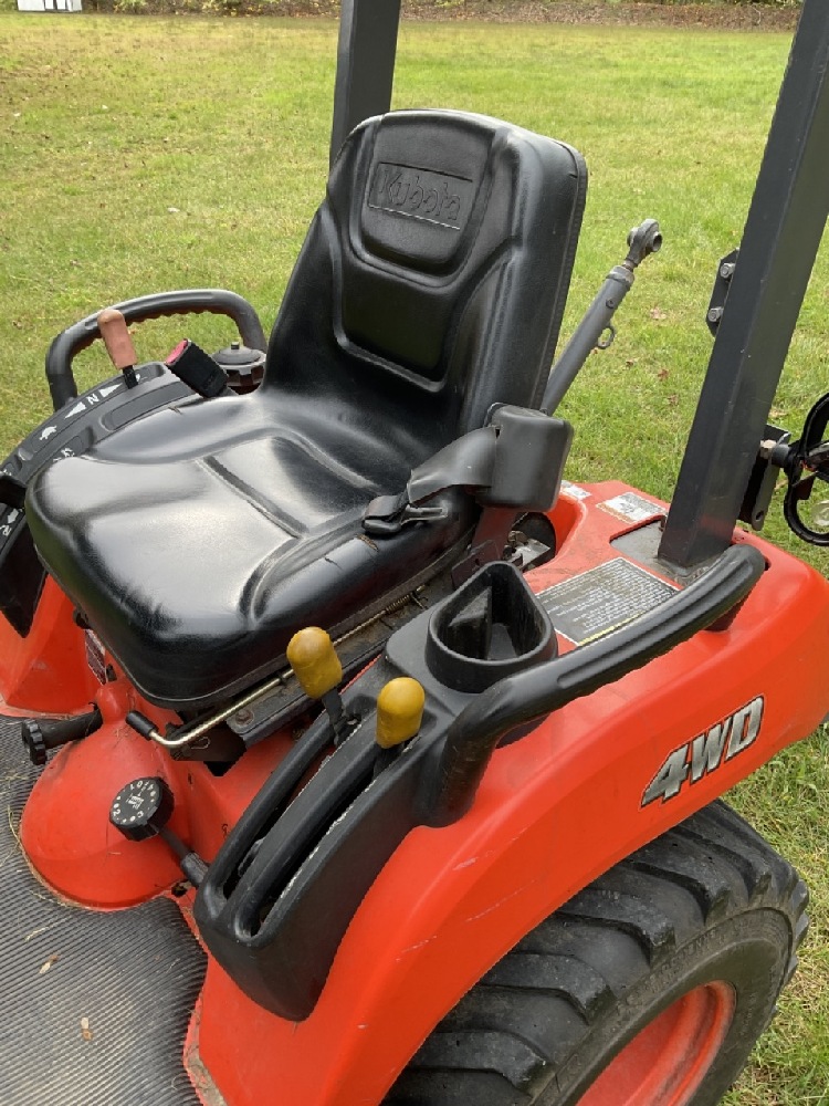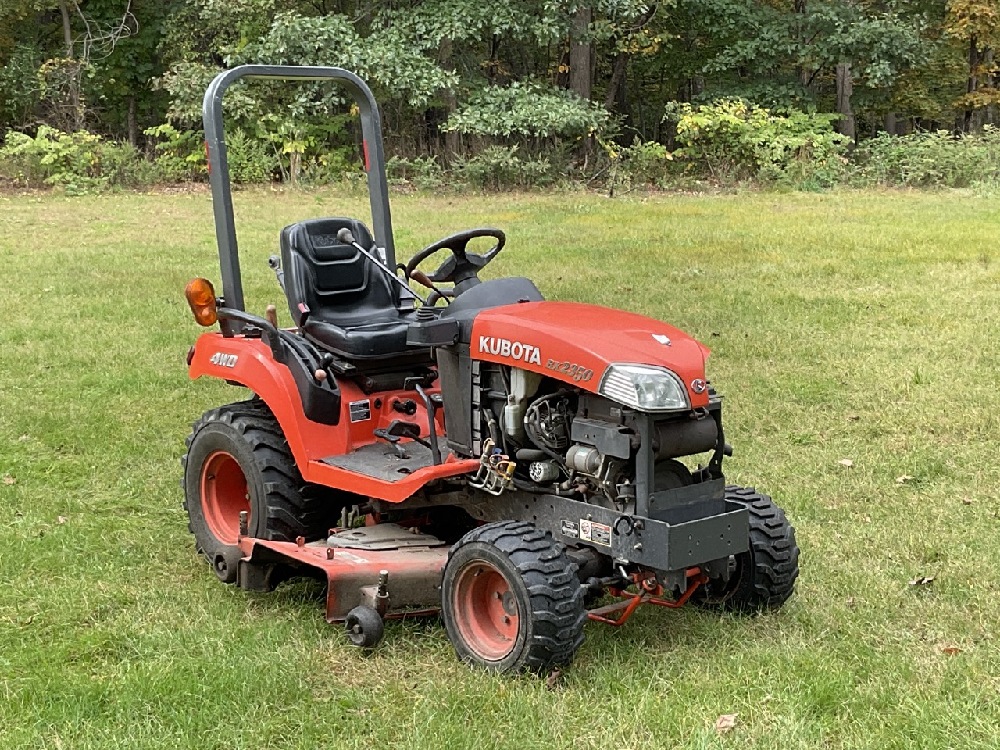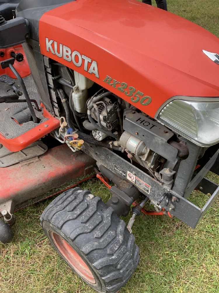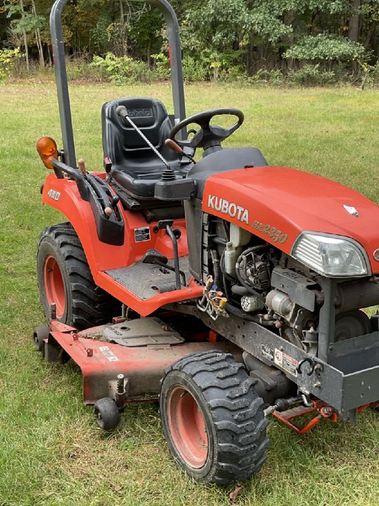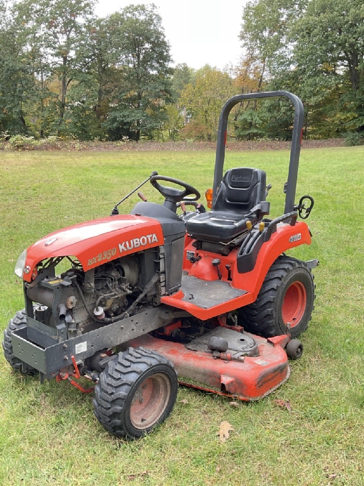 Kubota BX2350 Diesel Garden Tractor 4WD With Cutting Deck. Tractor is running very good. Rear PTO 3 Point Hitch. Some body damage noted and cospetic repairs needed. Missing headlight, panel damage, deck wheel needs repair.