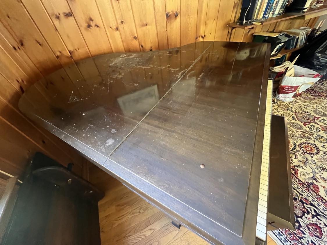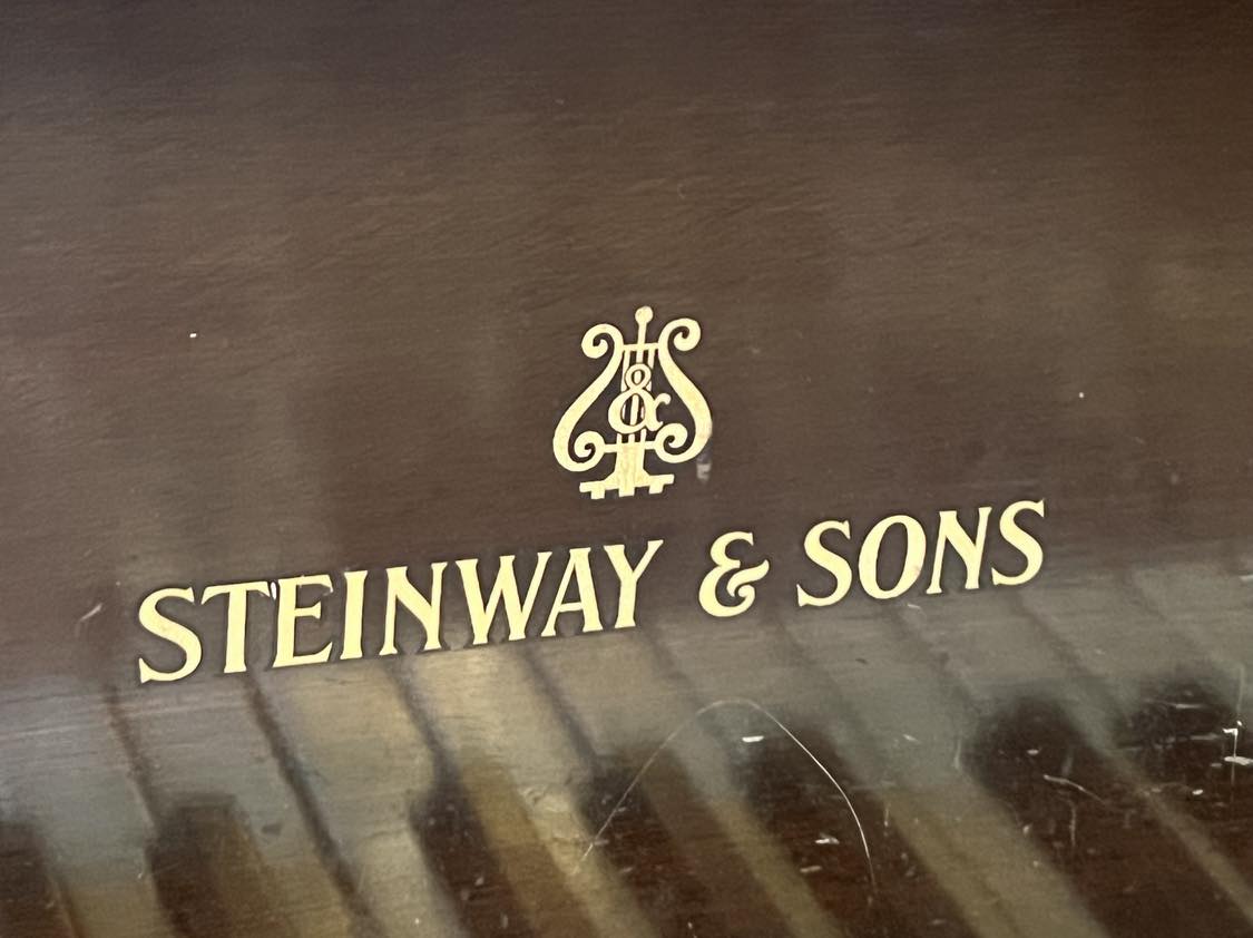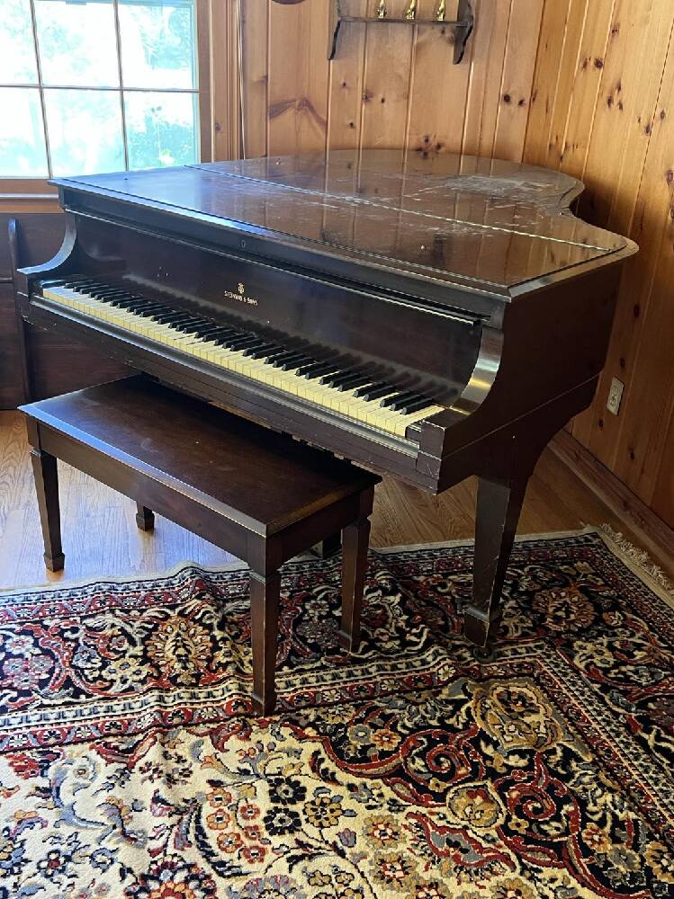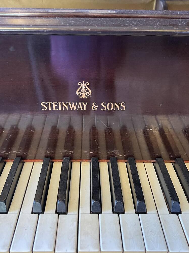 Steinway Model M Baby Grand Piano. Some keys appearing a loose or sticking. Top of piano has old water staining presumably from plant.