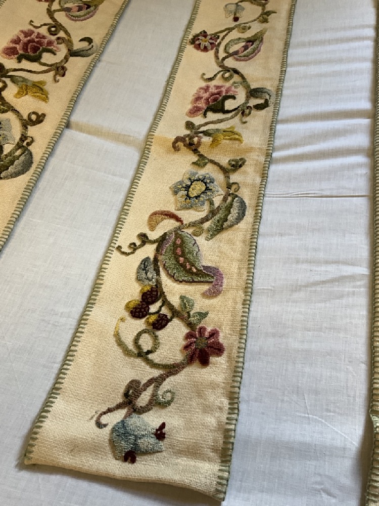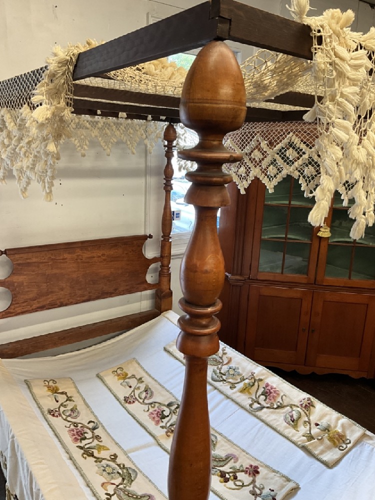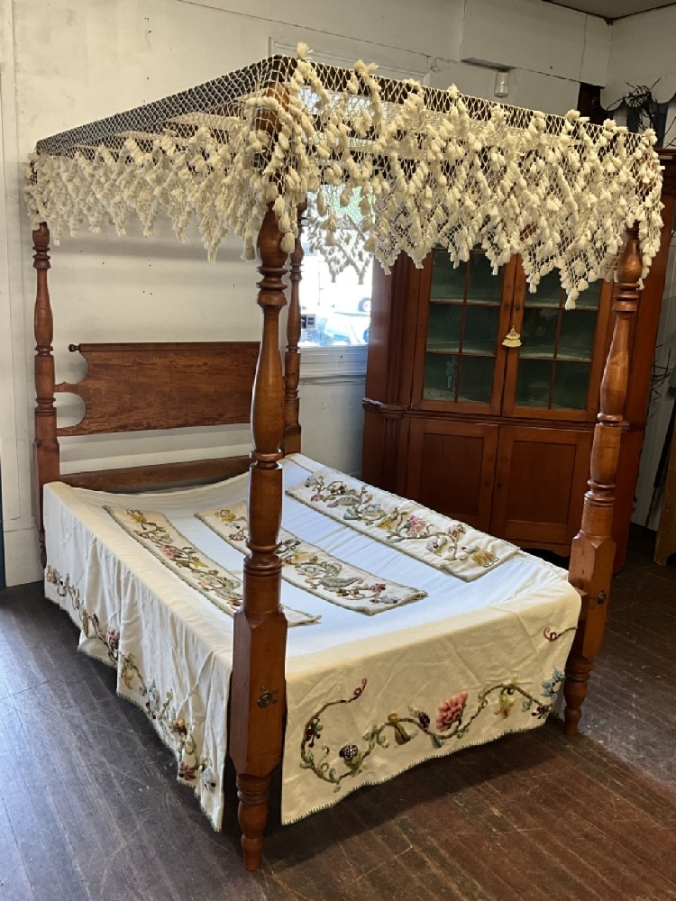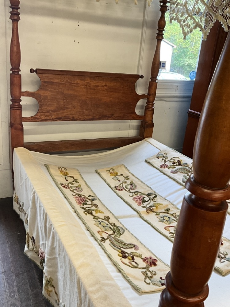 Antique Four (4) Poster Canopy Bed with Crewel work window treatments and bed skirt. Veil for top of bed
