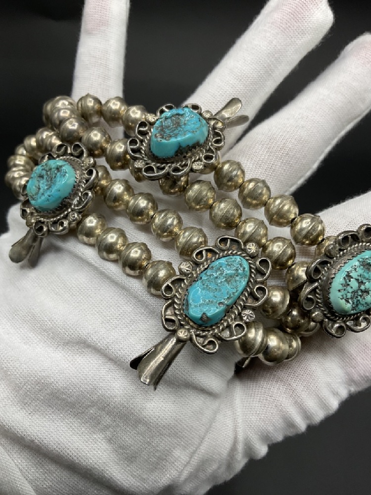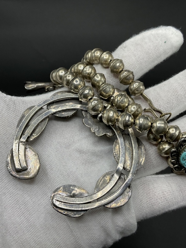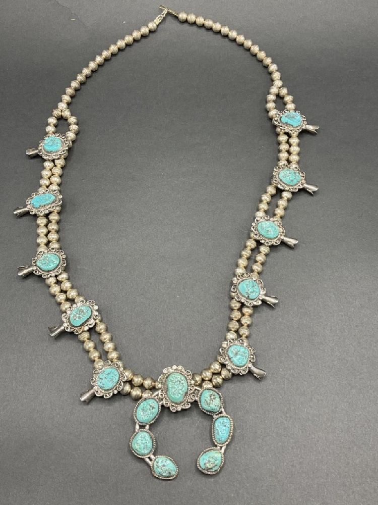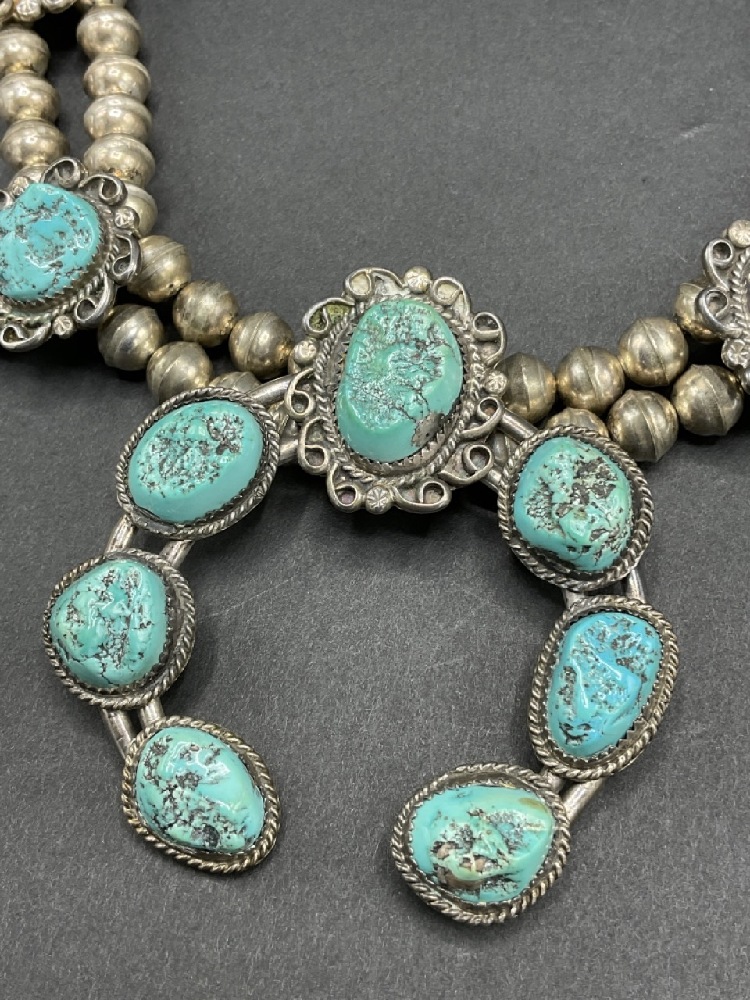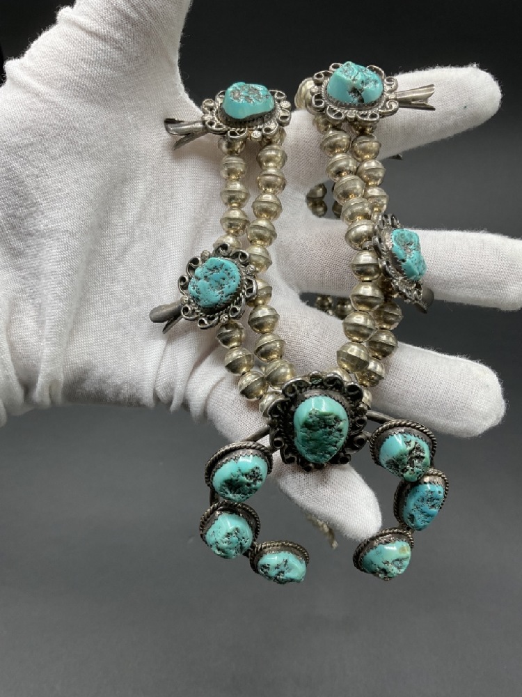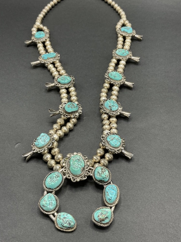 Vintage American Indian Silver and Turquoise Squash Blossom Necklace.