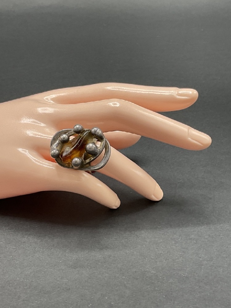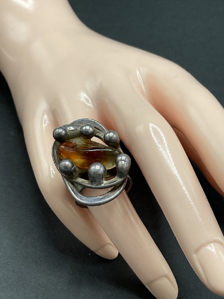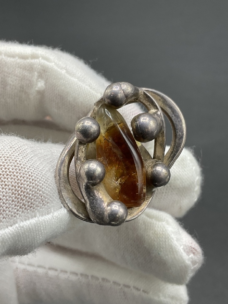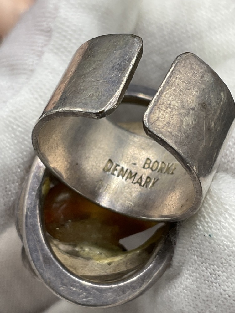 Borke signed Denmark Mid Centuryb Modern designed ring. Sterling silver with amber stone.