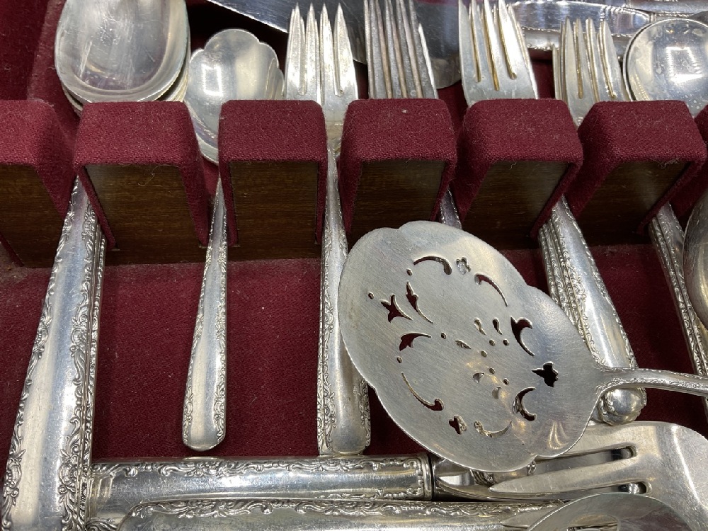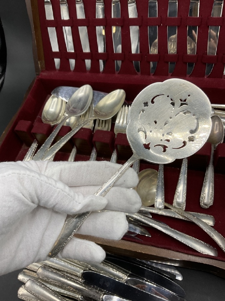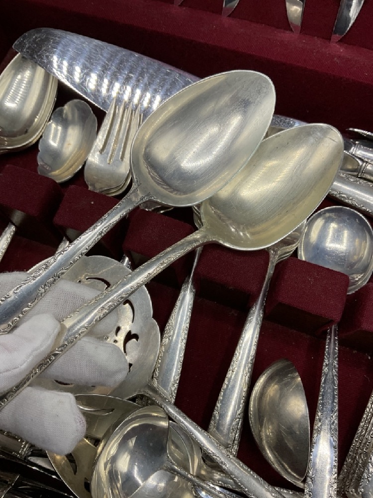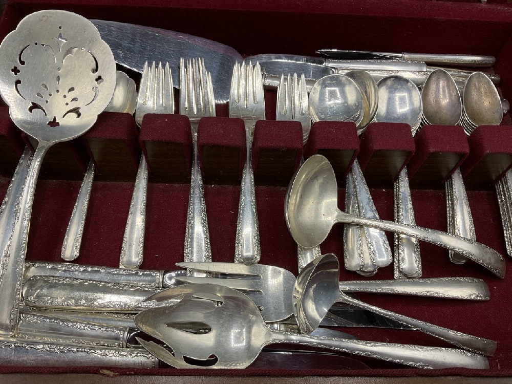 Service incomplete: Including 2 Dinner forks, 14 salad forks, 1 large serving fork, 4 large serving spoons, 1 large slotted serving spoon, 1 large slotted server, 1 ruffled edge serving spoon, 2 ladels 11 soup spoons, 13 teaspoons, 1 pie server and 38 assorted knives.