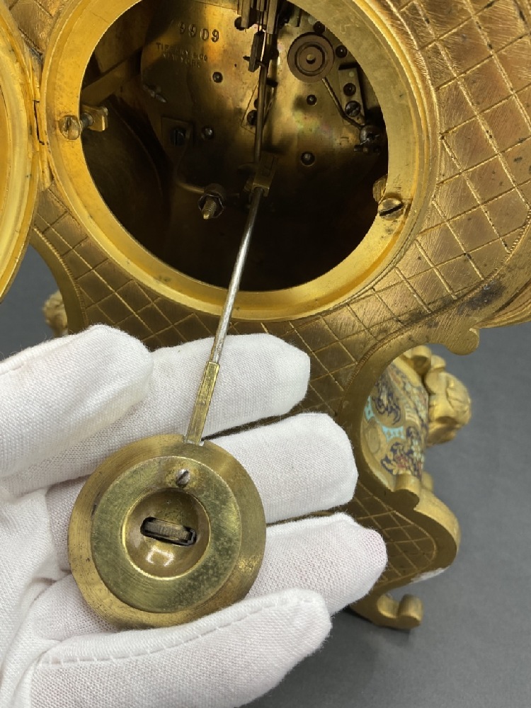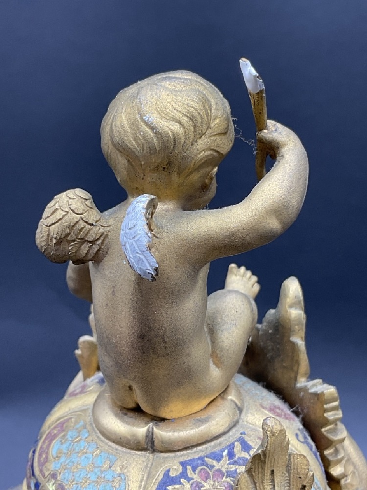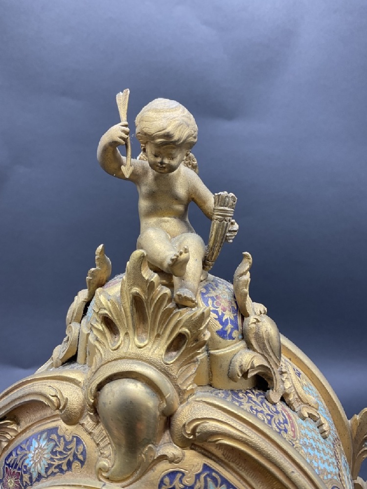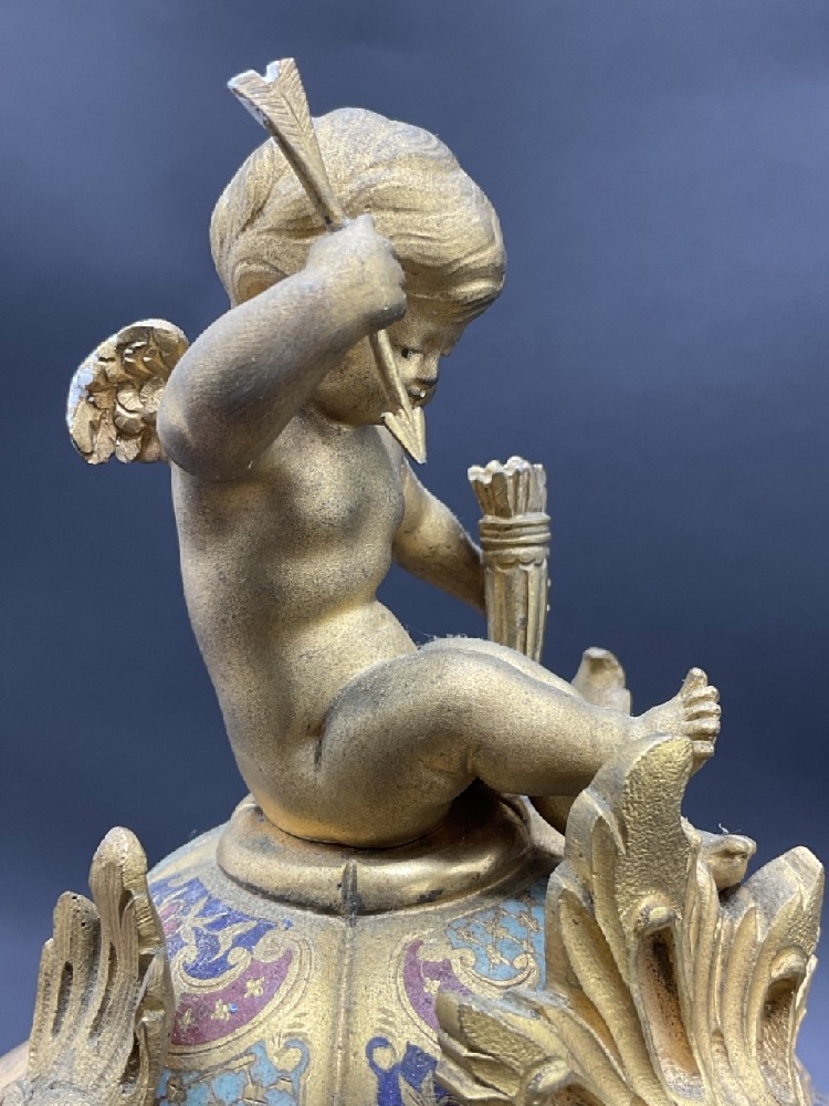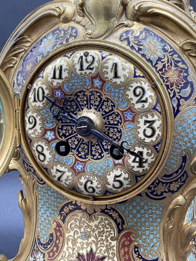 A Tiffany and Company French Champleve Enameled Clock w/ Cupid. Signed at face of clock and clock workings verso. French manufacturer. Very good condition.