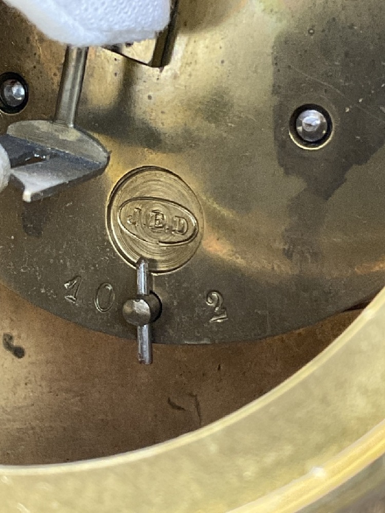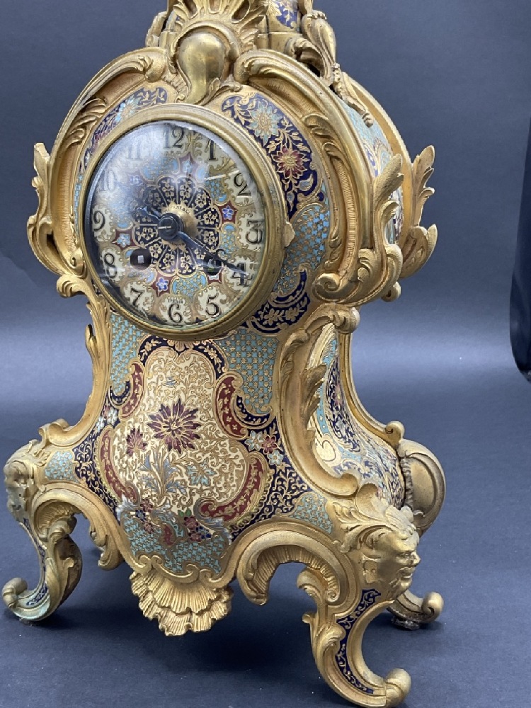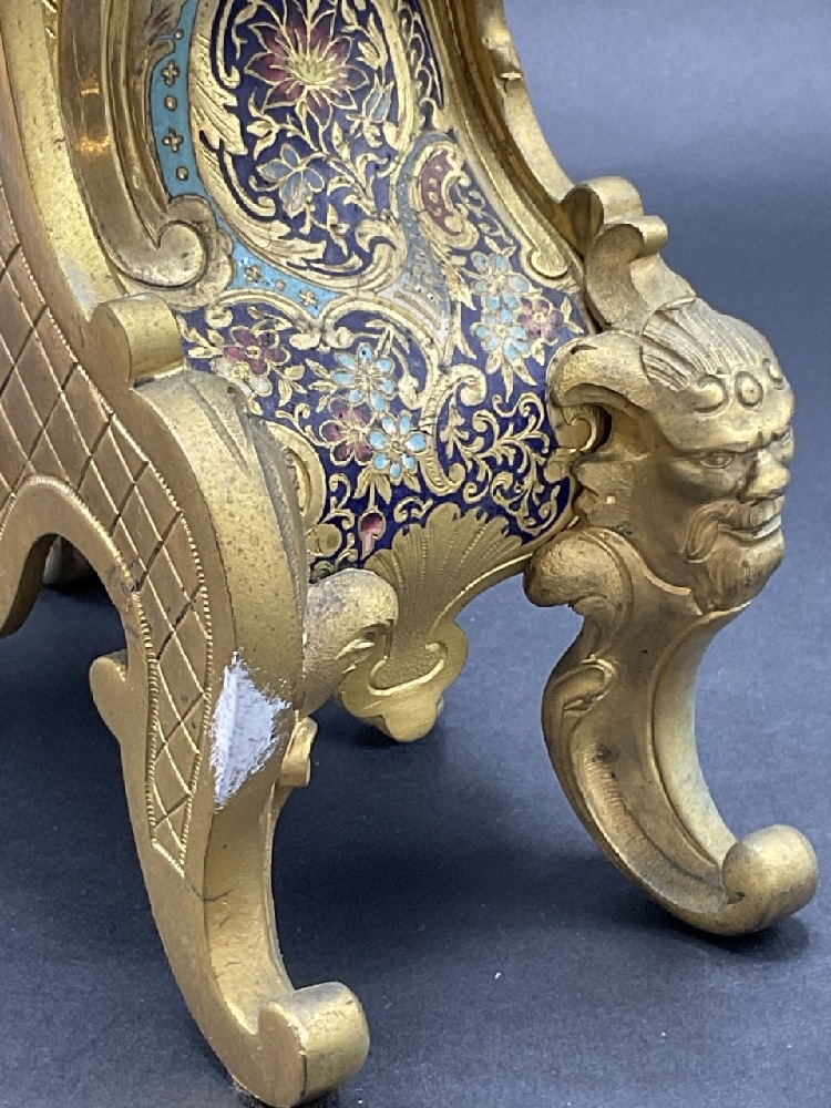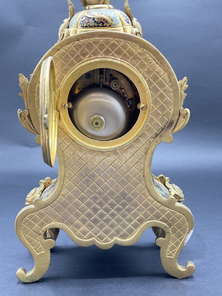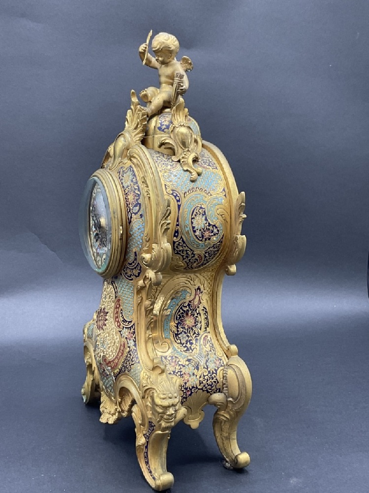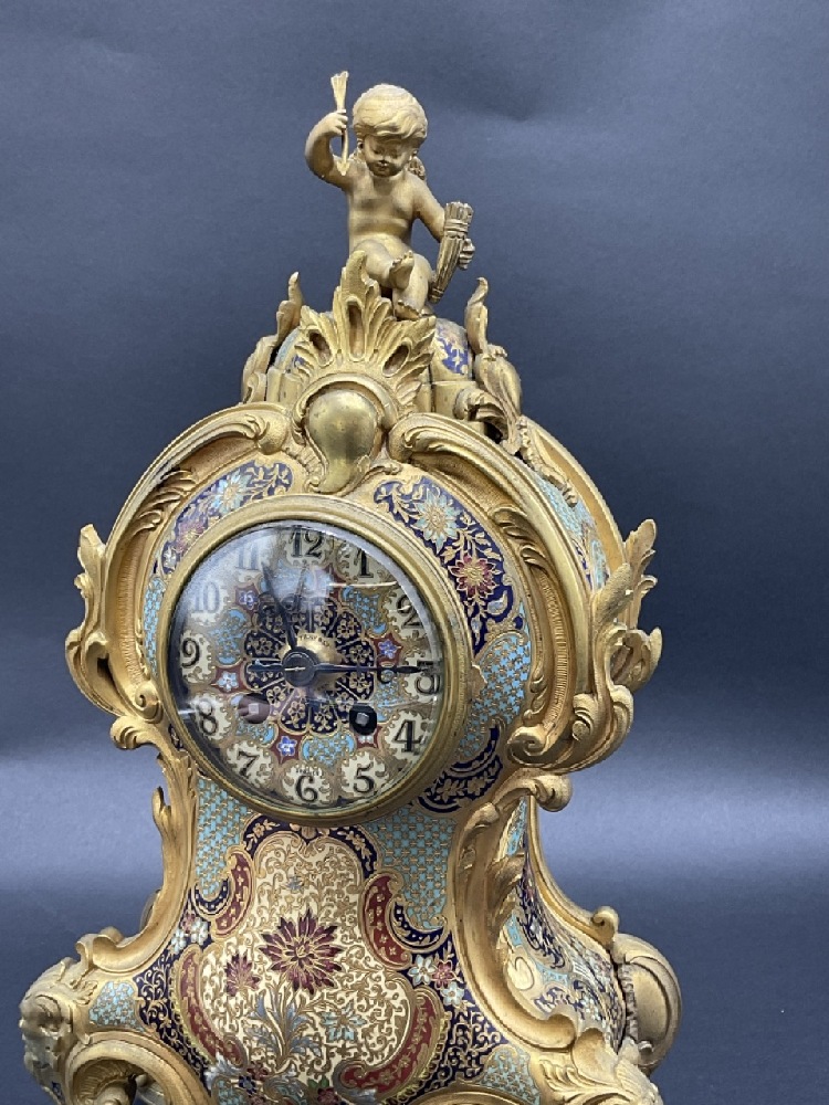 A Tiffany and Company French Champleve Enameled Clock w/ Cupid. Signed at face of clock and clock workings verso. French manufacturer. Very good condition.