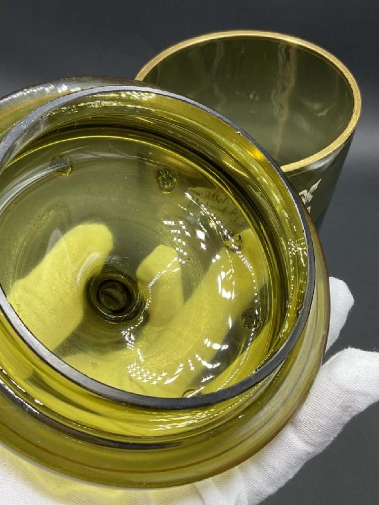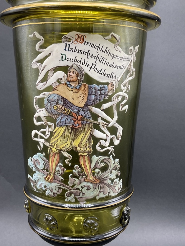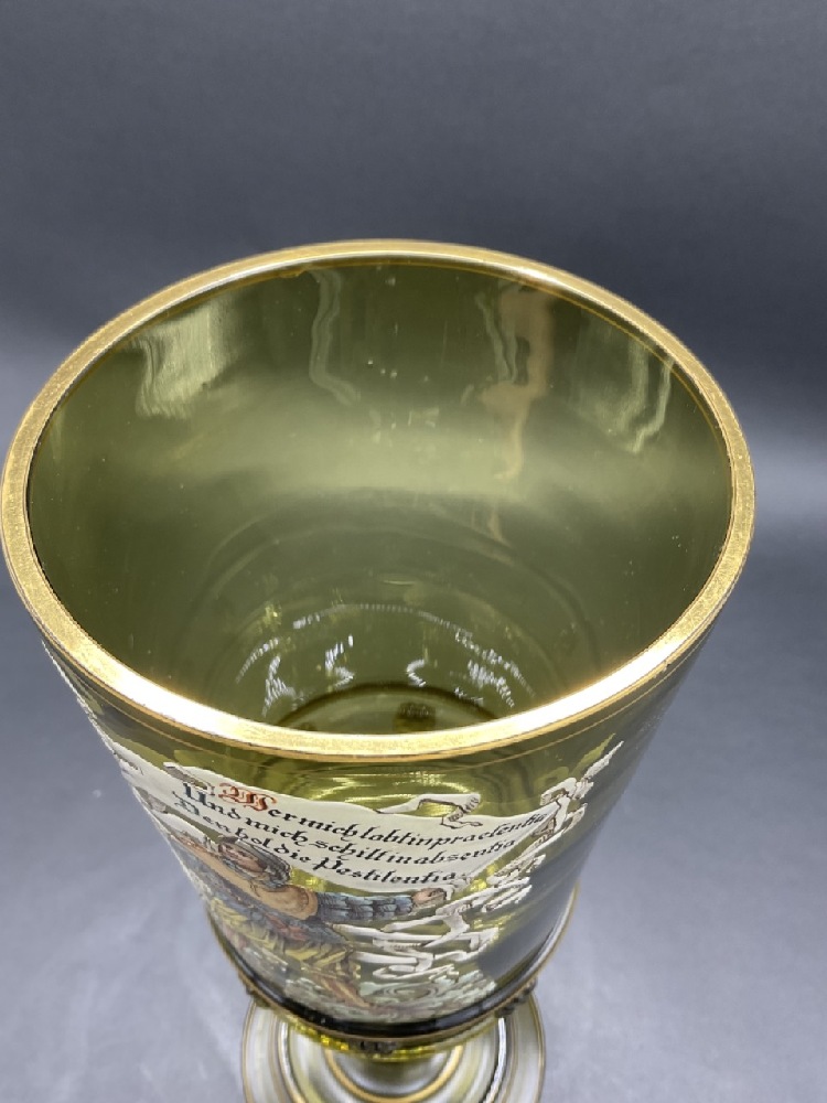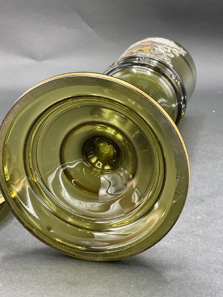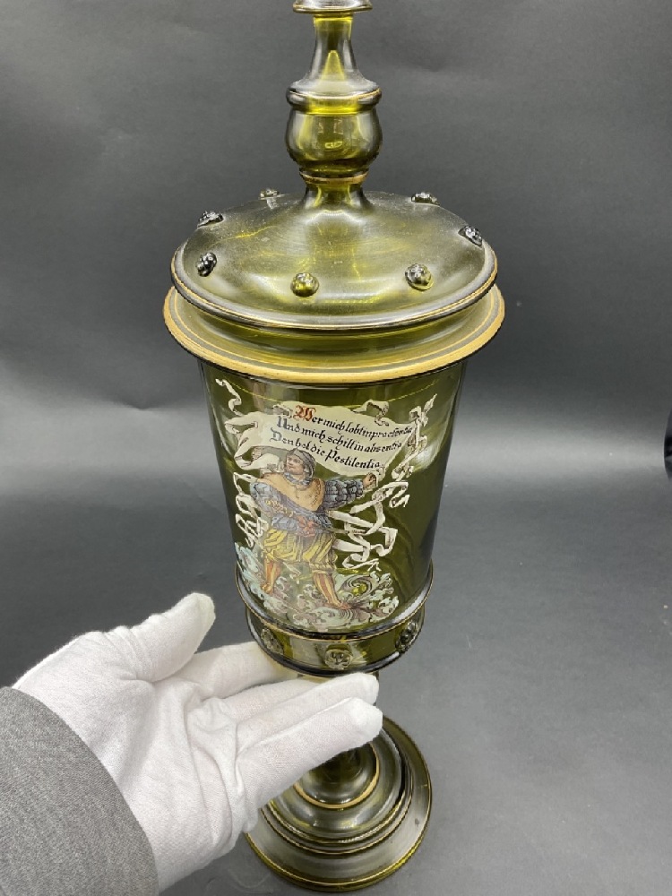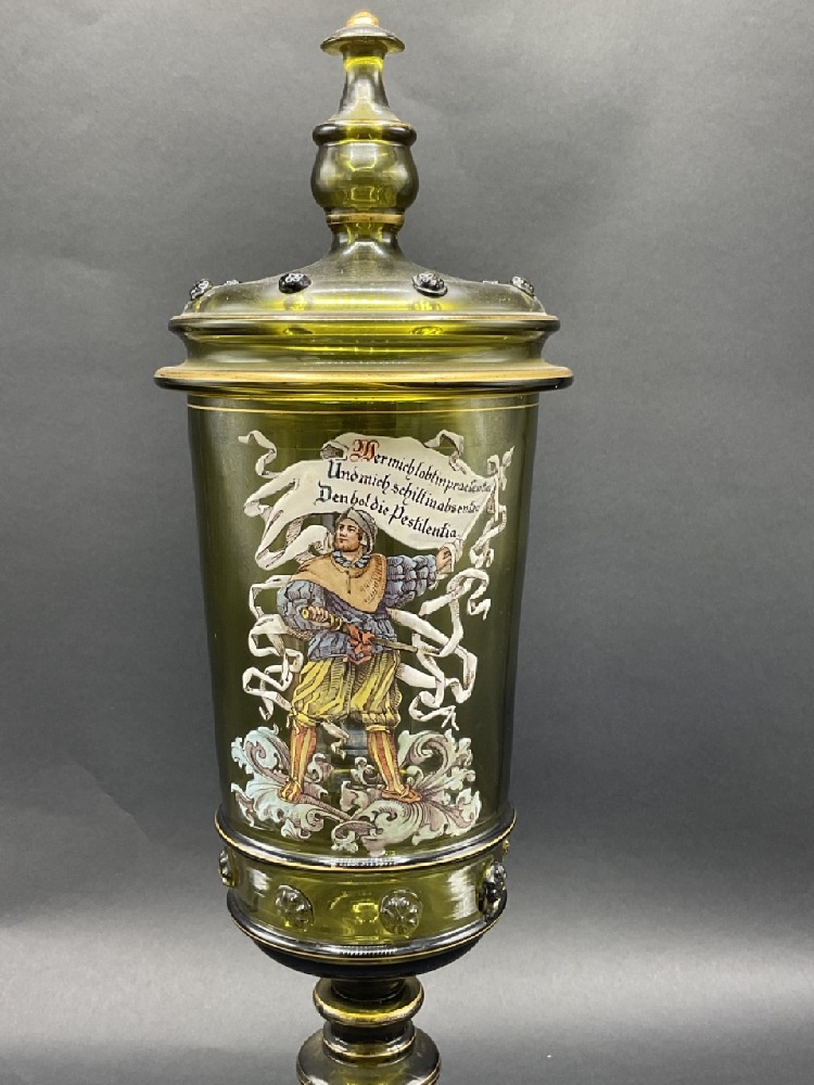 German Enameled Olive Green Glass Lidded Pokal