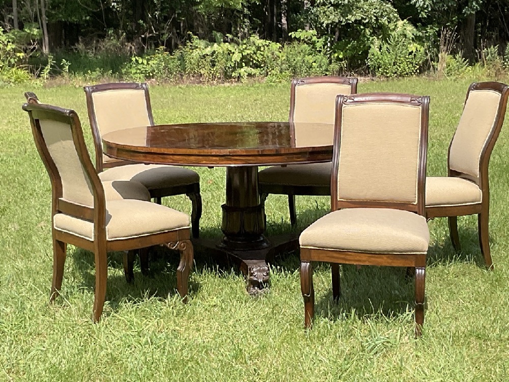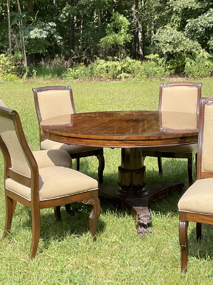 Set of six (6) mahogany upholstered chairs with 19th century round mahogany wine tasting style pedestal table. Dimensions: 31 1/2"h X 20" and 27 1/2" X 53" diameter (table)